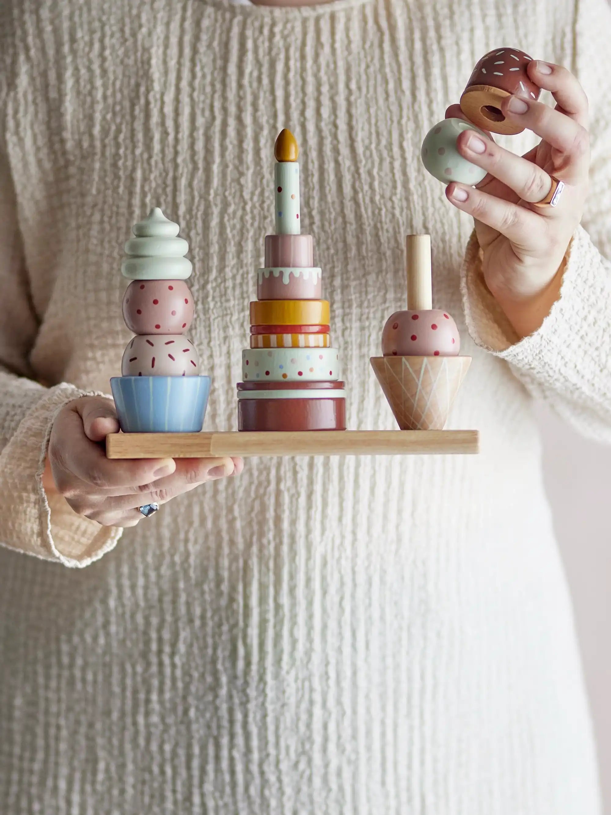 Maak van het stapelen een spelletje: tel samen de lagen, noem de kleuren en wissel taart en ijs af. Geef de toren een plekje op een plank als er niet mee gespeeld wordt—zo blijft alles netjes én vrolijk.