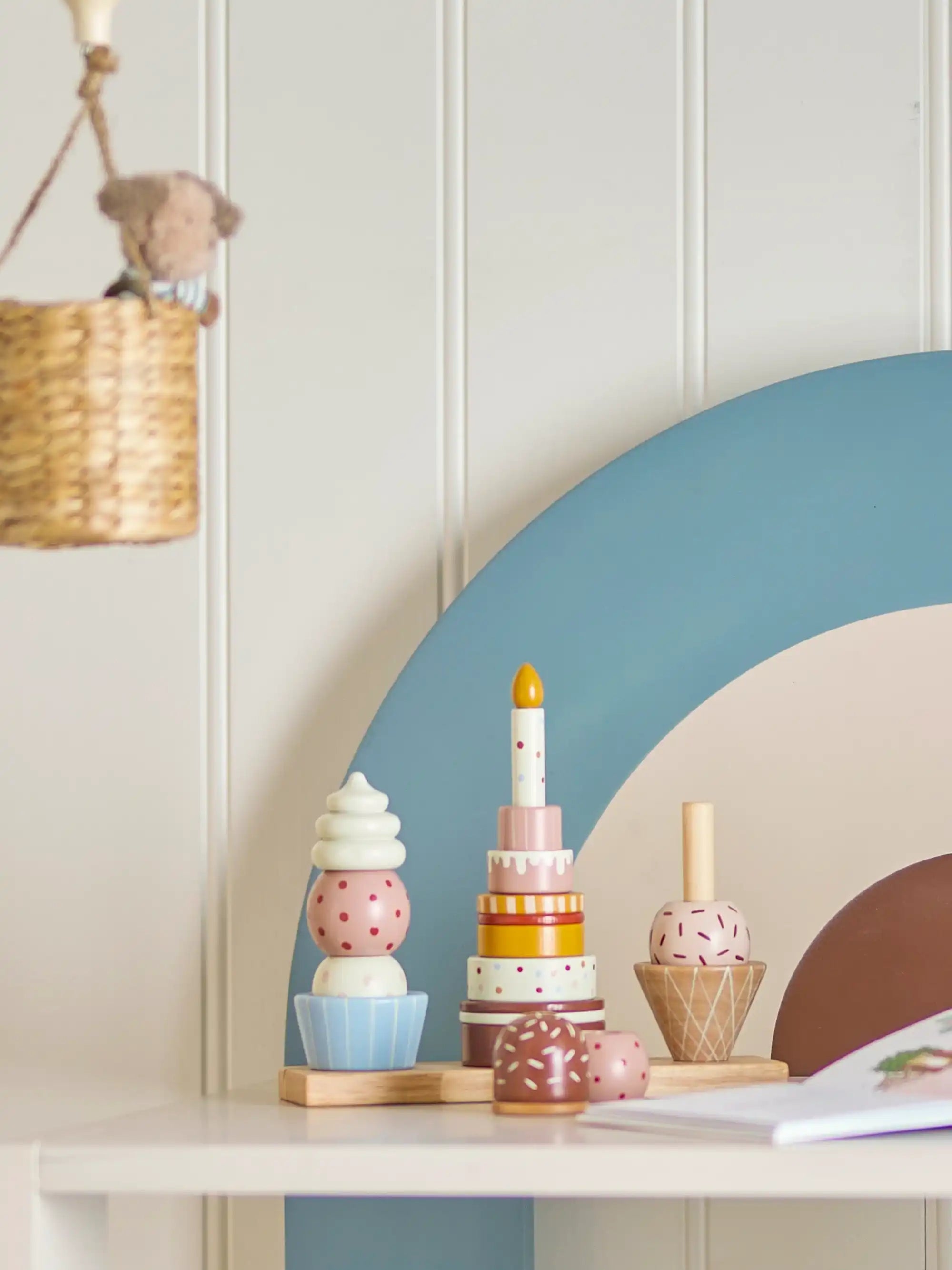 De Celebrate Activity Toy is een feestelijke stapeltoren in de vorm van taart en ijs. Door de zachte kleuren en ronde vormen wil je er meteen mee spelen. Je kunt stapelen, sorteren en fantaseren over verjaardagen van knuffels of zelf verzonnen traktaties. Elke laag heeft een eigen vorm, waardoor je telkens op een andere manier kunt bouwen. Als je kind er even niet mee speelt, staat de toren mooi op een plankje of kast in de kinderkamer. Zo maakt hij de kamer meteen gezellig en vrolijk. Het ontwerp past goed bij een rustige Scandinavische stijl, met een speelse knipoog.