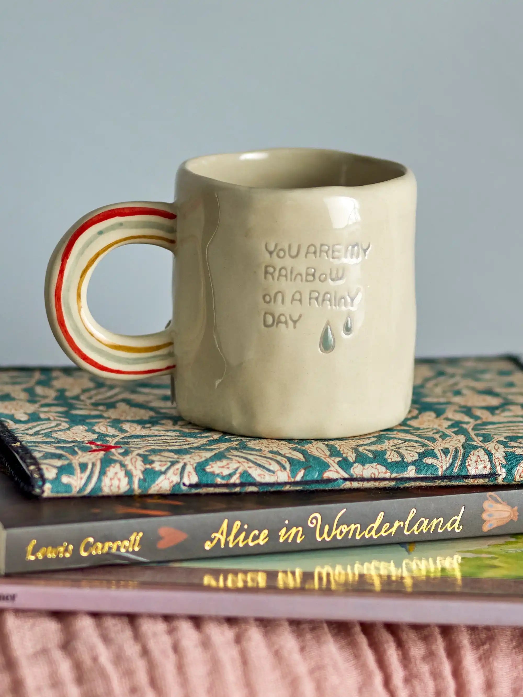Waarom jij deze mok van Bloomingville MINI wilt: Met de Cloudy mok begin je je dag met een glimlach. Het vrolijke regenboog-oor en de lieve tekst 'You are my rainbow on a rainy day' maken elk koffiemoment extra fijn. De mok voelt gezellig en zacht aan, zelfs als het buiten regent. Zoek je een lief cadeautje? Deze mok komt in een mooie cadeauverpakking, helemaal klaar om iemand blij te maken.