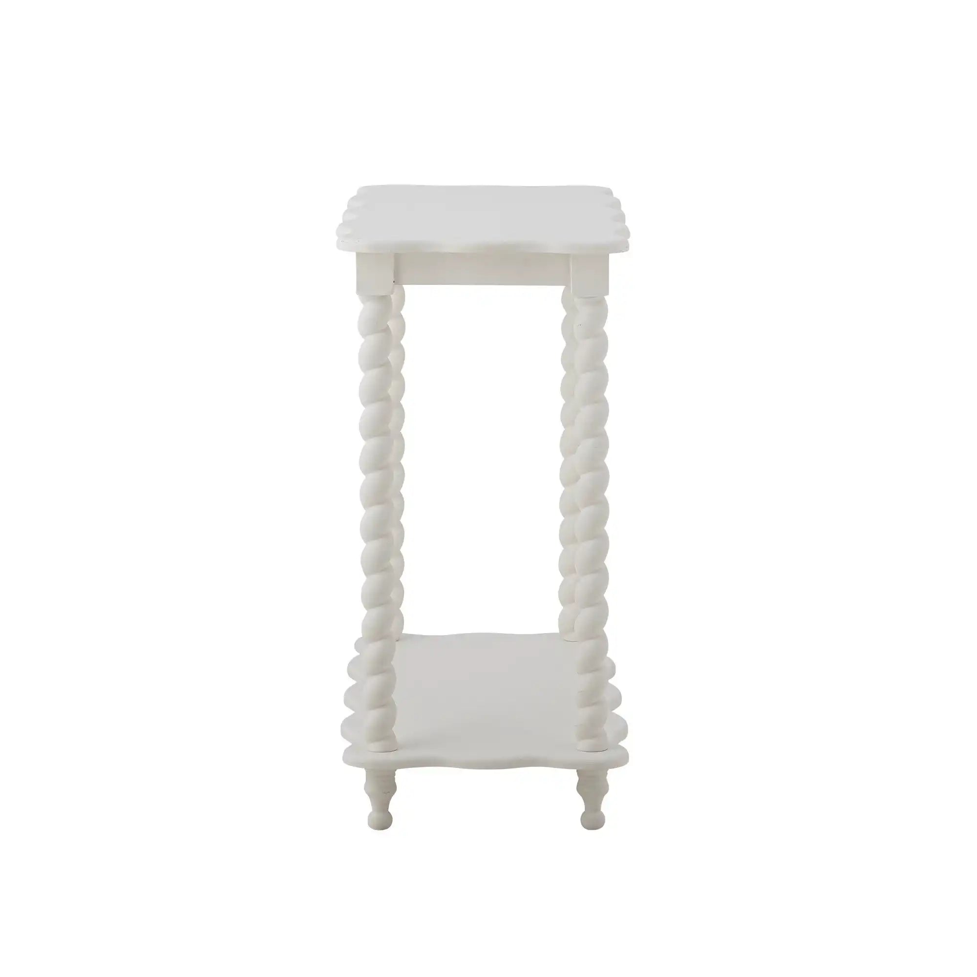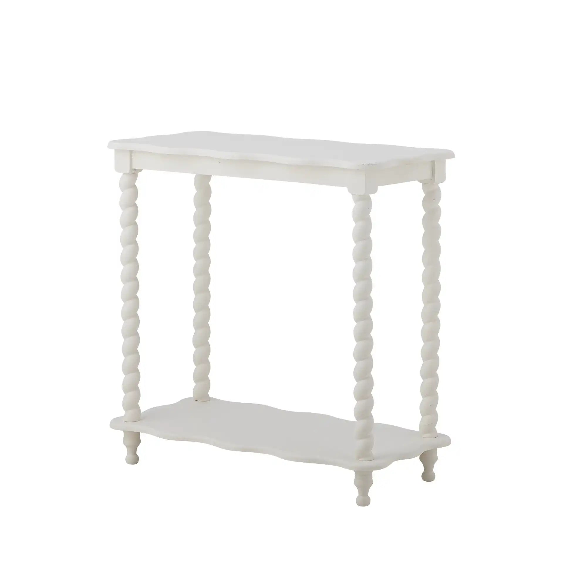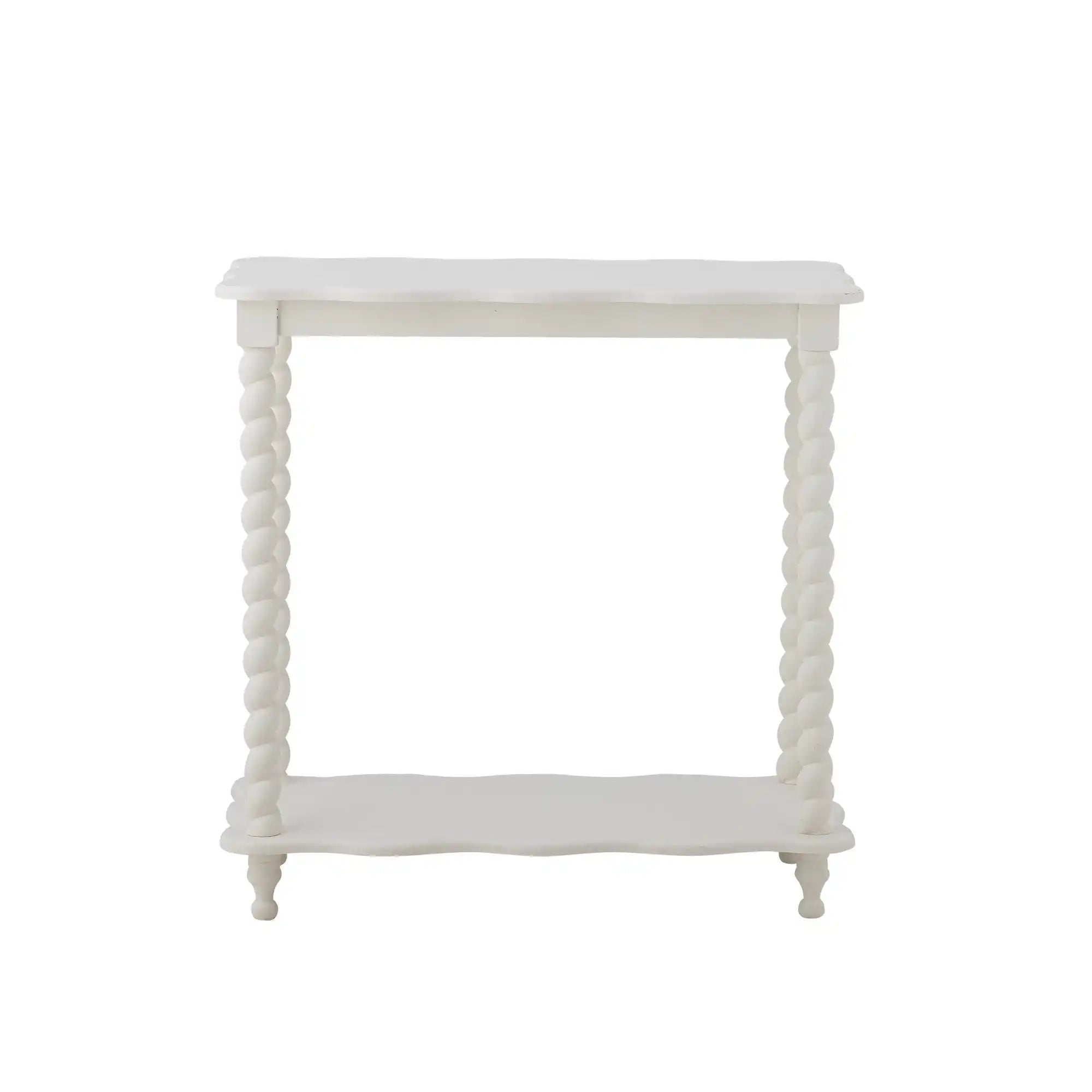 Details & materiaal: Gemaakt van MDF en grenen, met een egale witte afwerking die licht prachtig weerkaatst. De afgeronde hoeken en golvende lijnen zorgen voor een vriendelijke look en maken de tafel prettig in het dagelijks gebruik. De afmetingen b × h × d 30 × 60 × 60 cm bieden een gebalanceerd formaat: voldoende ruimte voor decoratie bovenop en praktische opbergplek op de onderste plank. De extra legplank geeft structuur aan je styling en houdt kleine spullen uit het zicht. De witte kleur maakt het eenvoudig om te combineren met andere materialen, van glas en keramiek tot textiel in zachte tinten.