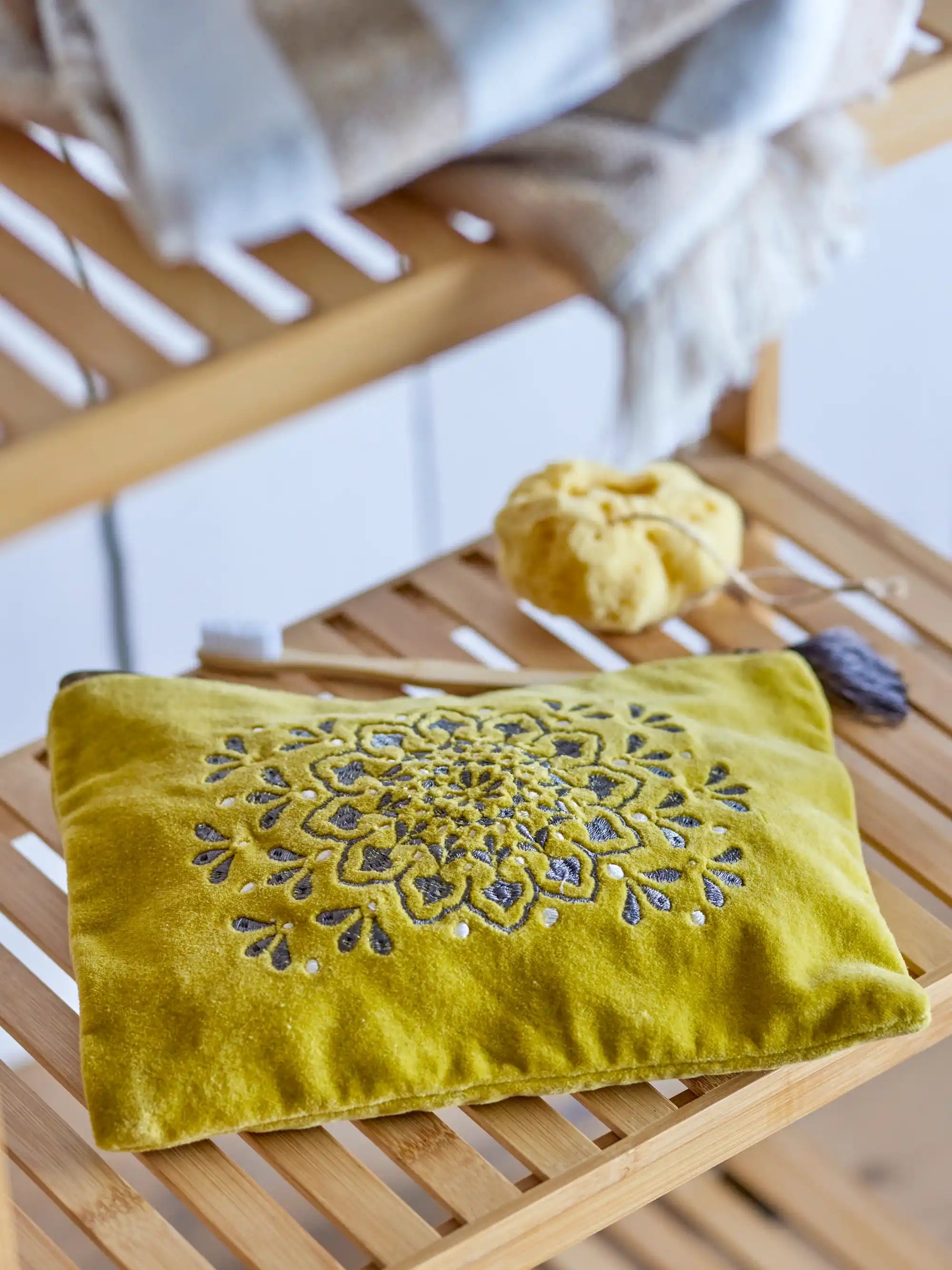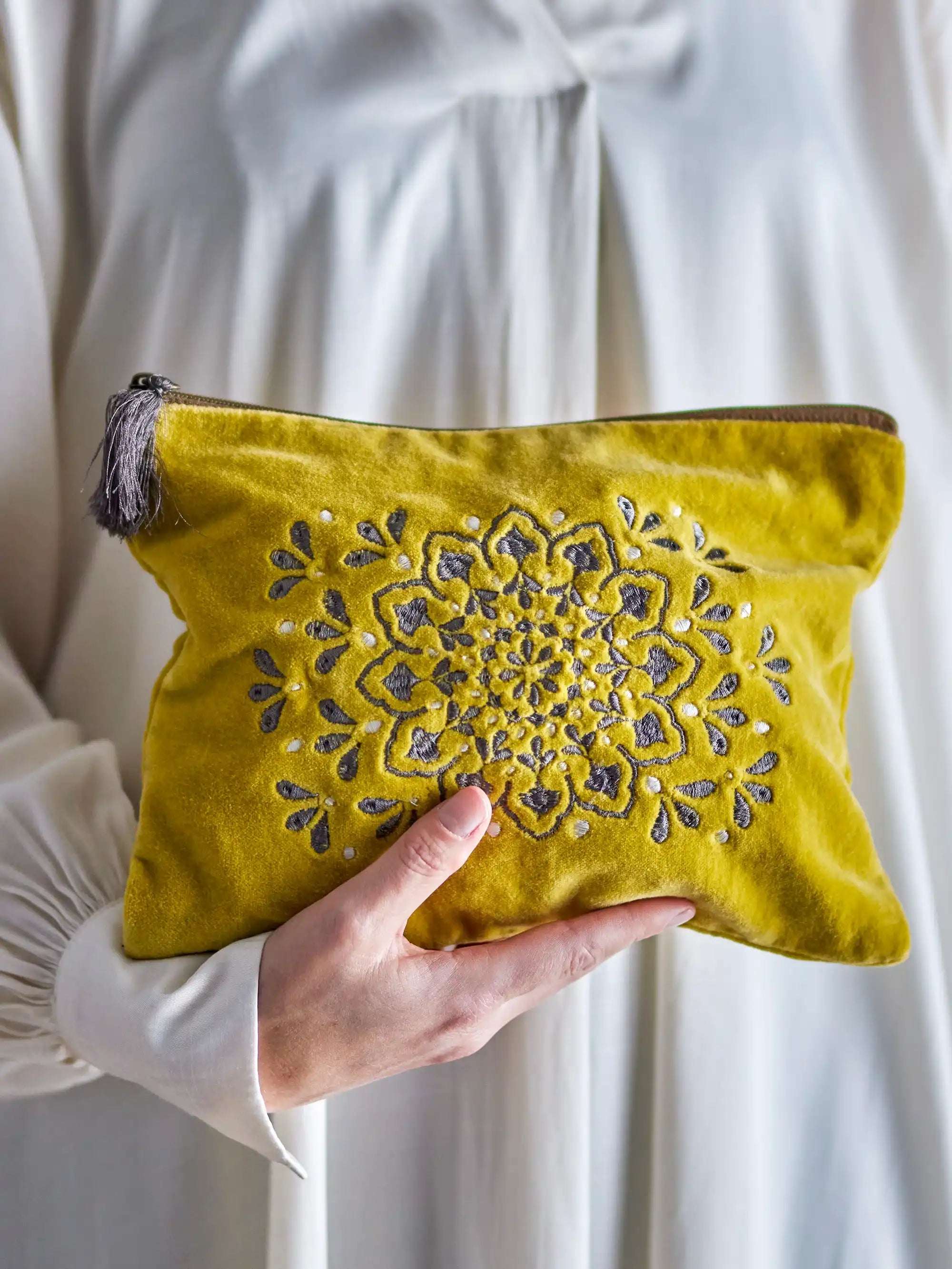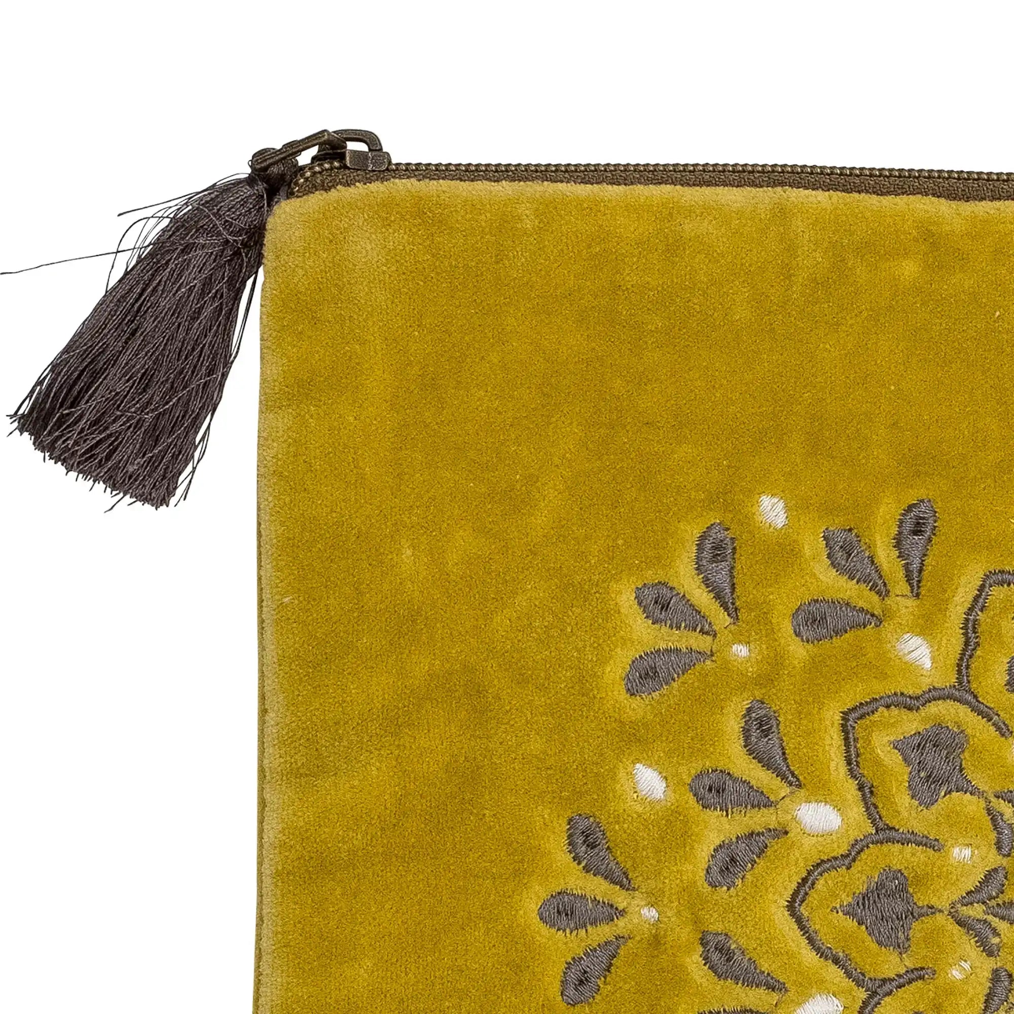 Details & materiaal: De tas is vervaardigd uit zacht katoen, en voorzien van een luxe velours buitenzijde in een zonnige, diepe gele tint. Het fijne borduurwerk in een grafisch patroon en het zwarte kwastje aan de rits geven het geheel een speelse Scandinavische touch. Met haar praktische formaat van 20 bij 27 cm heb je altijd genoeg ruimte voor make-up, penselen en andere essentials, zonder concessies te doen aan stijl.