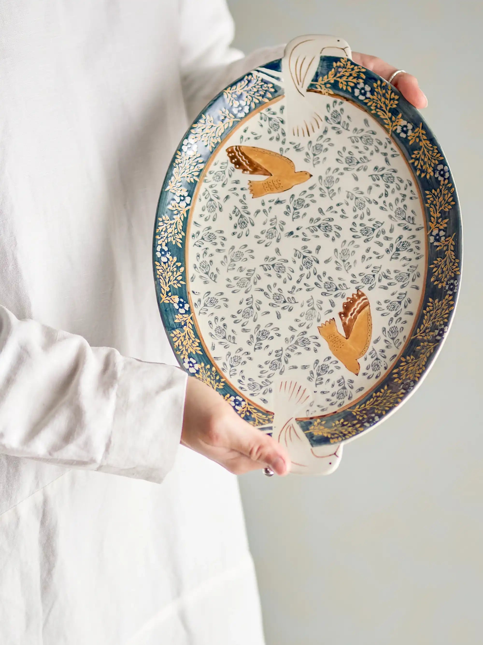 Details & materiaal: Het dienblad van Bloomingville is met de hand gedecoreerd uit stevig aardewerk, voorzien van een ambachtelijk gegraveerd motief én kleurrijke vogels. Dankzij het royale formaat van 34 bij 25 centimeter serveer je moeiteloos hapjes of drankjes, maar het is ook erg stijlvol als decoratief object.