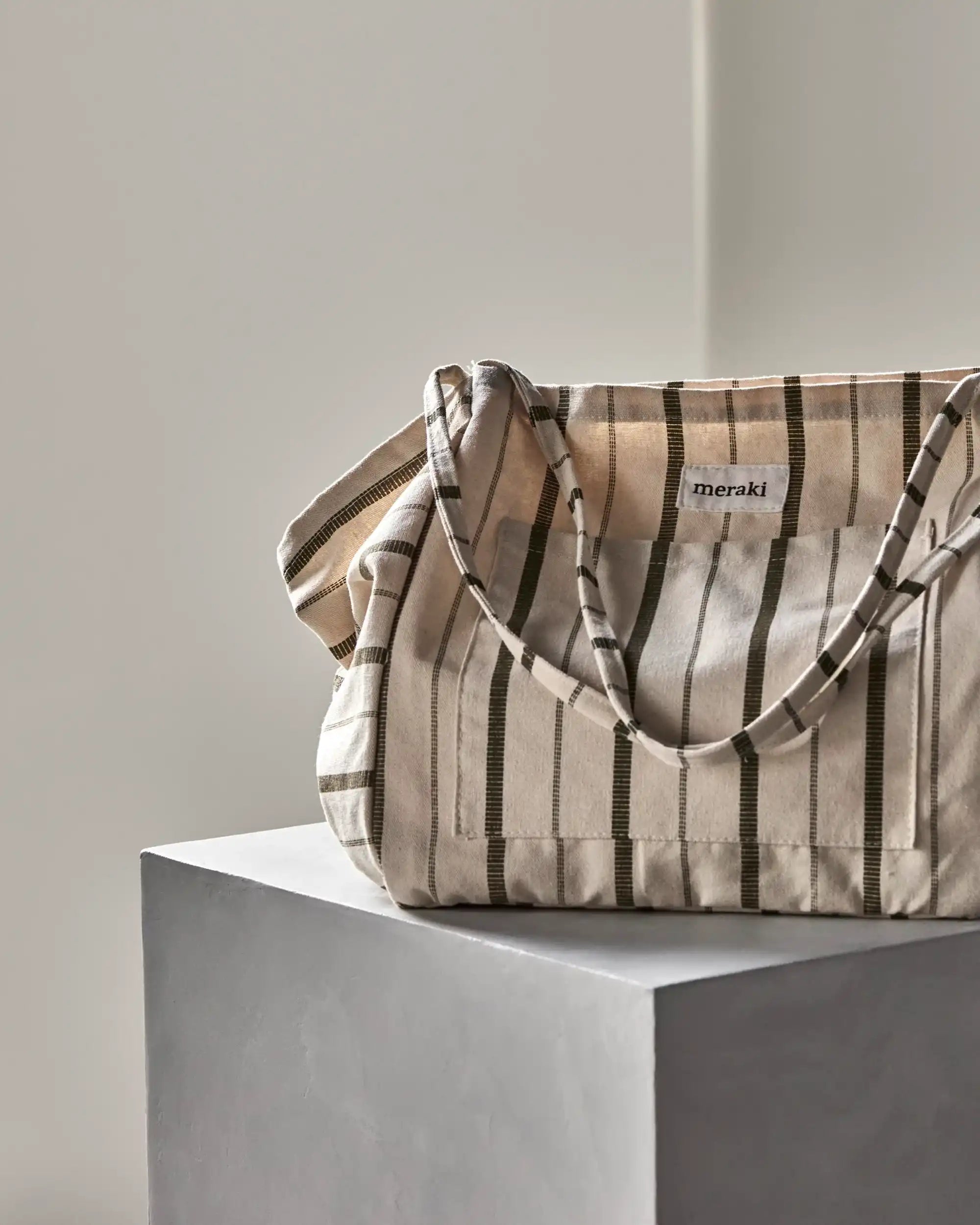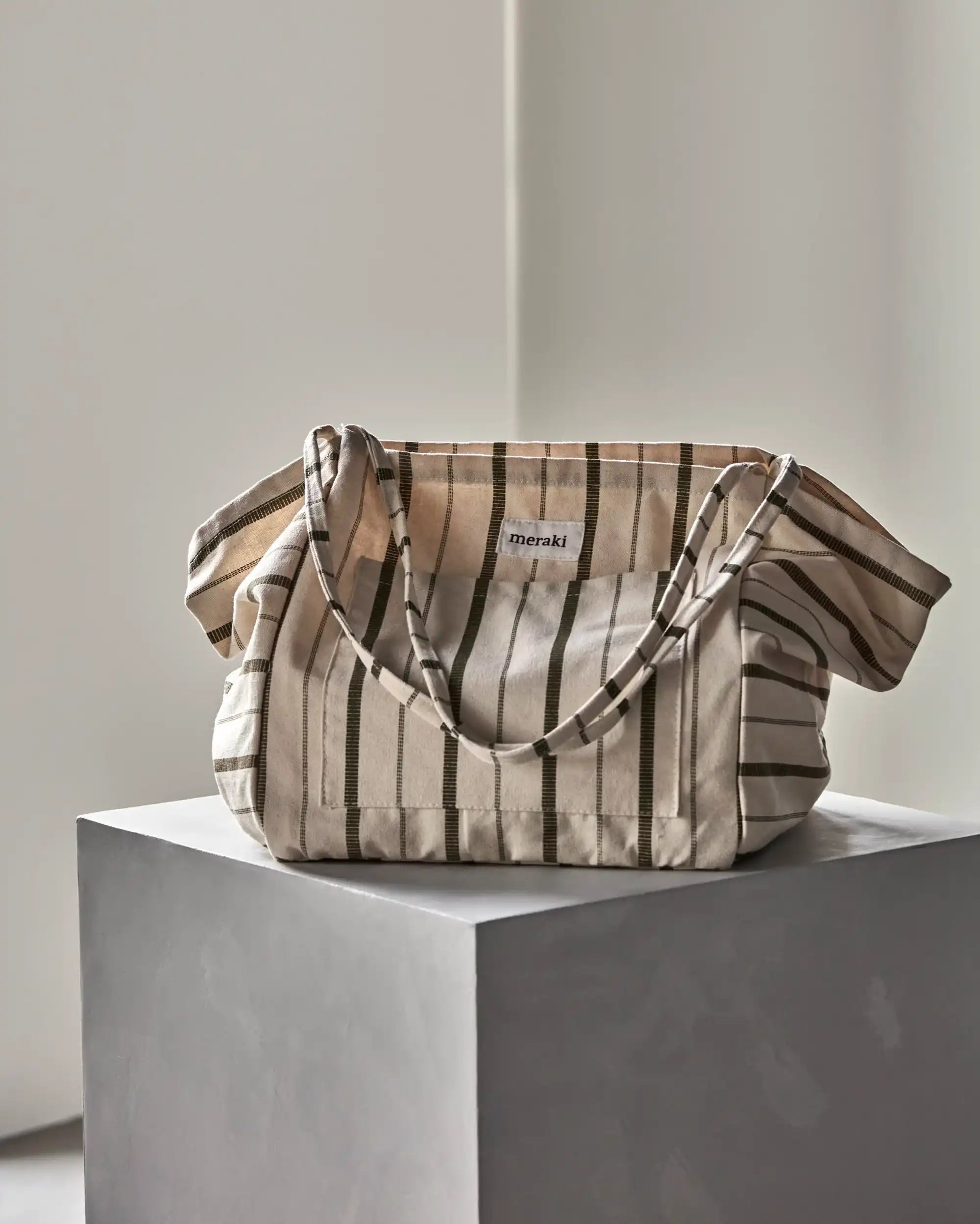 Hang de tas aan een haak in de hal met een opgerolde sjaal of een bundel droogbloemen erin — zo wordt je tote direct onderdeel van je interieur als je 'm even niet gebruikt. Perfect voor onderweg én mooi in huis.