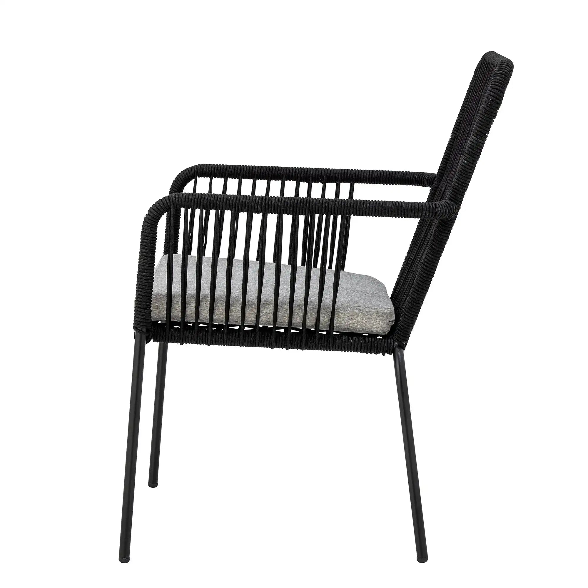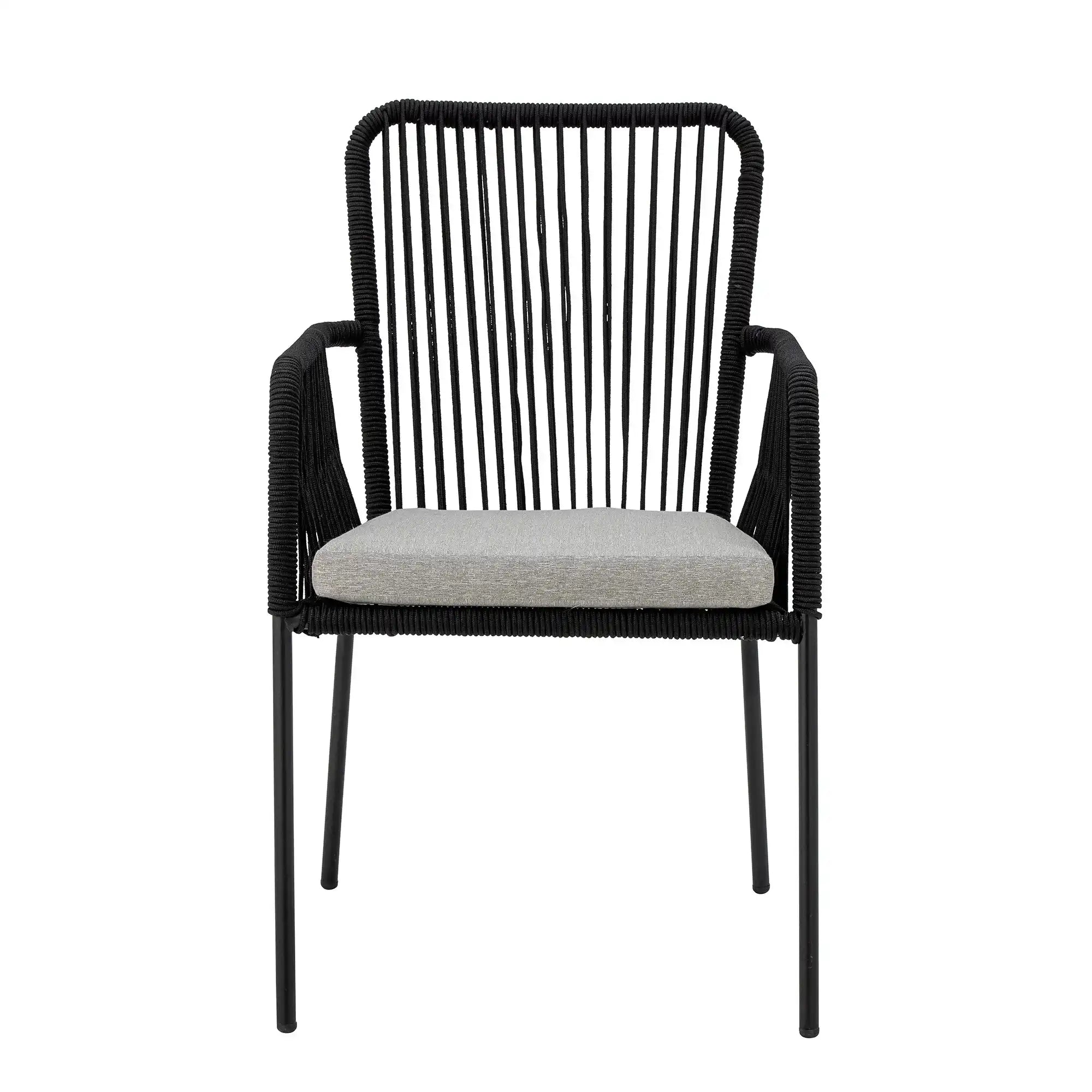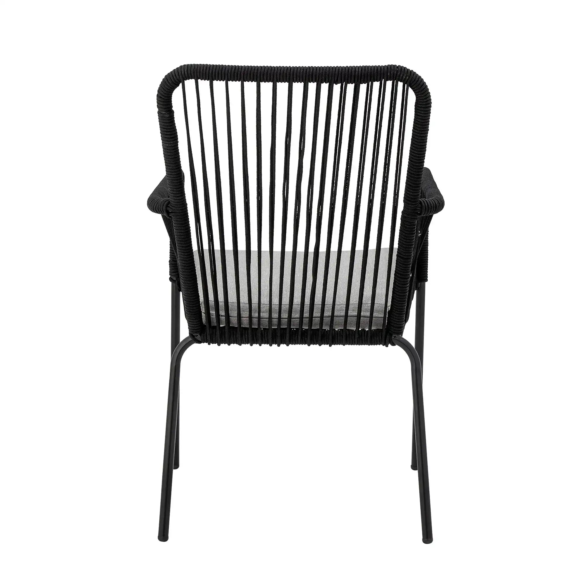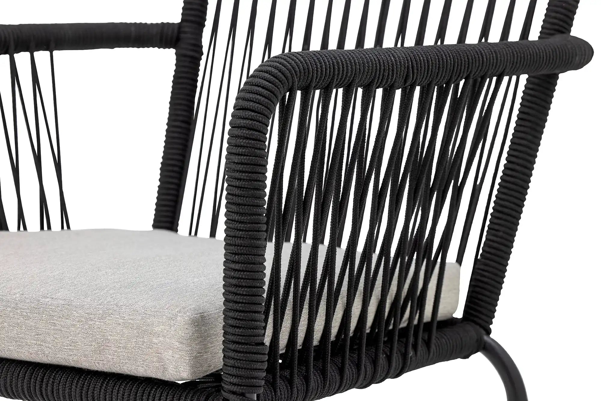 Duurzame materialen & elegant ontwerp: Deze stoel is vervaardigd uit zwart gepoedercoat metaal dat handgevlochten is met zwarte polyester touw, wat zorgt voor een prachtige textuur. Het bijgevoegde antracietgrijze kussen met afneembare polyester hoes is eenvoudig op 30 graden te wassen. Met royale afmetingen (65x87x52 cm) kun je comfortabel genieten van lange avonden buiten, terwijl het elegante lijnenspel perfect past binnen een Scandinavisch interieur.