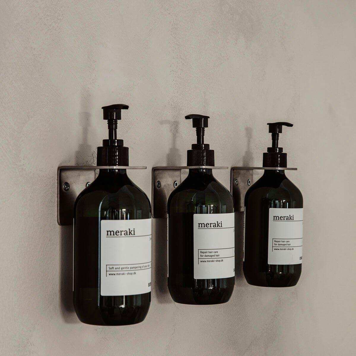 Deze wandhouder is geschikt voor Meraki flessen van 275 ml en 490 ml en ook voor andere merken flessen met een hals of opening van +/- 25mm. De wandhouder is gemakkelijk te monteren en geeft uw huis een industriële en decoratieve touch. U kunt het ook gebruiken in restaurants en hotels om een opgeruimde en stijlvolle uitstraling te creëren samen met de populaire Meraki verzorgingsproducten.