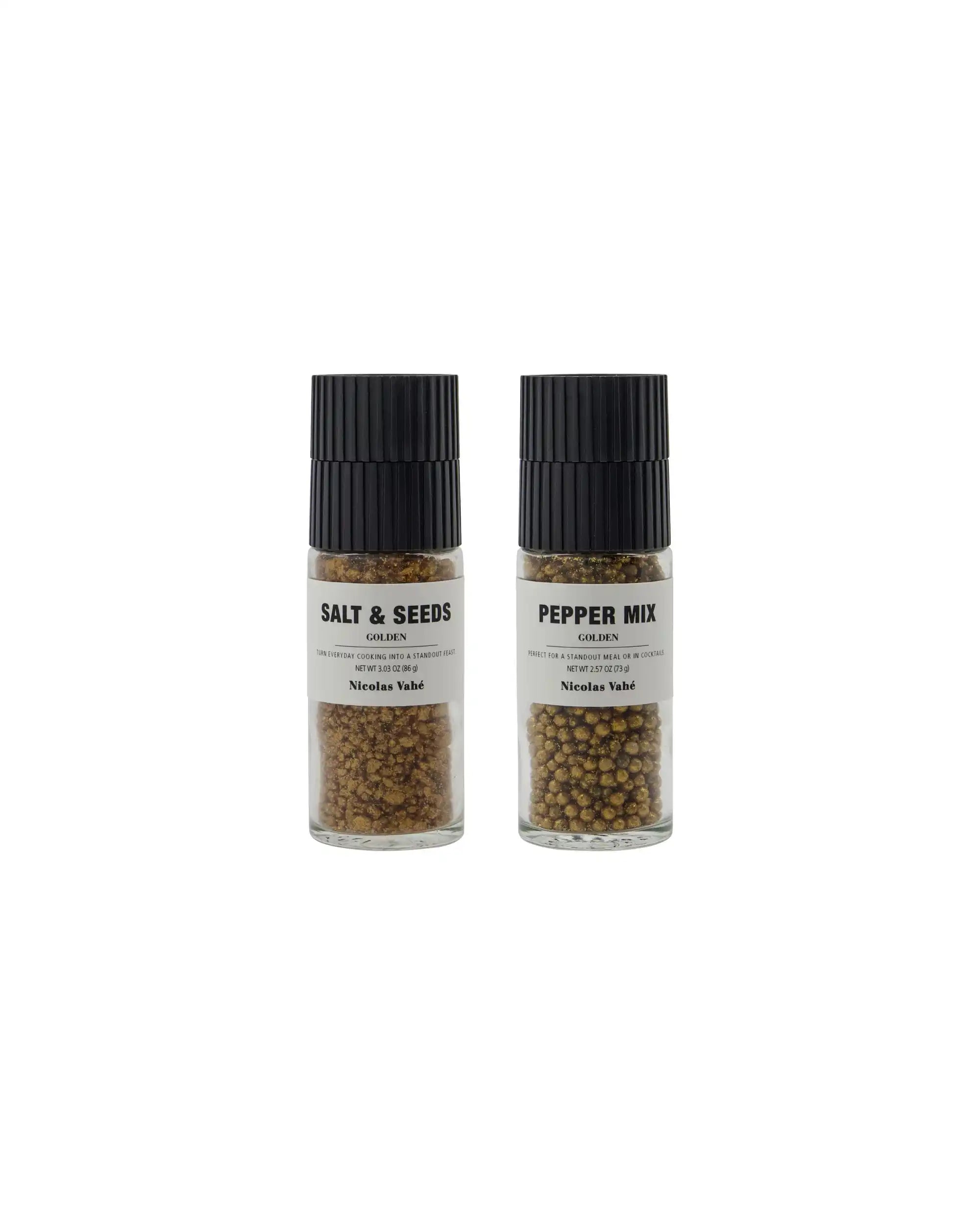Voeg een verfijnd accent toe aan jouw gerechten én je eettafel met deze elegante giftbox van Nicolas Vahé. De doos bevat een exclusieve mix van gouden peper en een delicate combinatie van goudkleurig zout met zaden. Een stijlvolle toevoeging die net dat beetje extra brengt, of je nu kookt voor gasten of voor jezelf.