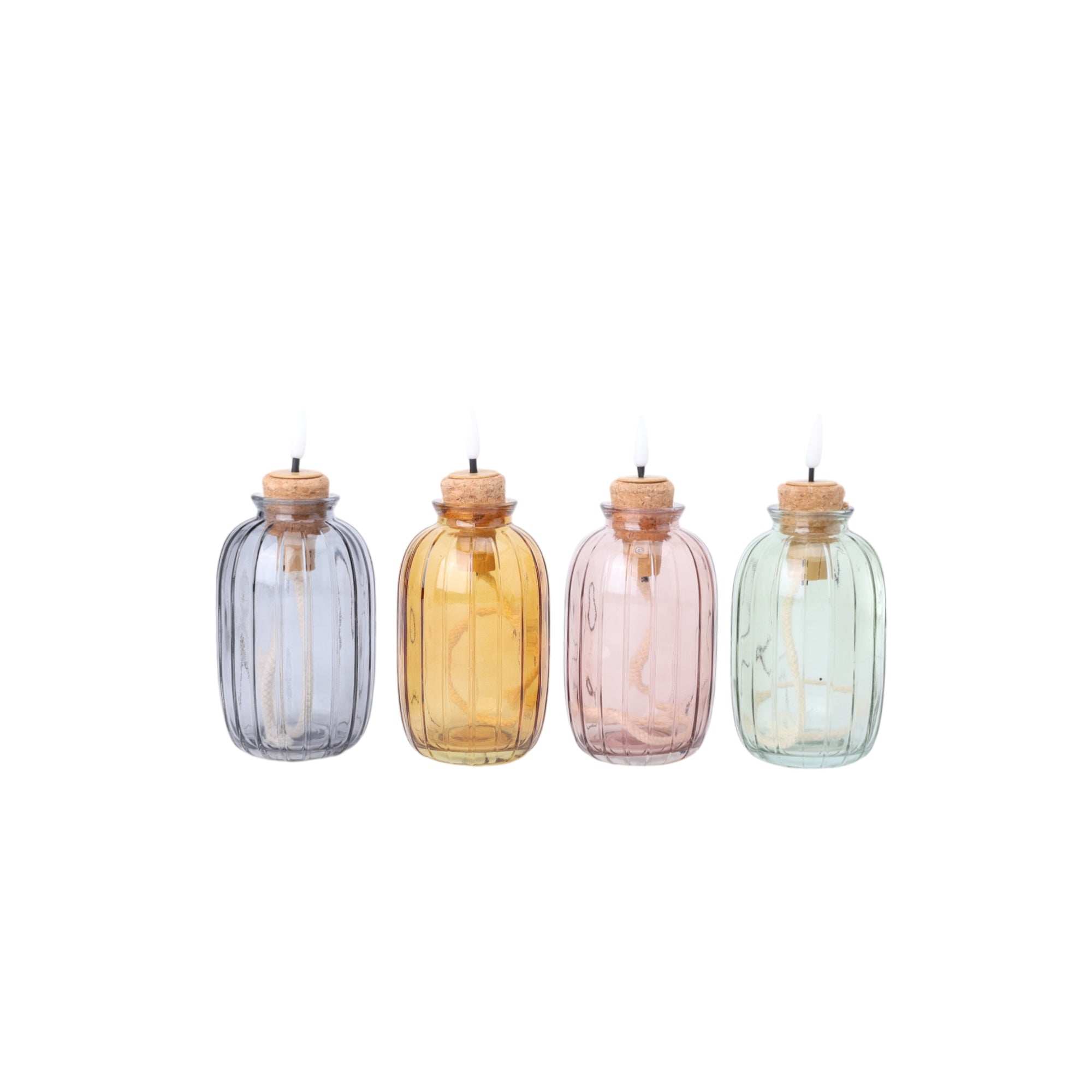 De kaarsen zijn gemaakt van gekleurd glas met een elegant ribbelpatroon en een kurken dop, waar het ledvlammetje subtiel uit tevoorschijn komt. De LED-verlichting zorgt voor een veilig alternatief voor echte vlammen en maakt ze ideaal voor avonden buiten. Ze zijn spatwaterdicht, dus prima bestand tegen een zomers briesje of een spatje regen. Let wel: langdurig buiten laten staan is niet aan te raden.