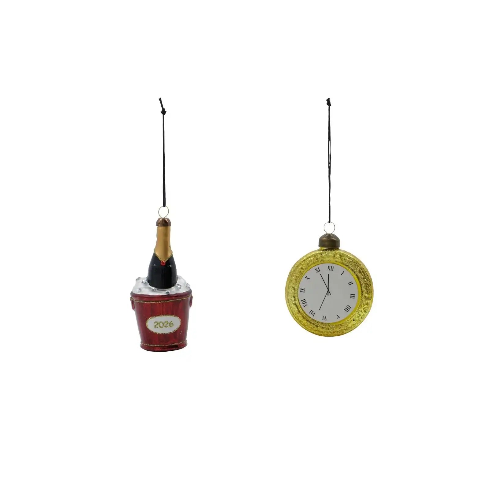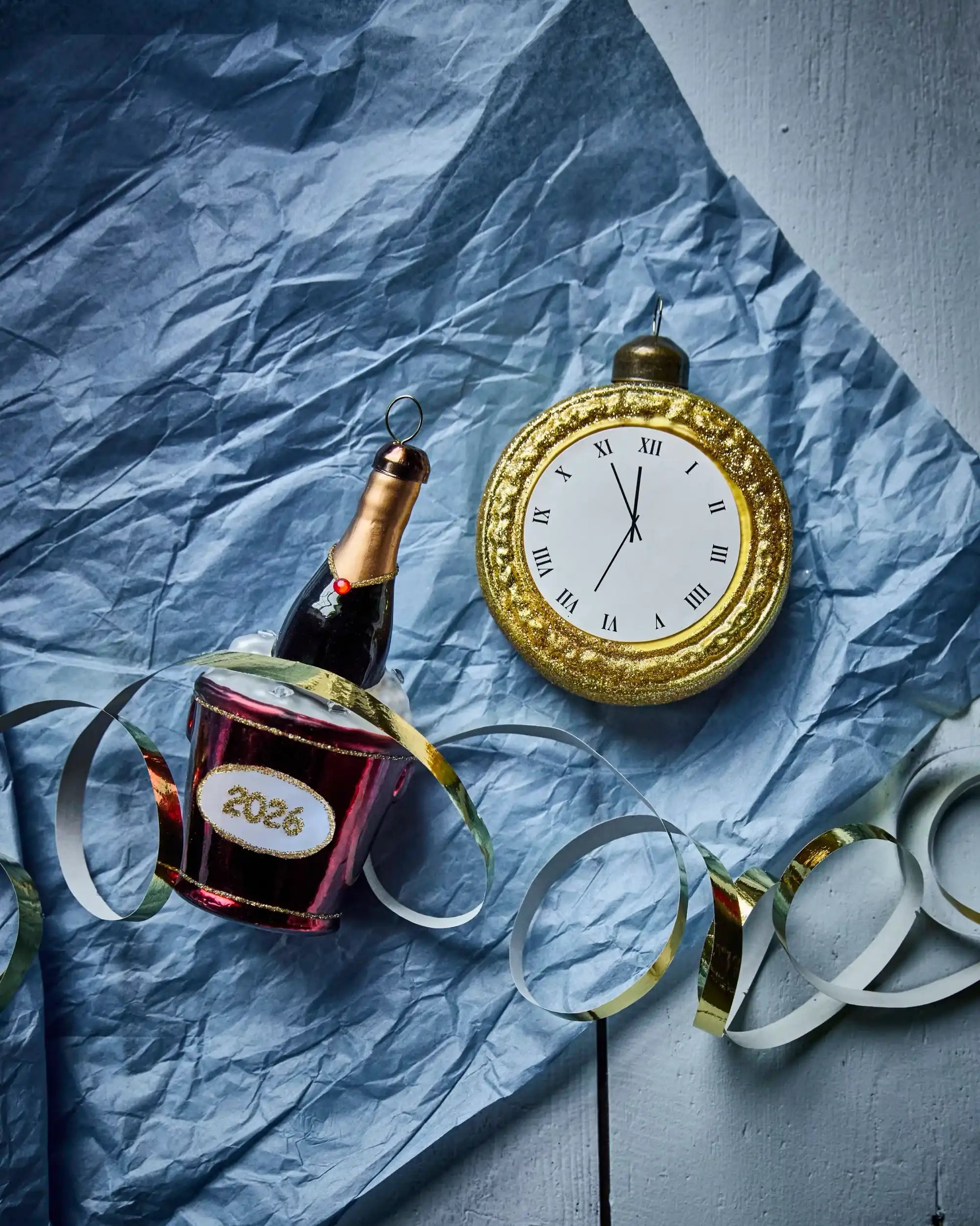 Geef je kerstdecoratie net dat beetje extra met deze bijzondere gouden ornamentenset, geïnspireerd op het nieuwe jaar. De feestelijke vormen van een champagnekoeler en een klok brengen direct een glimlach op je gezicht en zetten de toon voor een warme en stijlvolle jaarwisseling. Perfect om je boom een eigen karakter te geven — subtiel, maar opvallend genoeg om op te vallen.