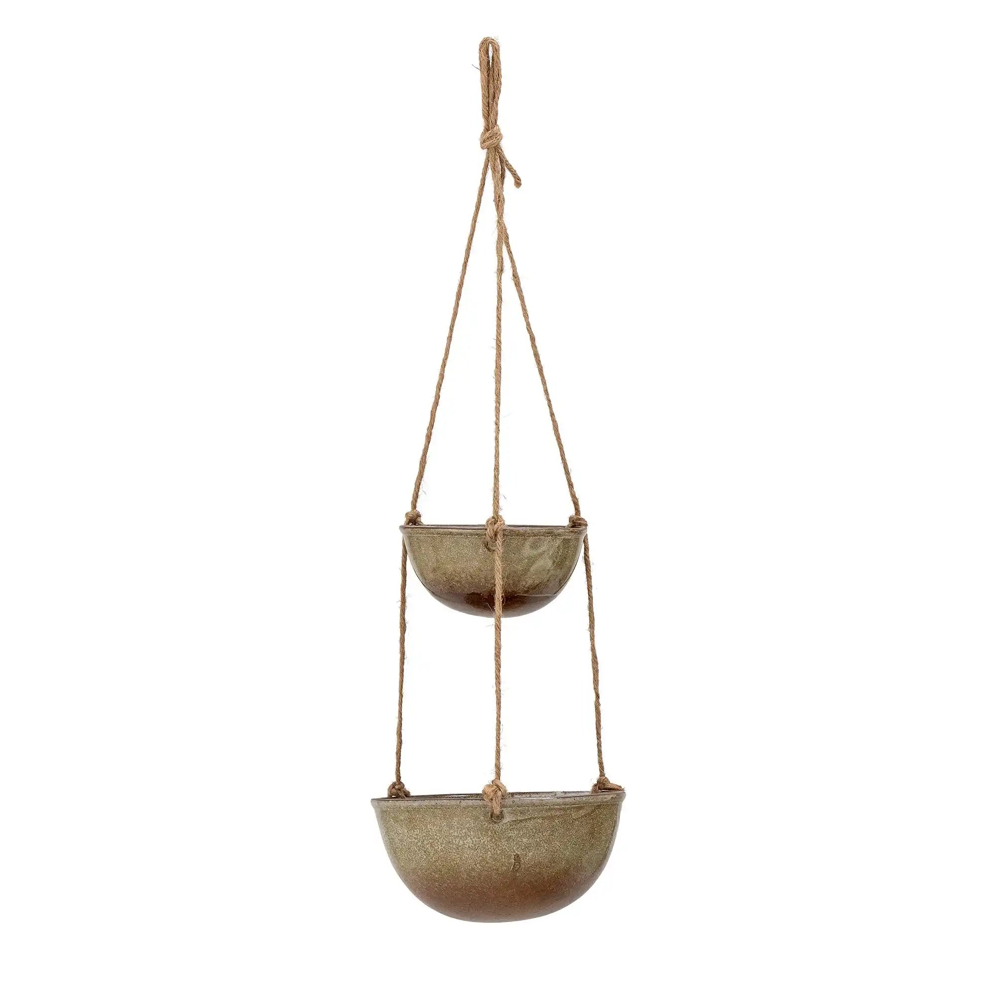 Details & materiaal: Gemaakt van duurzaam aardewerk in bruin, met twee schalen in verschillende formaten voor overzicht en gemak. De set is voedselgekeurd, zodat je met een gerust hart verse producten bewaart. Eén schaal heeft een ø 15 cm – ideaal voor appels, citroenen of tomaten – terwijl de kleinere schaal perfect is voor uien, knoflook of snacks. Het hangende ontwerp zorgt voor luchtige, verticale opbergruimte en geeft je keukenwand of nis een verzorgd aanzicht.