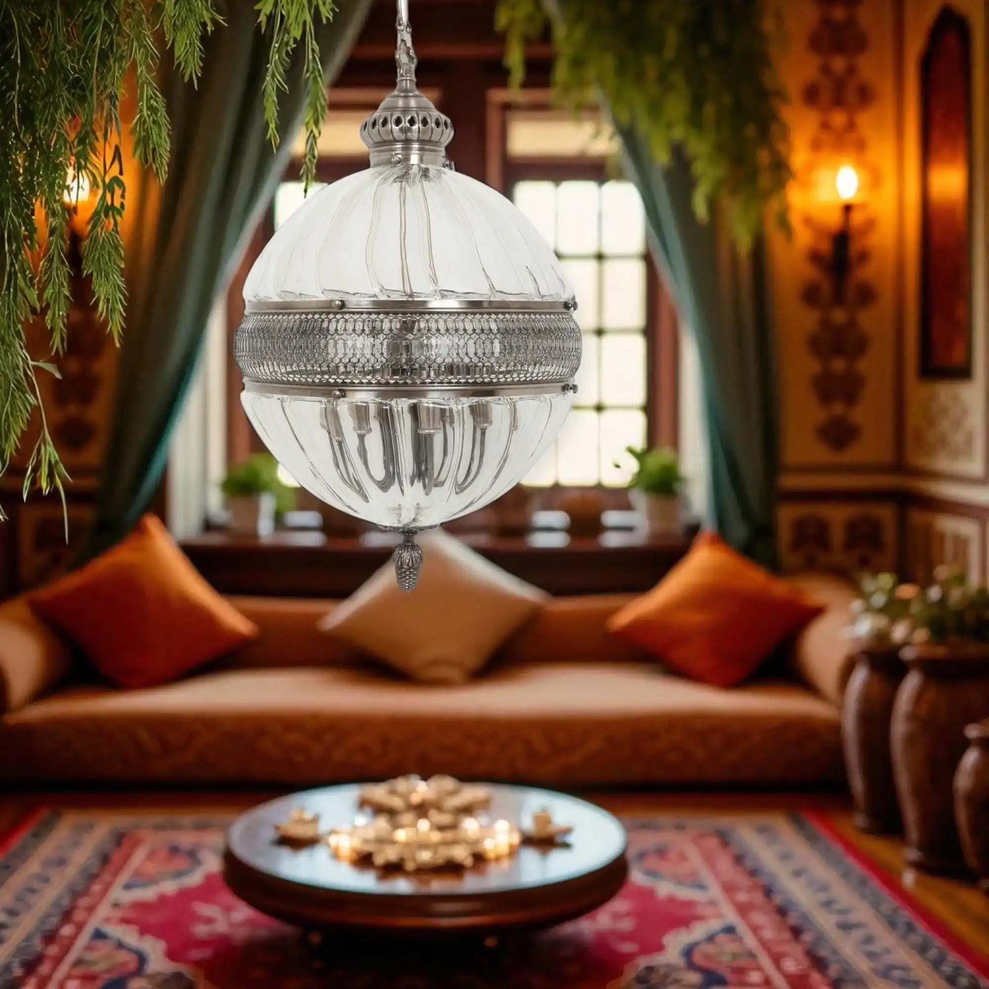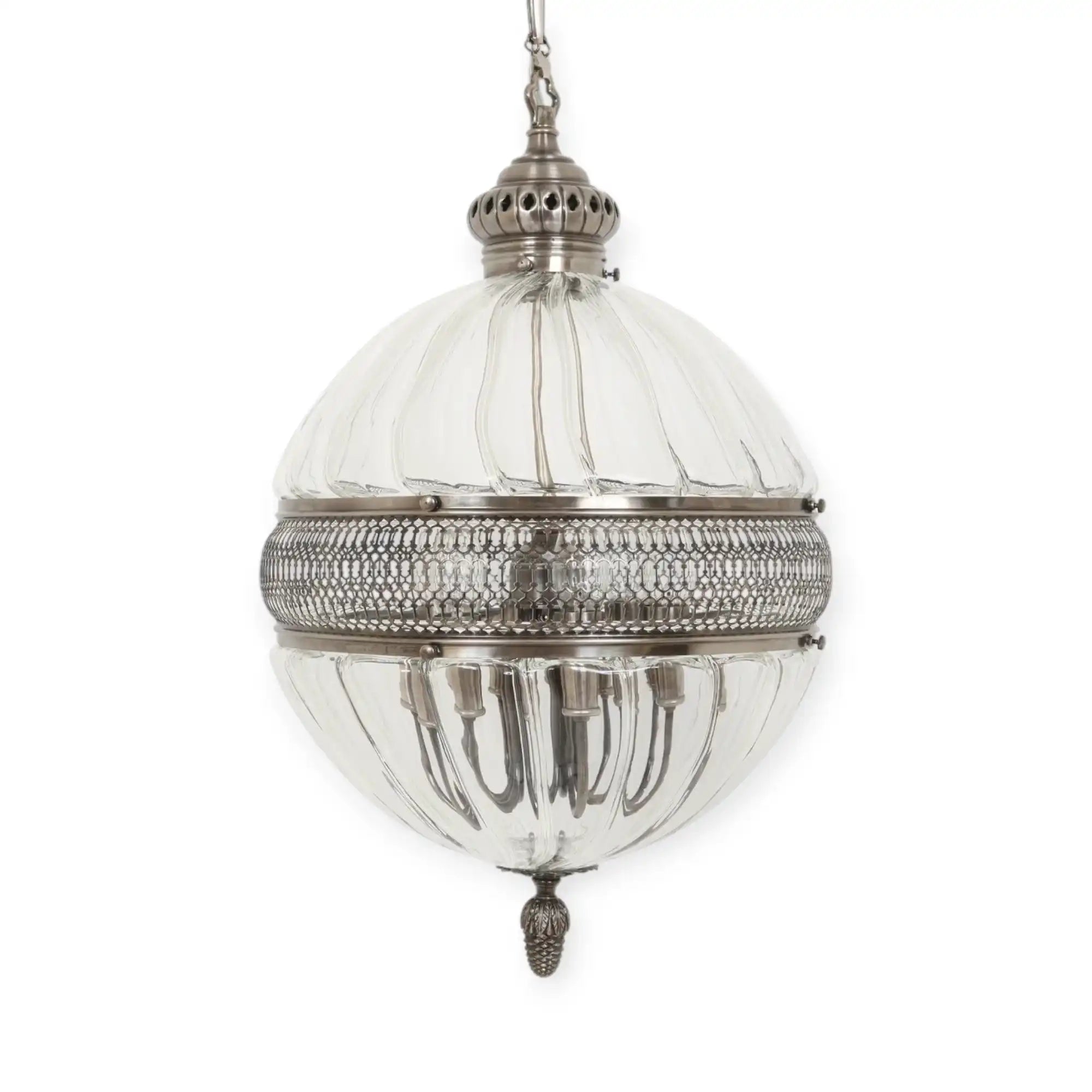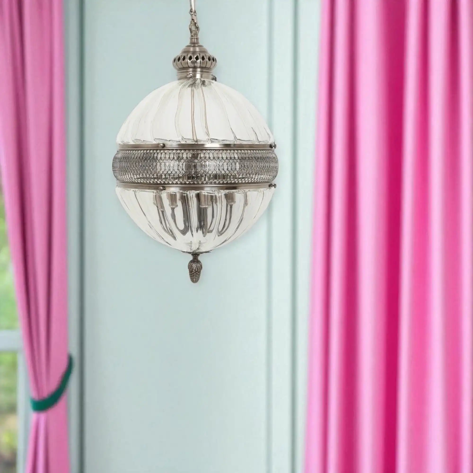 Geef je interieur een luxe en sfeervolle uitstraling met de Hanglamp Covelo. Deze bijzondere bolvormige hanglamp van 50 cm hoog en 35 cm in doorsnede is handgemaakt in Turkije. Het ontwerp combineert een frame in antiek zilver met prachtig, doorzichtig mondgeblazen glas. Het glas heeft een subtiele geribbelde structuur die het licht zacht verspreidt, terwijl de sierlijke metalen band in het midden een extra stijlaccent geeft.