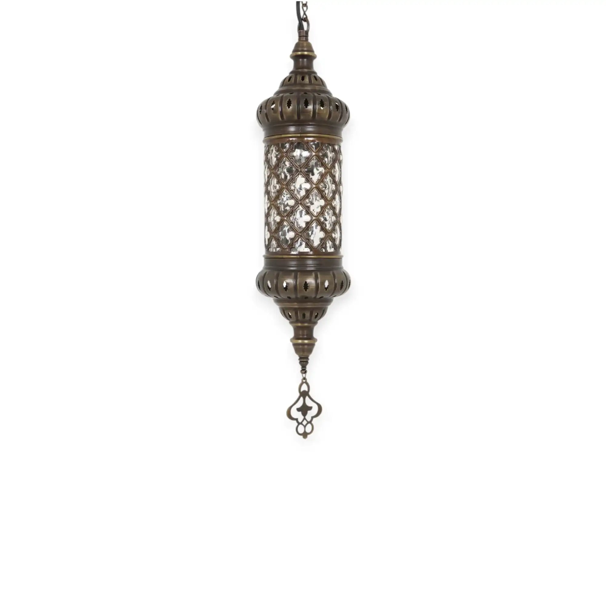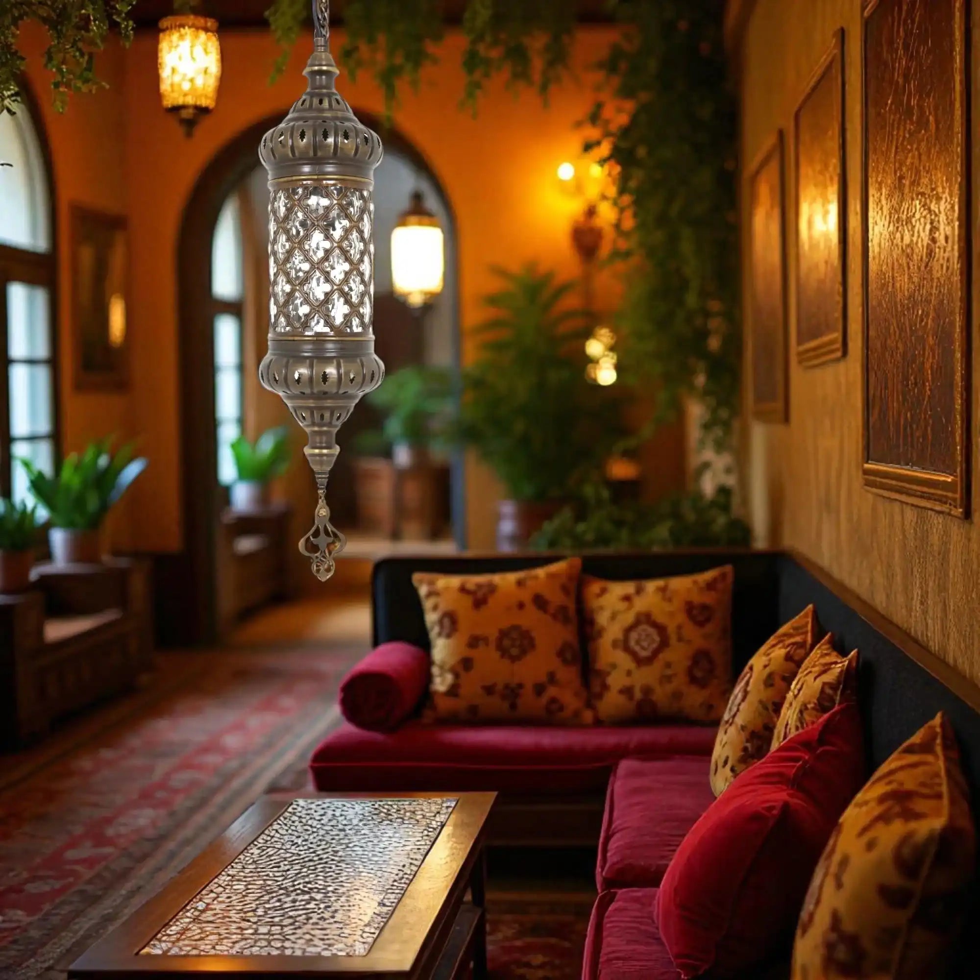 Breng een vleugje mystiek en warmte in je interieur met deze handgemaakte oosterse hanglamp uit Turkije. Elk exemplaar is met zorg vervaardigd door ervaren ambachtslieden, waardoor je een uniek en authentiek product in huis haalt. Het sierlijke filigrain patroon in het metalen frame laat het licht op een betoverende manier door, waardoor prachtige schaduwen dansen op je muren en plafond.