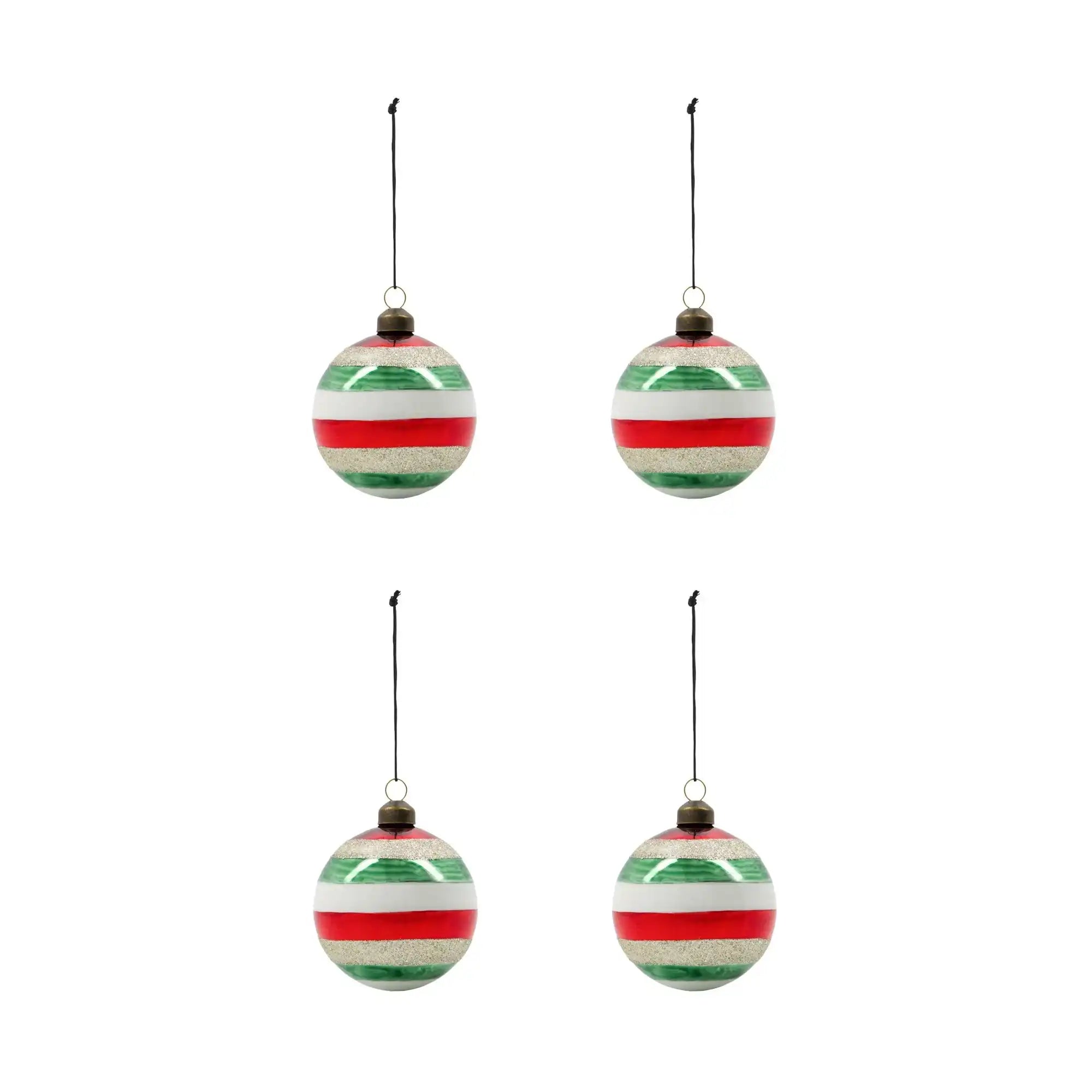 Elke ornament is met de hand beschilderd en mondgeblazen uit glas, wat zorgt voor een unieke uitstraling en verfijnd detail. De champagnekleurige glitterstreep voegt net dat beetje fonkeling toe, zonder te overheersen. De set bestaat uit vier ornamenten met een diameter van 8 cm. Dankzij het metalen ophangoog bevestig je ze eenvoudig waar je maar wilt.
