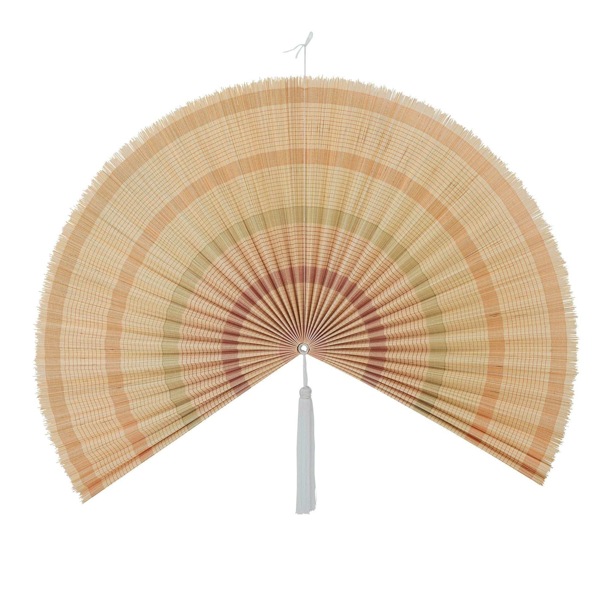 Met een breedte van maar liefst 160 cm is deze muurdecoratie naturel ideaal als wanddecoratie boven het bed, boven de bank of als eyecatcher in de hal. Het ontwerp is geïnspireerd op een waaier en brengt de rust van de natuur naar binnen. Het lichte ophangtouw maakt bevestigen makkelijk – je hebt dus geen gedoe, alleen sfeer.