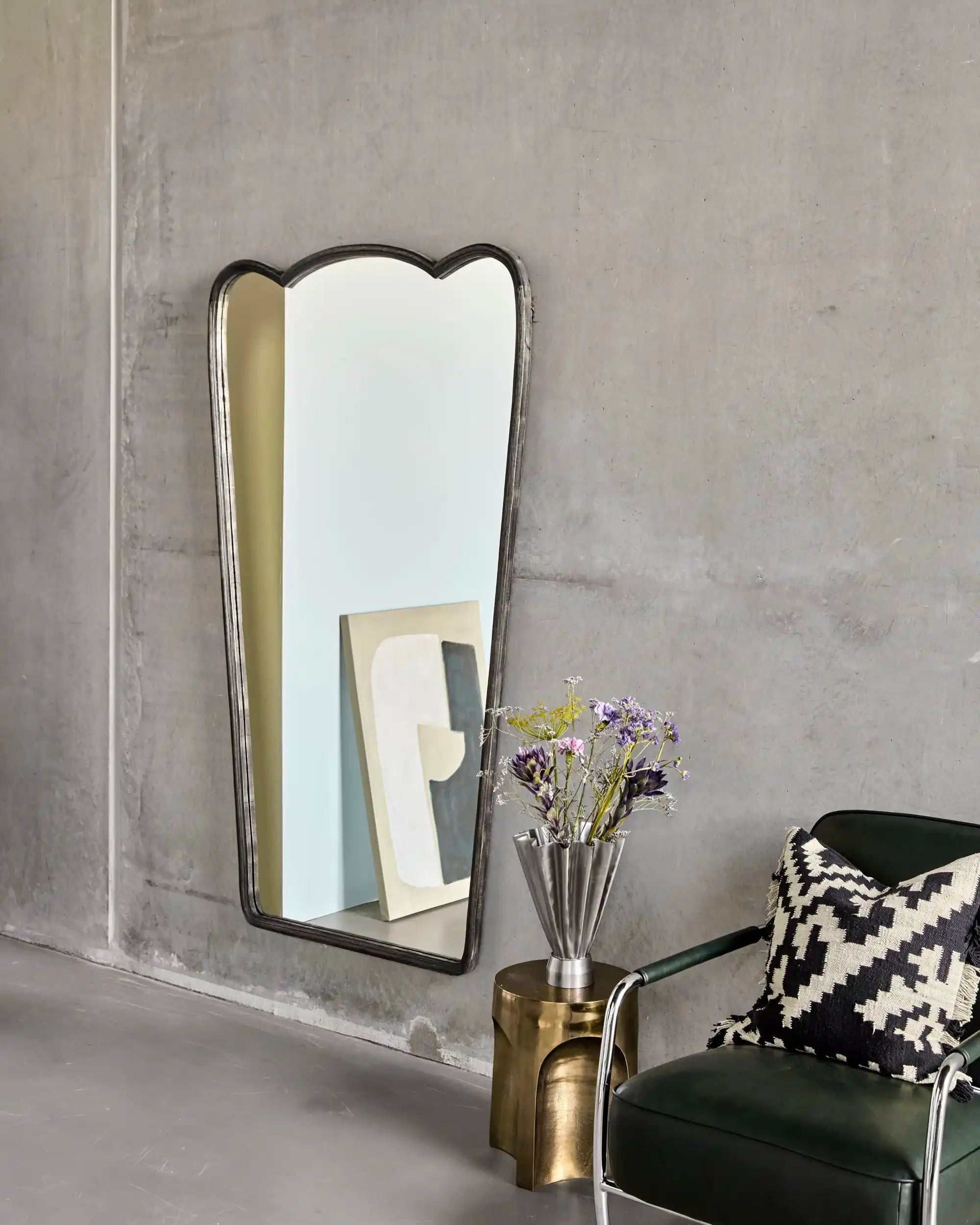 Het frame is handgemaakt van duurzaam mangohout en zwart gebeitst, wat elk exemplaar een eigen karakter geeft. De spiegel meet 105 cm breed, 180 cm hoog en heeft een diepte van 3,5 cm — ruim genoeg om jezelf volledig te zien, maar ook slank genoeg om stijlvol tegen de muur te leunen of op te hangen.
