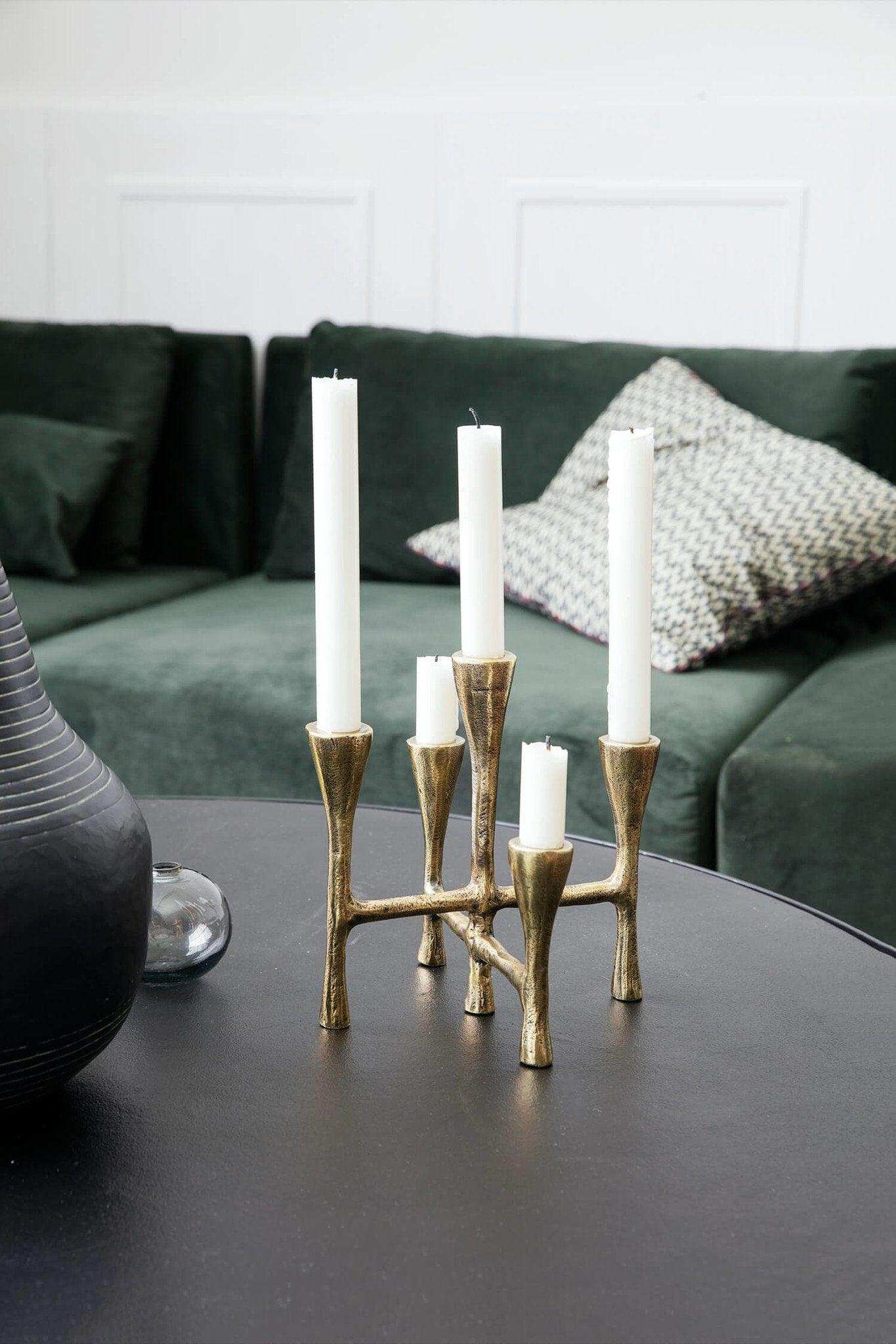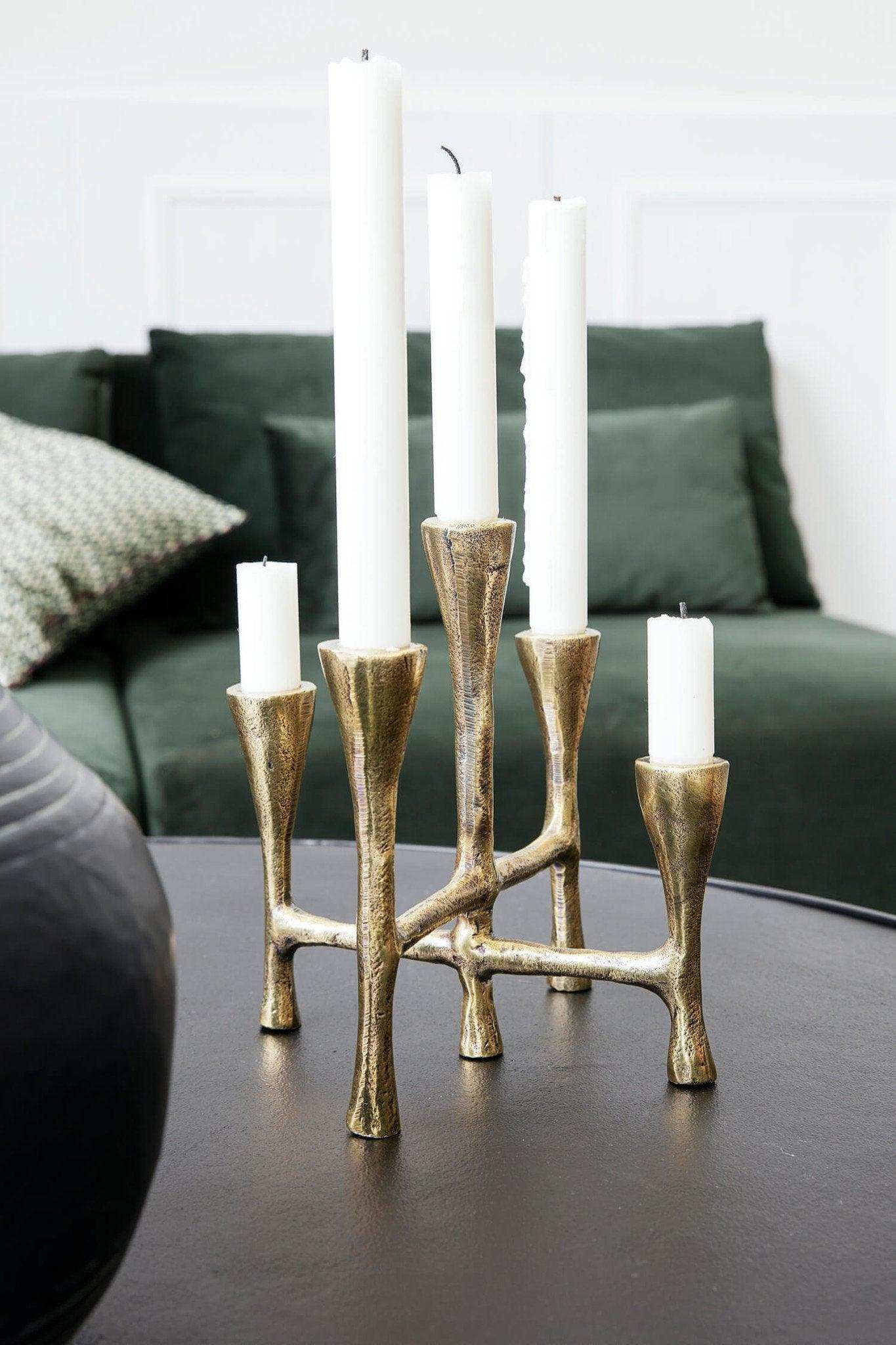 De Tristy kandelaar is gemaakt van aluminium en heeft een glanzende messing finish, waardoor het een rustieke en antieke uitstraling heeft. De kandelaar is een ware eyecatcher, vooral vanwege de prachtige messing afwerking. Met afmetingen van 20 cm lang, 19 cm breed en 20 cm hoog is deze kandelaar een sculpturaal element dat je interieur op een elegante manier verrijkt.