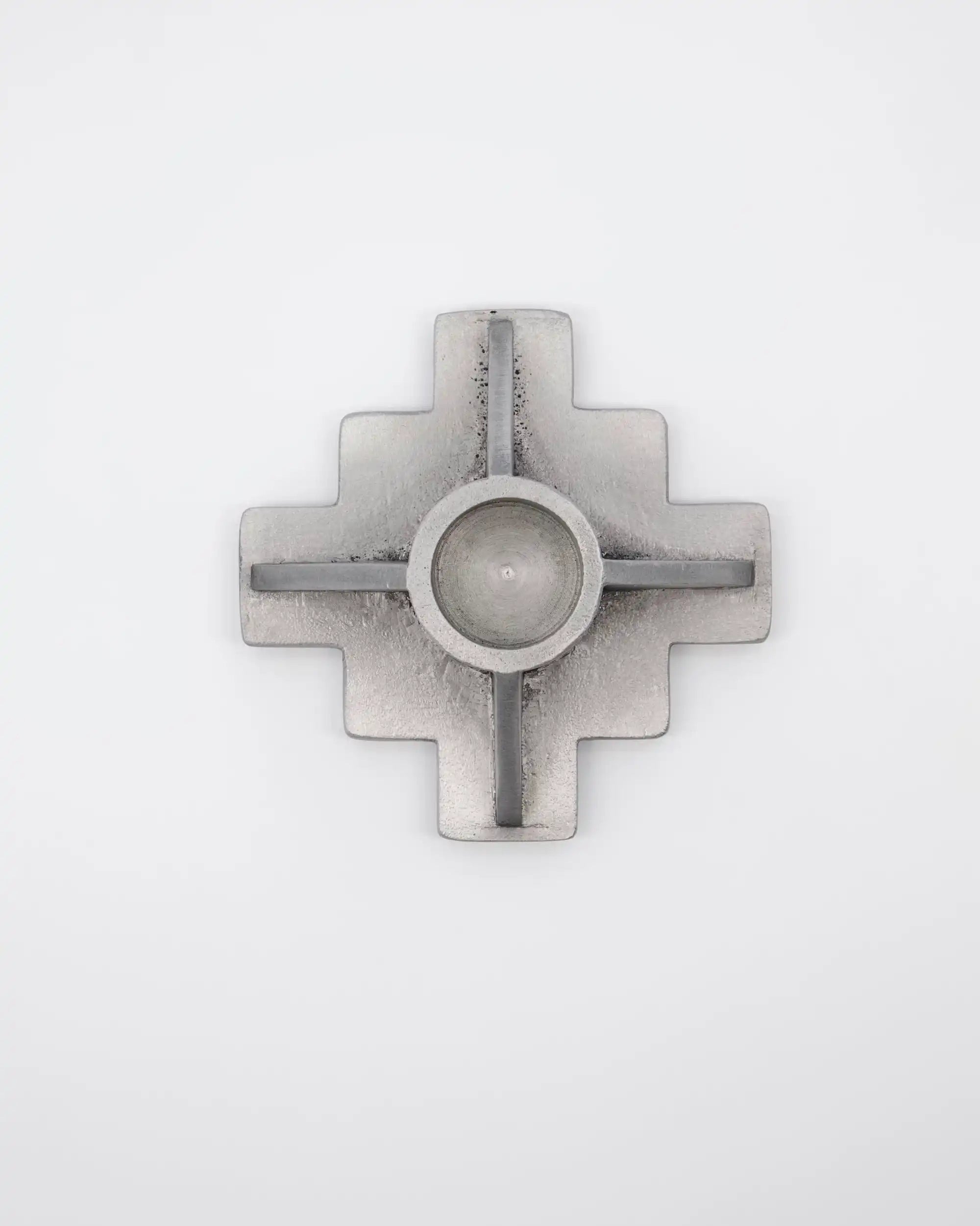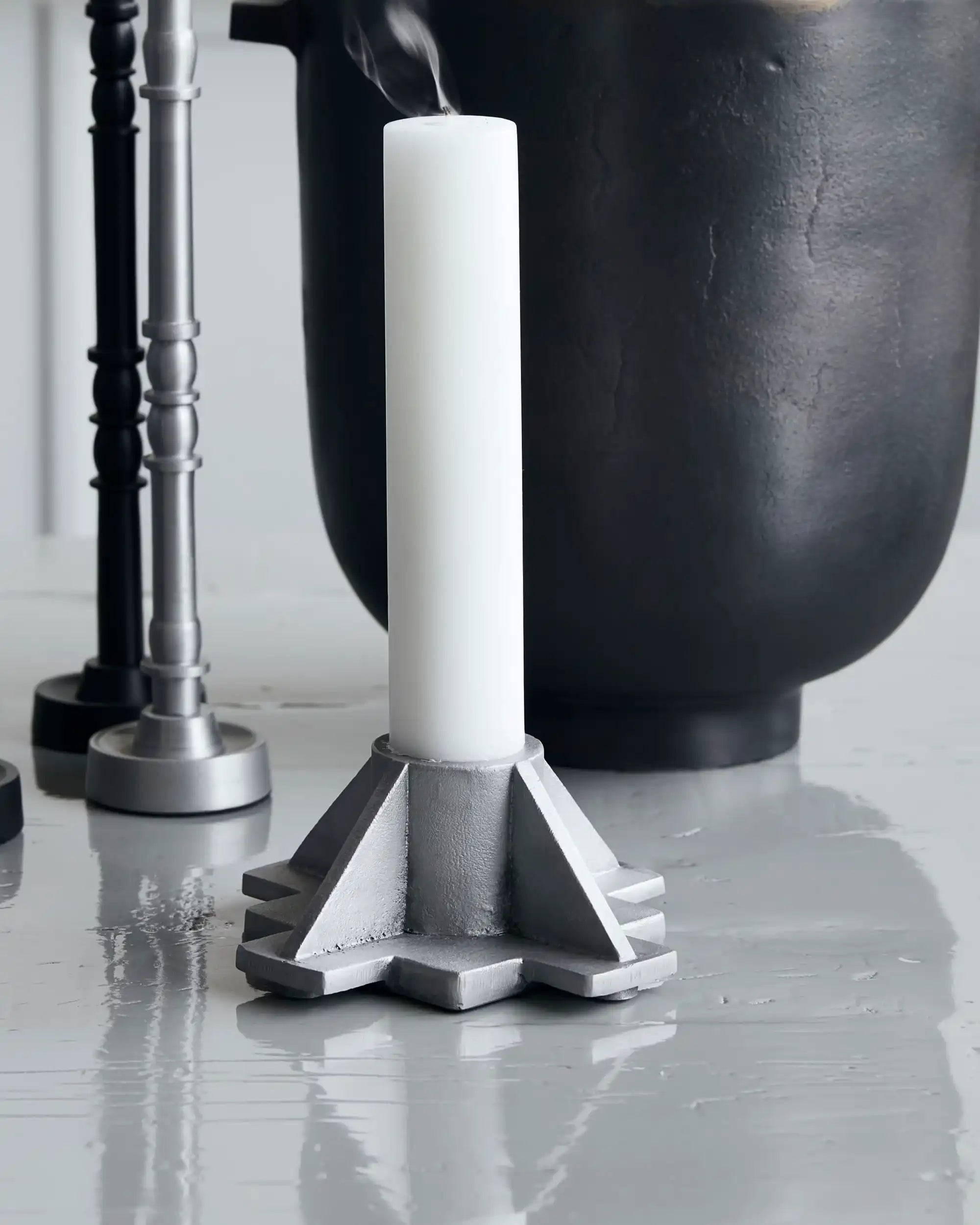 De hoekige vorm en zilverachtige kleur vormen een mooi contrast met zachte texturen of gladde oppervlakken. Gemaakt van antiek aluminium blijft het materiaal zichtbaar — net even ruw, net even anders. Castle meet 15,4 cm in de lengte en breedte, met een hoogte van 6,4 cm. Geschikt voor stompkaarsen met een diameter van 4 cm, waardoor je volop kunt variëren in sfeer en styling.