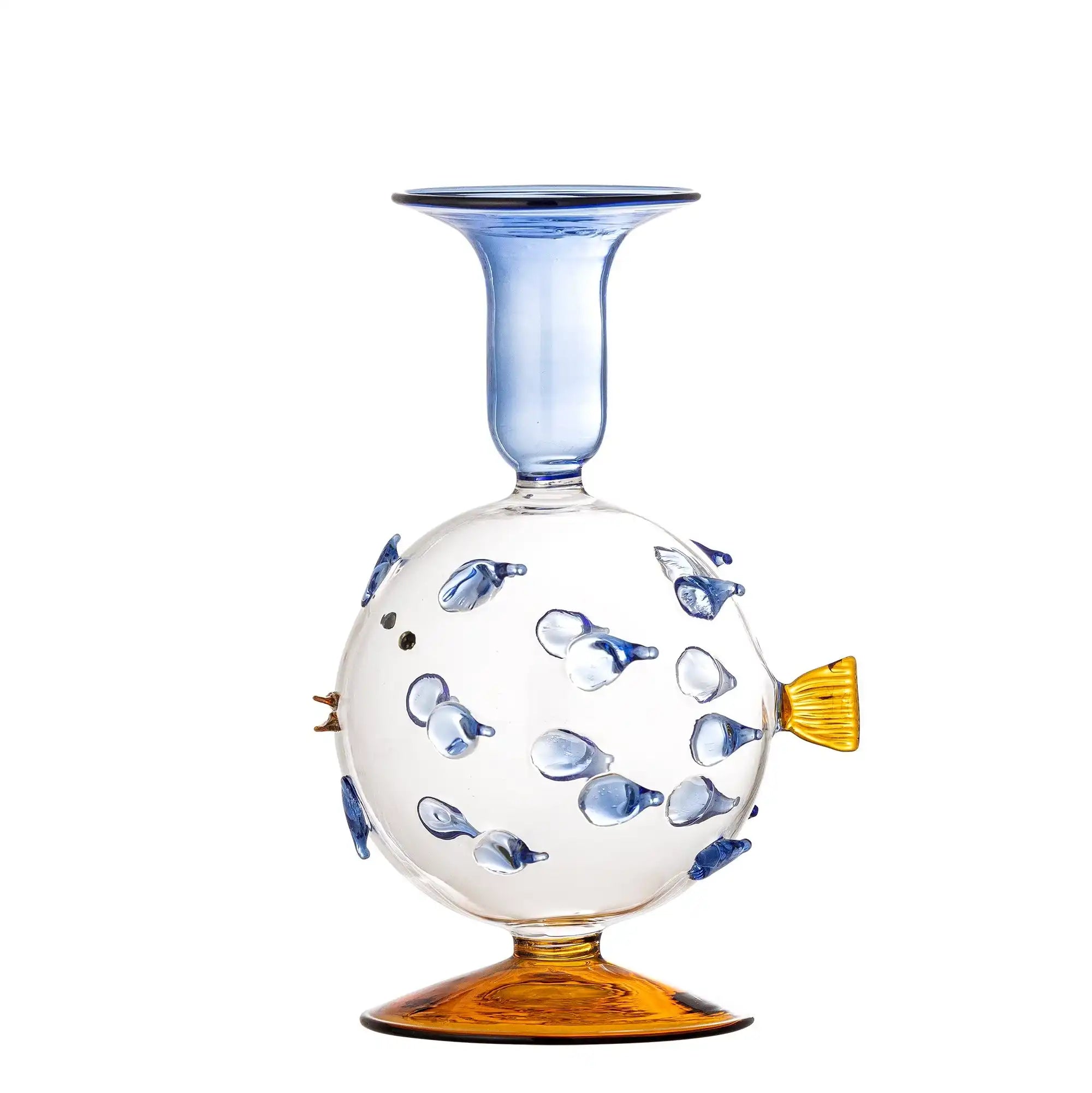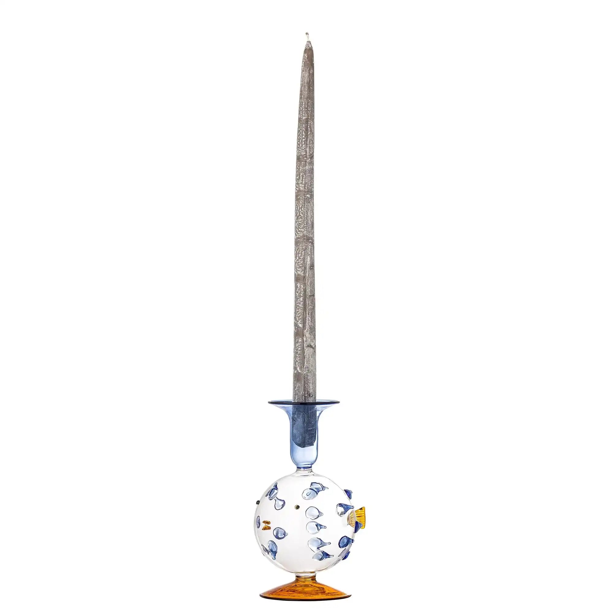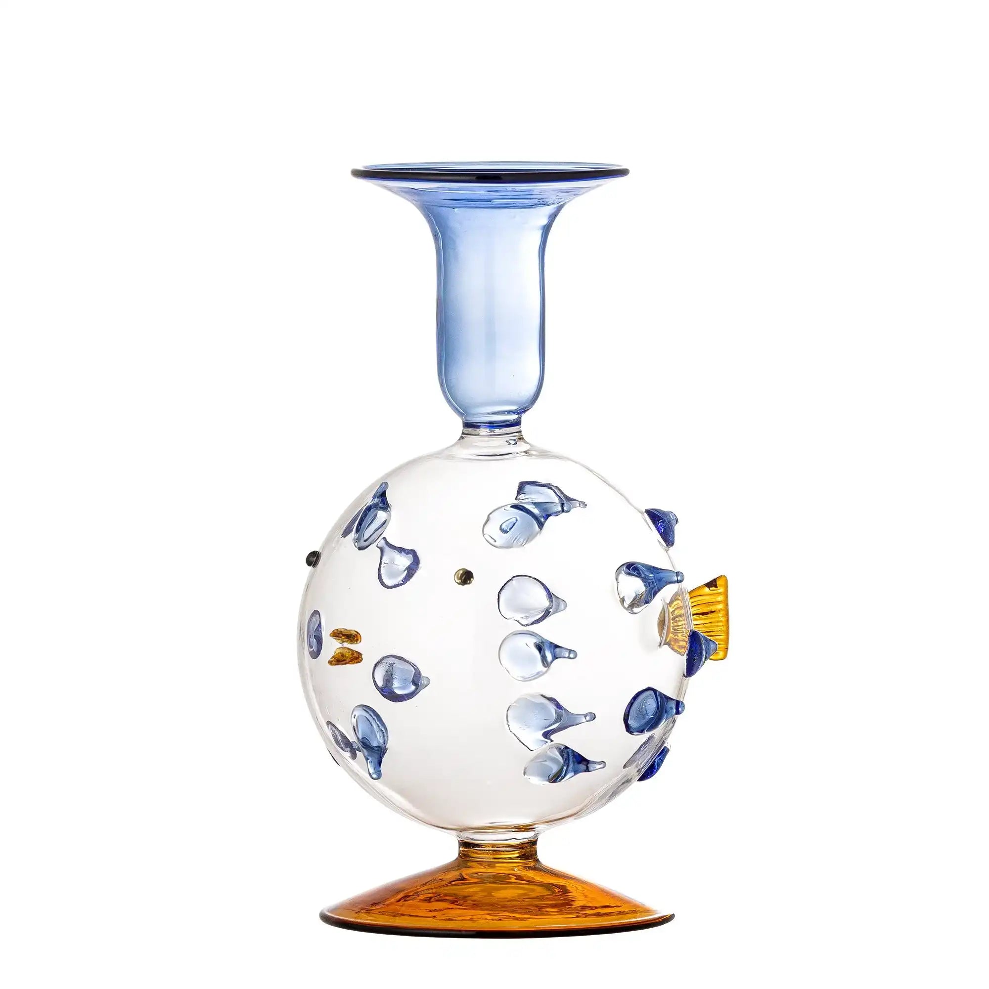 Details & materiaal: Gemaakt van glas met een verrassend kleurspel in blauw en amber. Mondgeblazen afwerking zorgt voor levendige effecten en kleine verschillen die het ontwerp karakter geven. Met ø 11 cm is Phila compact en gemakkelijk te plaatsen, terwijl de sculpturale silhouette meteen diepte brengt in je styling. De decoratieve details vangen het kaarslicht en laten het speels dansen over het oppervlak.