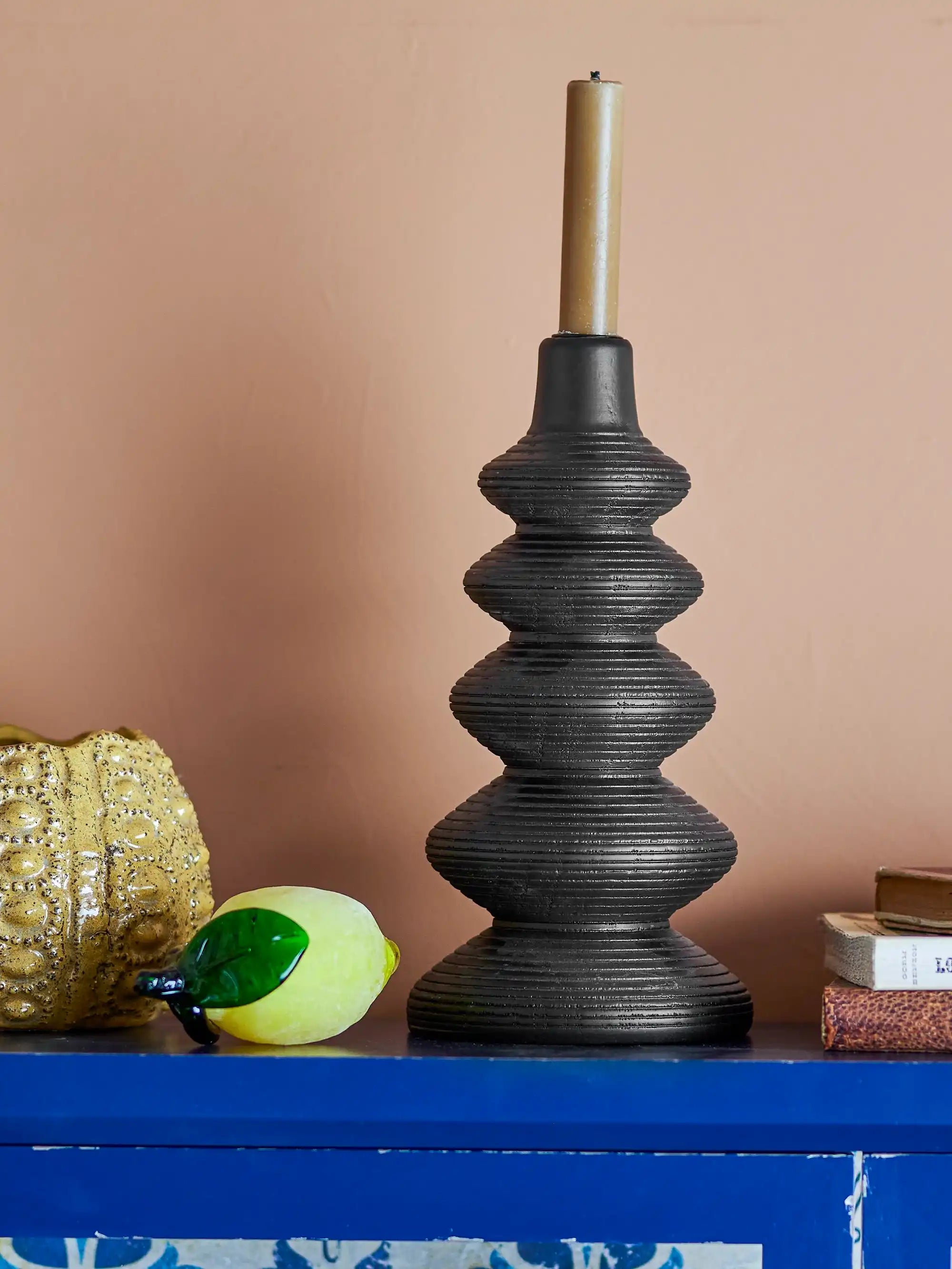 Gebruikstip: Combineer de kandelaar met een lage schaal of kleine vaasjes in glas of aardewerk voor een gelaagd geheel, en herhaal de zwarte tint in een ander accessoire voor rust. Plaats hem op de eettafel of vensterbank en geniet van de sfeervolle uitstraling – elke dag weer.