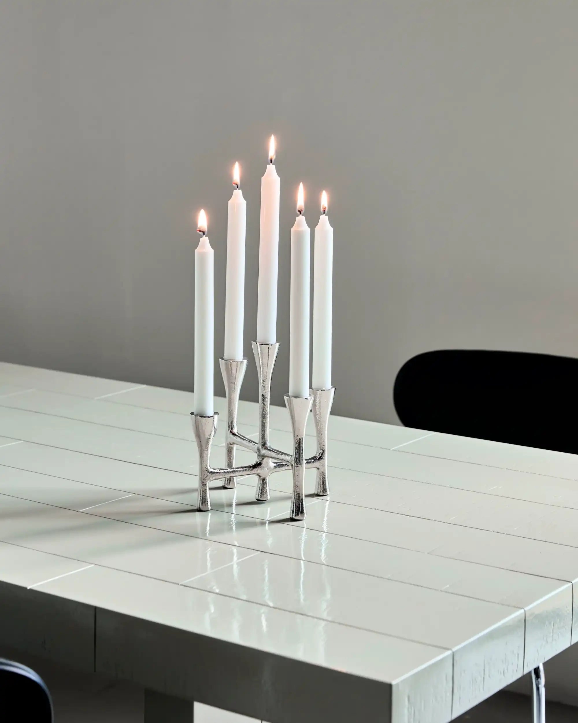 Gebruikstip: Plaats de kandelaar in de buurt van een spiegel of op een donker oppervlak om de weerkaatsing van het zilver extra tot zijn recht te laten komen. Perfect voor een warme gloed tijdens avonden binnenshuis.