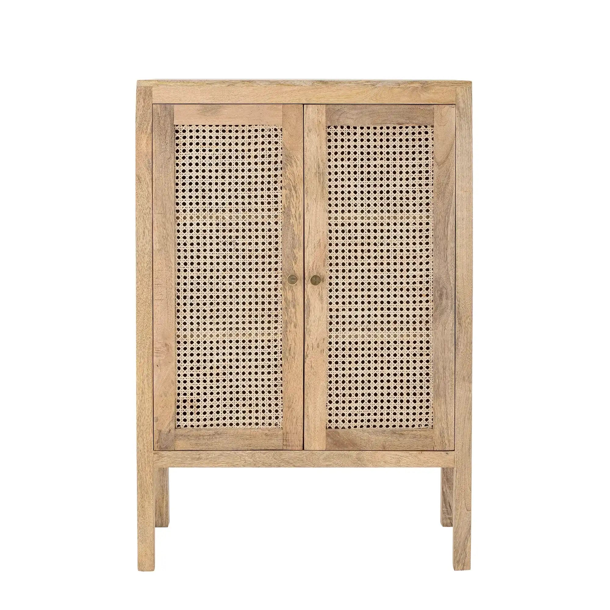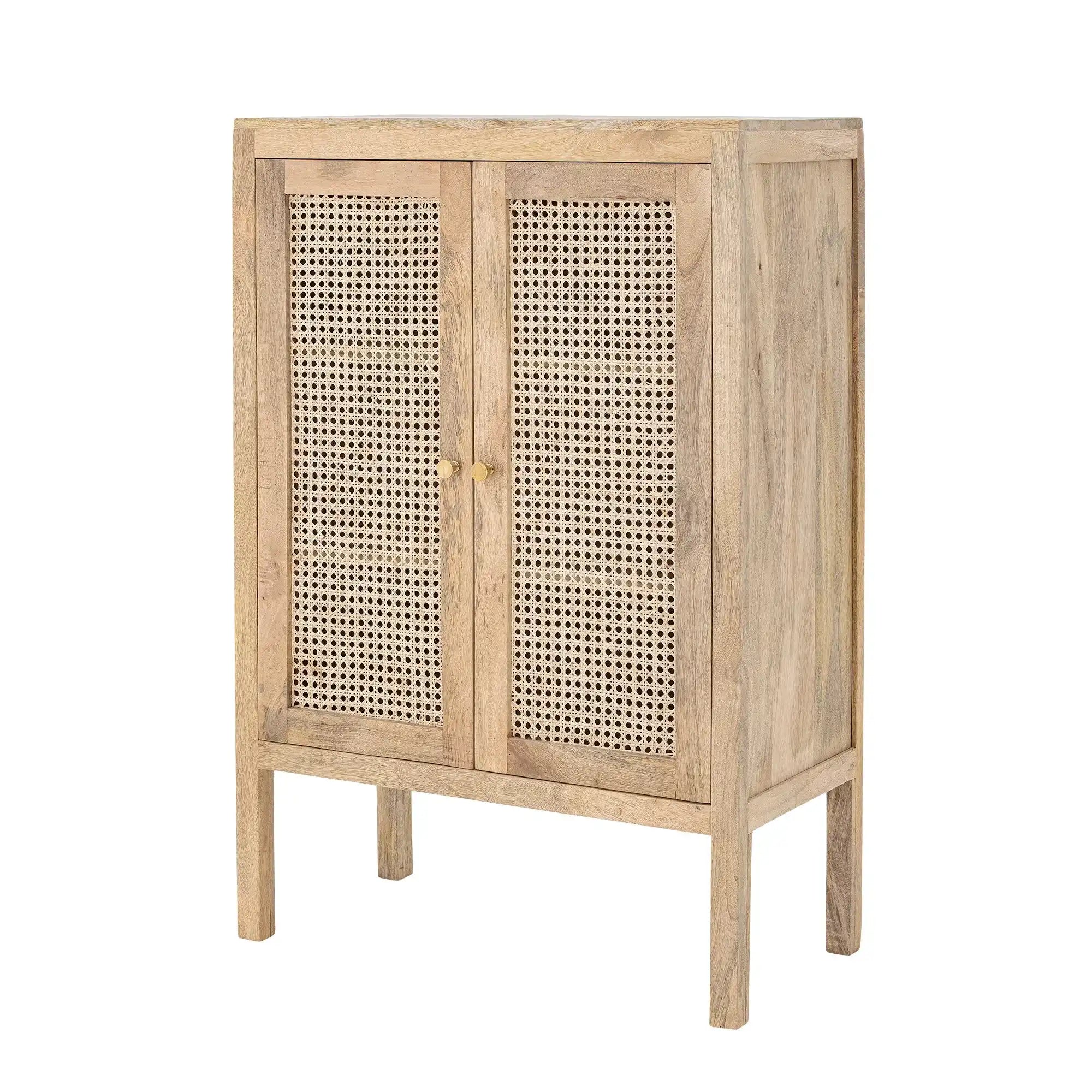 Details & materiaal: Met afmetingen b × h × d 30 × 105 × 75 cm biedt de kast een aangename hoogte en een bescheiden frontbreedte. Hij is uitgevoerd in FSC®Mix-mangohout en afgewerkt in een rustige beige/naturel tint die moeiteloos combineert. De deurpanelen met rietvlechtwerk geven het geheel lucht en diepte, terwijl de handgrepen in een messingfinish het strakke ontwerp elegant afronden. Deze materiaalmix houdt het meubel visueel licht, maar laat het toch solide en hoogwaardig aanvoelen. Bovendien kies je met FSC®Mix bewust voor hout uit verantwoord beheerde bronnen—een fijne gedachte bij een meubel dat lang mee mag.