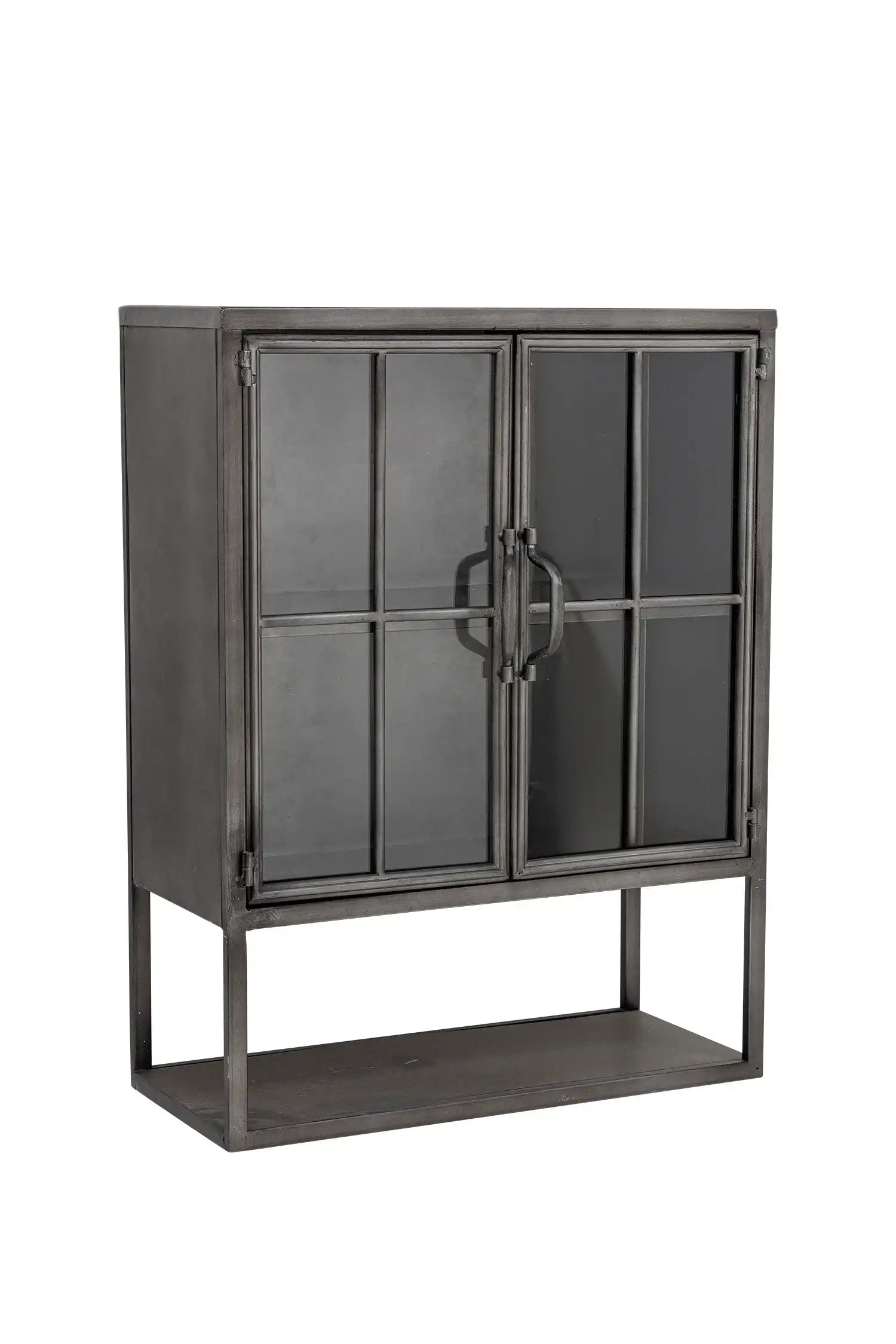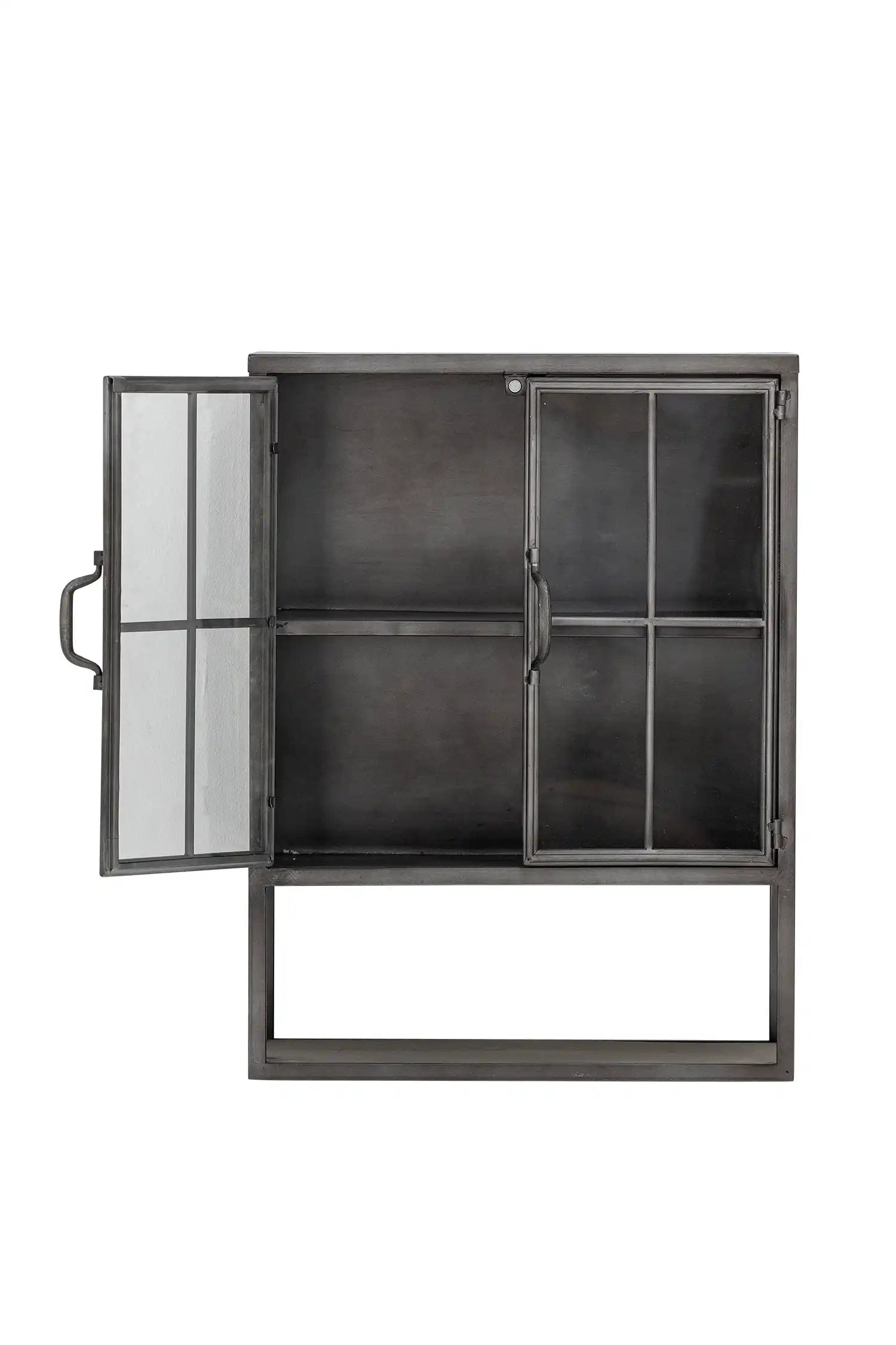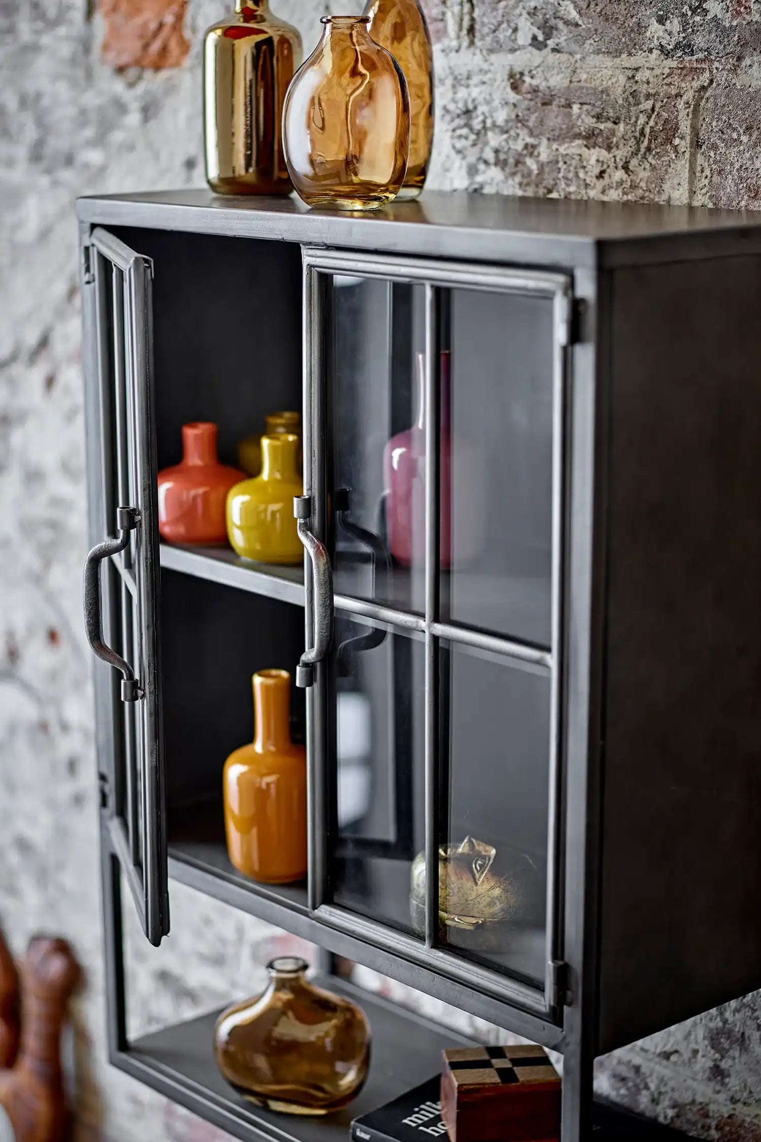 Details & materiaal: De kast is volledig vervaardigd uit zwart metaal en afgewerkt met glazen raampjes en zichtbare lasnaden, waardoor het meubel een uitgesproken karakter krijgt zonder aan verfijning in te boeten. Het formaat – 61 cm hoog, 46 cm diep en 21,5 cm breed – biedt volop ruimte voor je favoriete decoraties of bijzondere verzamelstukken, terwijl je dankzij het transparante glas altijd zicht houdt op jouw stijlvol ingerichte schappen.