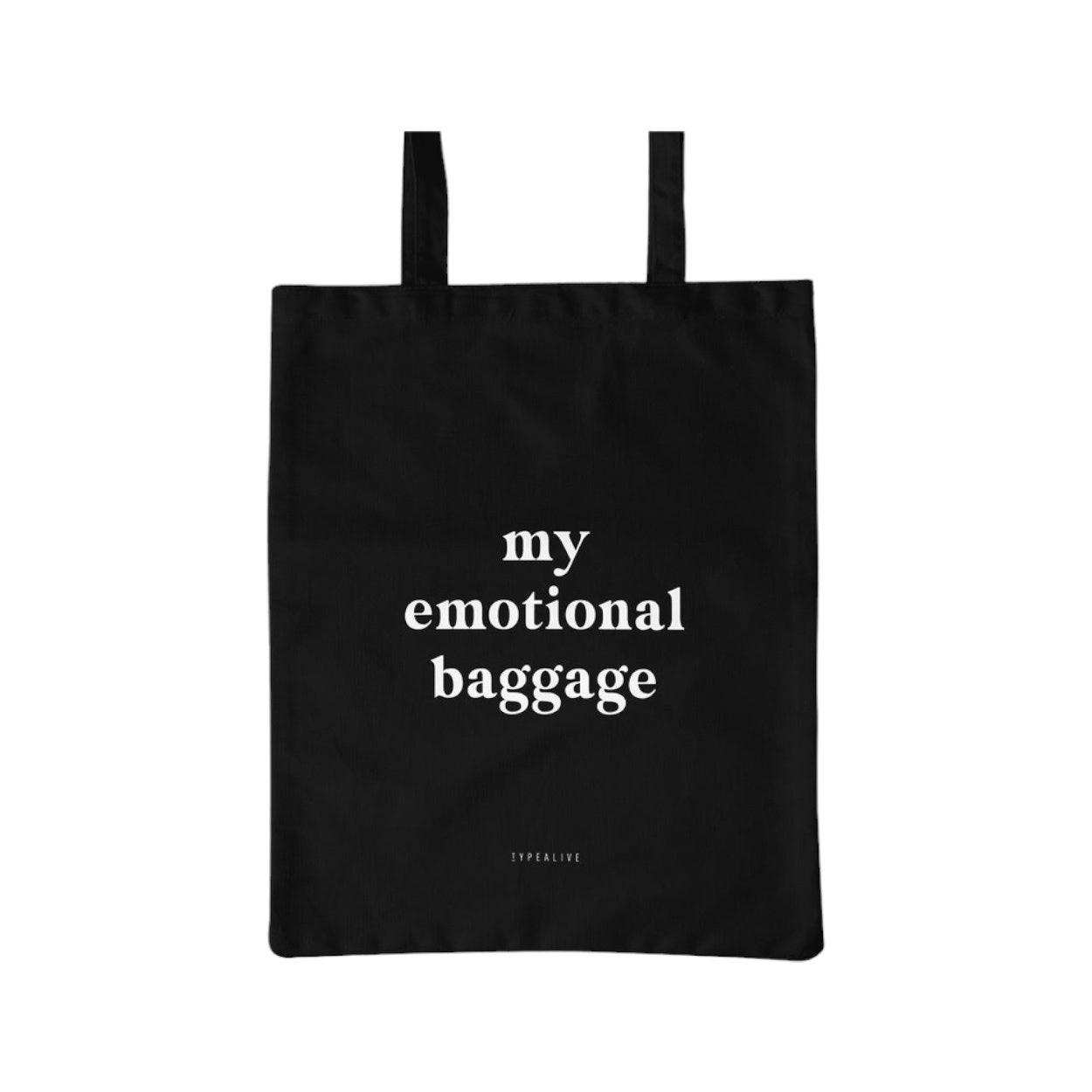 De Typealive Katoenen tas Baggage zwart is een stijlvolle en duurzame tas, perfect voor dagelijks gebruik. Op de zwarte tas staat in witte letters de tekst "My emotional baggage". Deze katoenen shopper, gemaakt van 100% oeko-tex gecertificeerd katoen, biedt zowel milieuvriendelijkheid als mode.