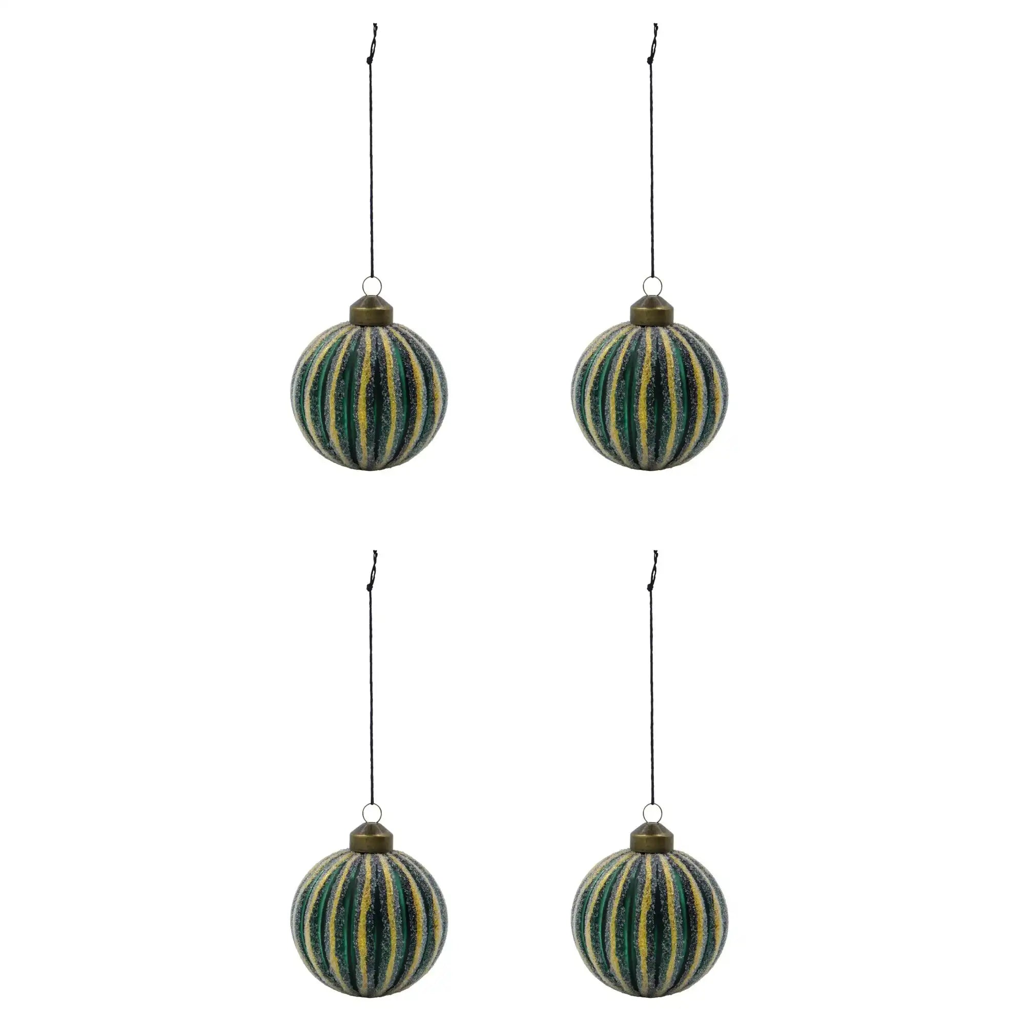 Elke ornament is met de hand gemaakt van mondgeblazen glas, afgewerkt in donkergroen met een zachte witte frosted streep. De set bevat vier stuks met elk een diameter van 8 cm. Hoewel ze een glasachtige uitstraling hebben, zijn ze gemaakt van kunststof en aluminium — licht van gewicht én stevig. Daardoor hang je ze moeiteloos op, waar je maar wilt.