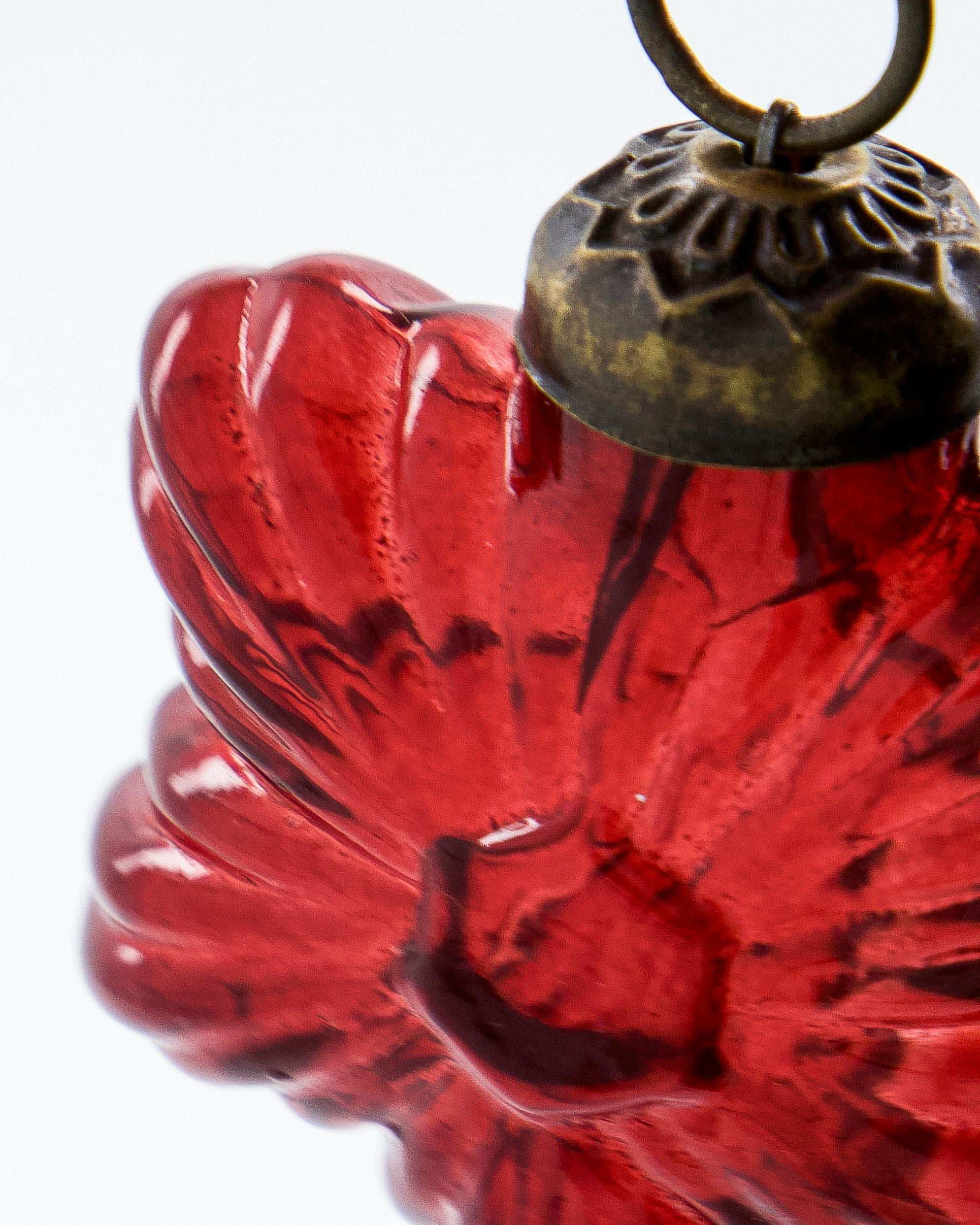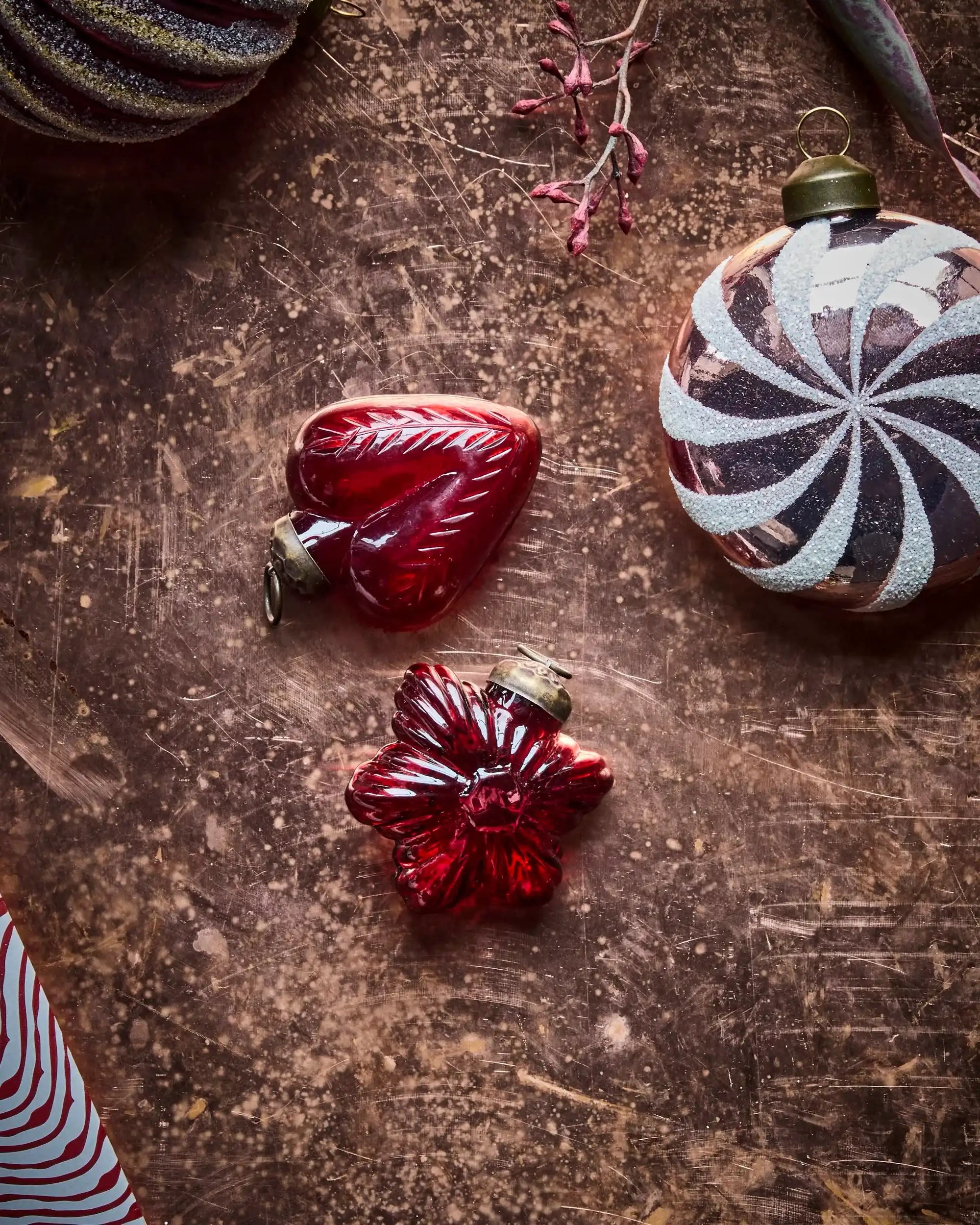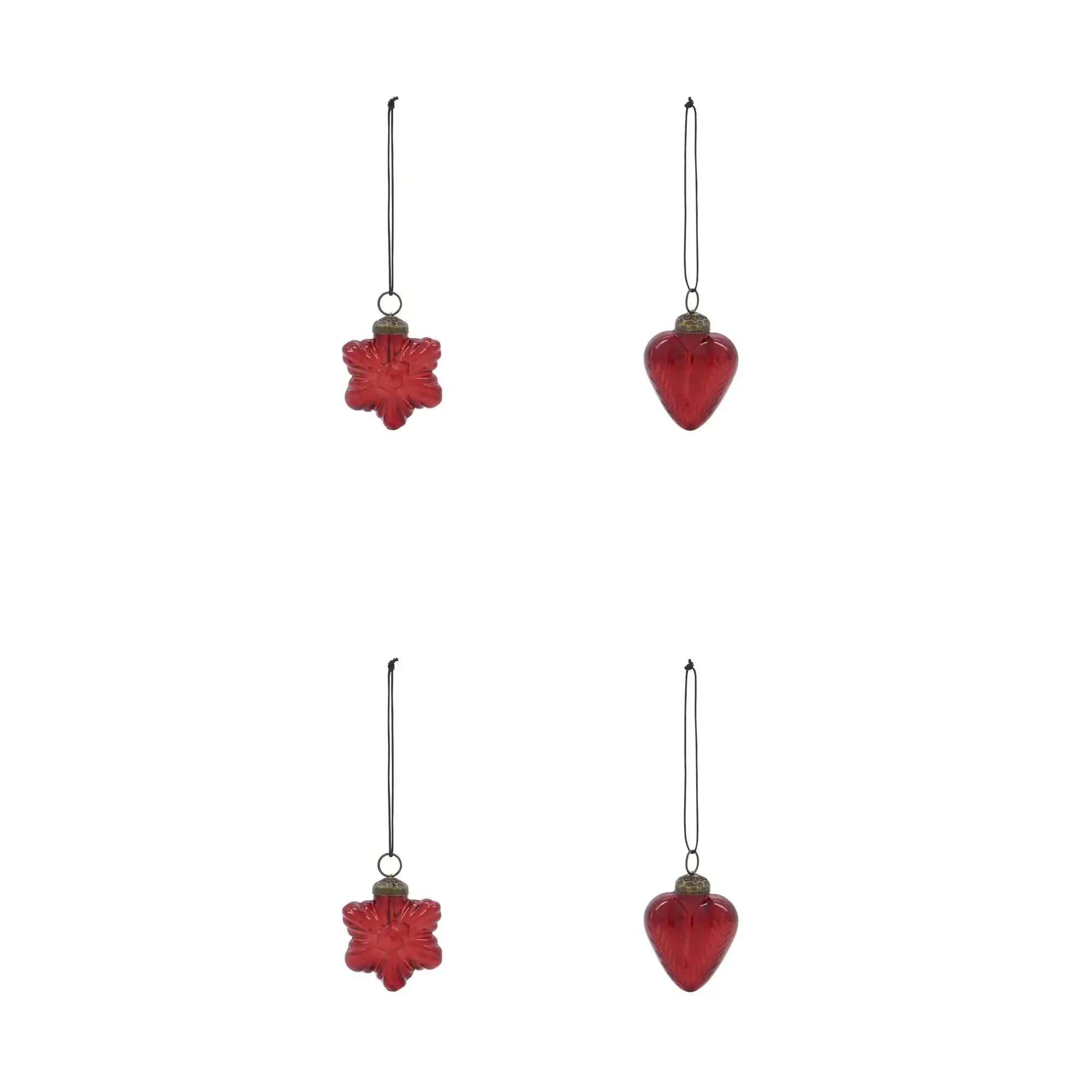 De set bestaat uit vier handgemaakte versieringen: twee in hartvorm en twee in ster- of bloemvorm. Ze zijn gemaakt van donkerrood glas en afgewerkt met subtiele messing accenten. Dankzij de afmetingen van circa 4,5 tot 5 cm breed en 5,5 tot 6 cm hoog creëren ze een mooi, evenwichtig geheel. De katoenen ophangdraad zorgt voor een eenvoudige bevestiging.