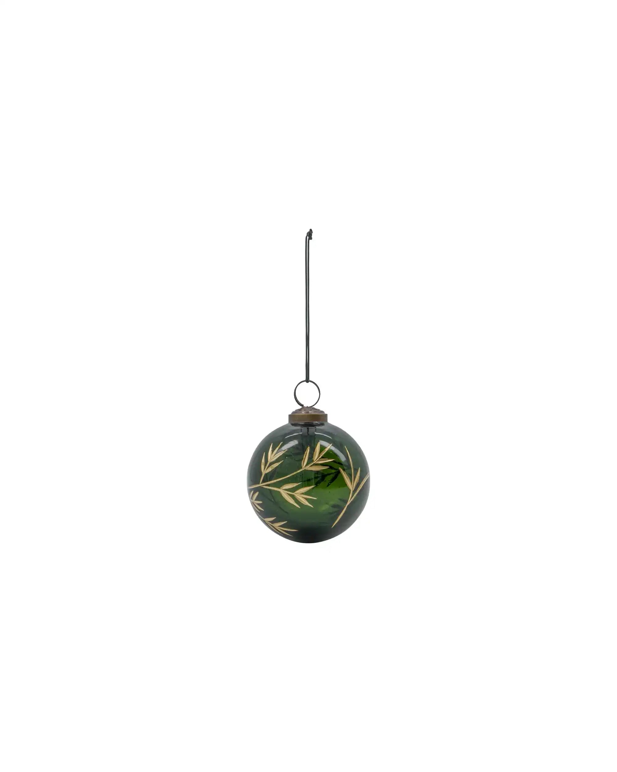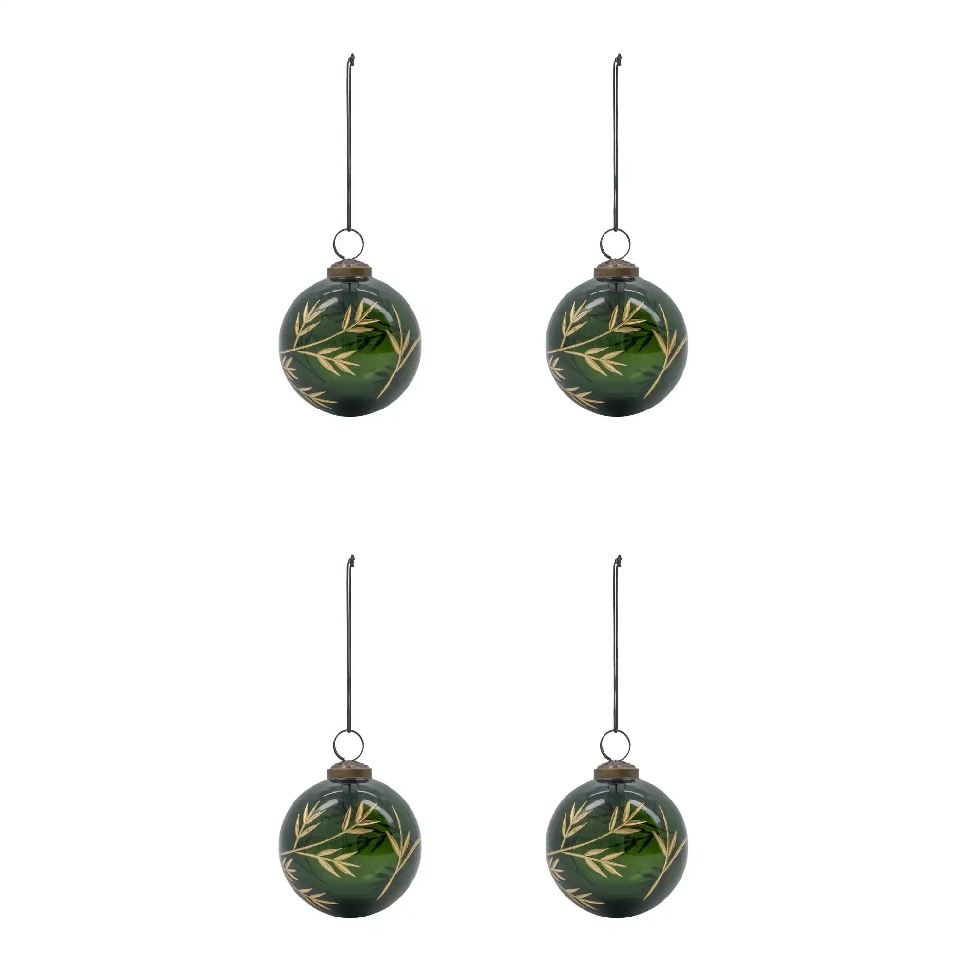 De glazen ornamenten hebben een diameter van 7,5 cm en zijn met zorg traditioneel geslepen. Elk exemplaar is met de hand beschilderd in groen met gouden accenten, wat ze een uniek en ambachtelijk karakter geeft. De set bestaat uit vier stuks, die samen een harmonieuze en chique uitstraling creëren — jaar na jaar opnieuw te gebruiken.