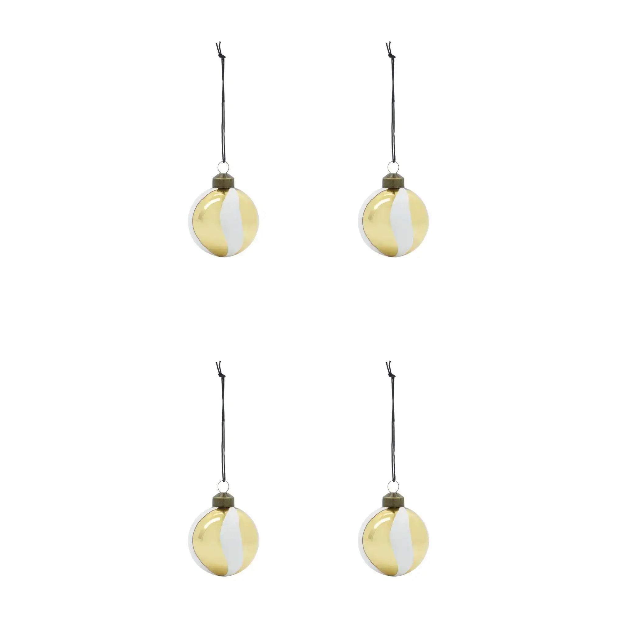 Deze set bestaat uit vier glazen ornamenten met een diameter van 6 cm. Elk item heeft een gouden basis die overloopt in een speelse twist van witte glitters. Het delicate mondgeblazen glas wordt aangevuld met een katoenen lus, waarmee je ze moeiteloos ophangt aan tak of haak.