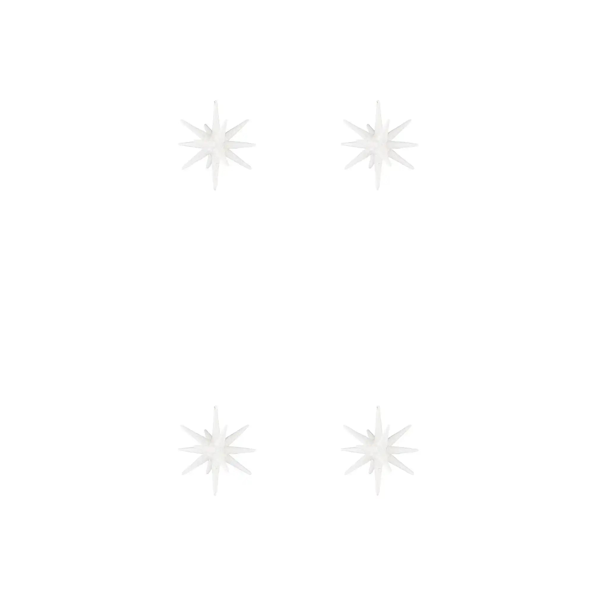 De set bestaat uit vier sterren, vervaardigd uit glas en afgewerkt met een fijne witte glitterlaag. Elke ster heeft een diameter van 7,5 cm en voelt licht en verfijnd aan. De transparantie combineert moeiteloos met zilvertinten of natuurlijke materialen voor een harmonieuze uitstraling.