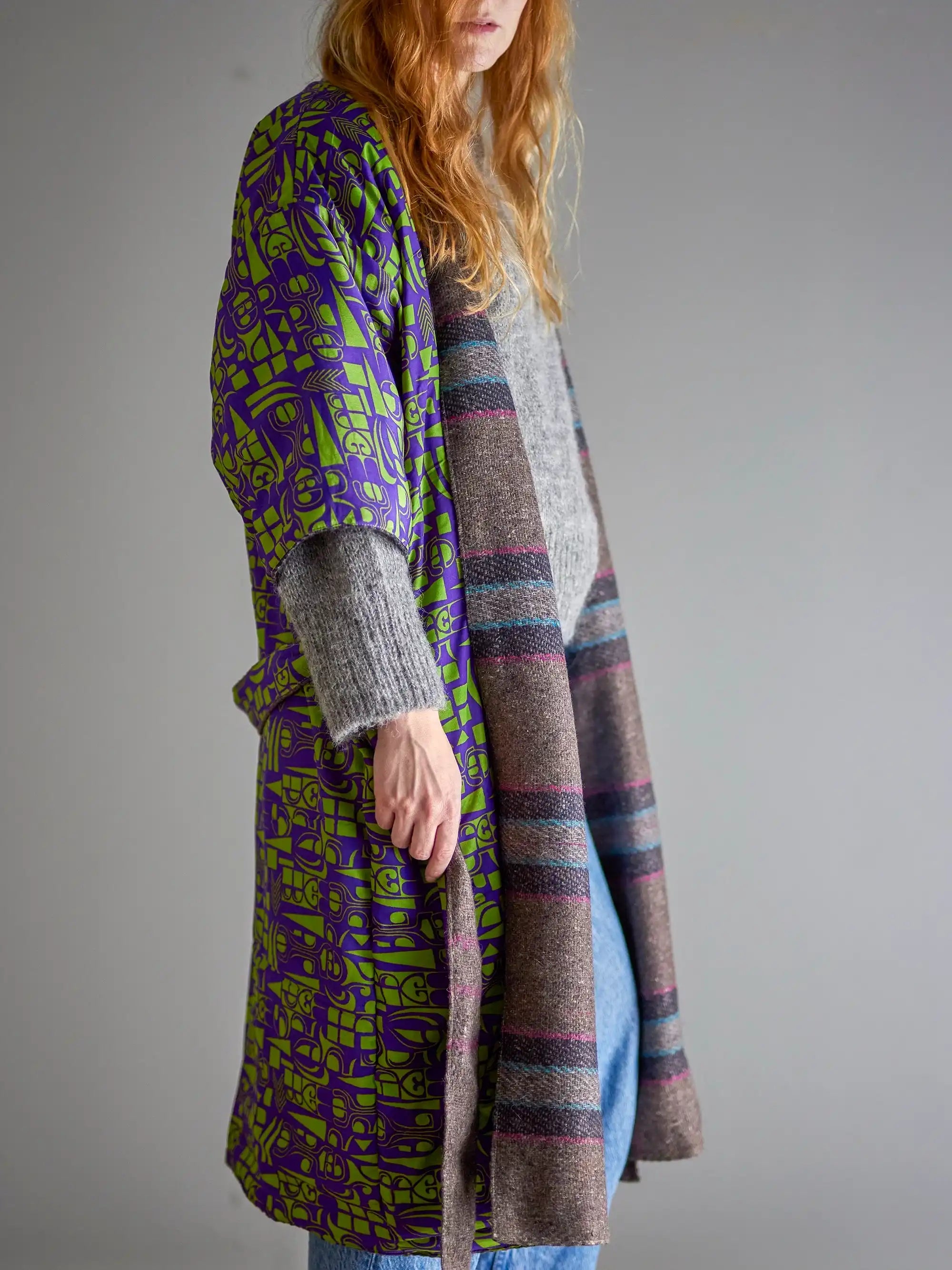 Details & materiaal: De Rieti Kimono is gemaakt van geüpcyclede materialen: één zijde bestaat uit wollen dekens in een grijze tint met praktische zakken; de andere zijde is vervaardigd van vintage sari’s met een uniek patroon — geen twee zijn hetzelfde. Het omkeerbare karakter levert je twee sferen in één kledingstuk op, waardoor combineren moeiteloos gaat. De ceintuur zorgt voor een flatterende, verstelbare pasvorm die met je meebeweegt. Door te kiezen voor geüpcycled materiaal krijgt bestaand textiel een tweede leven en beperk je verspilling, zonder in te leveren op uitstraling.