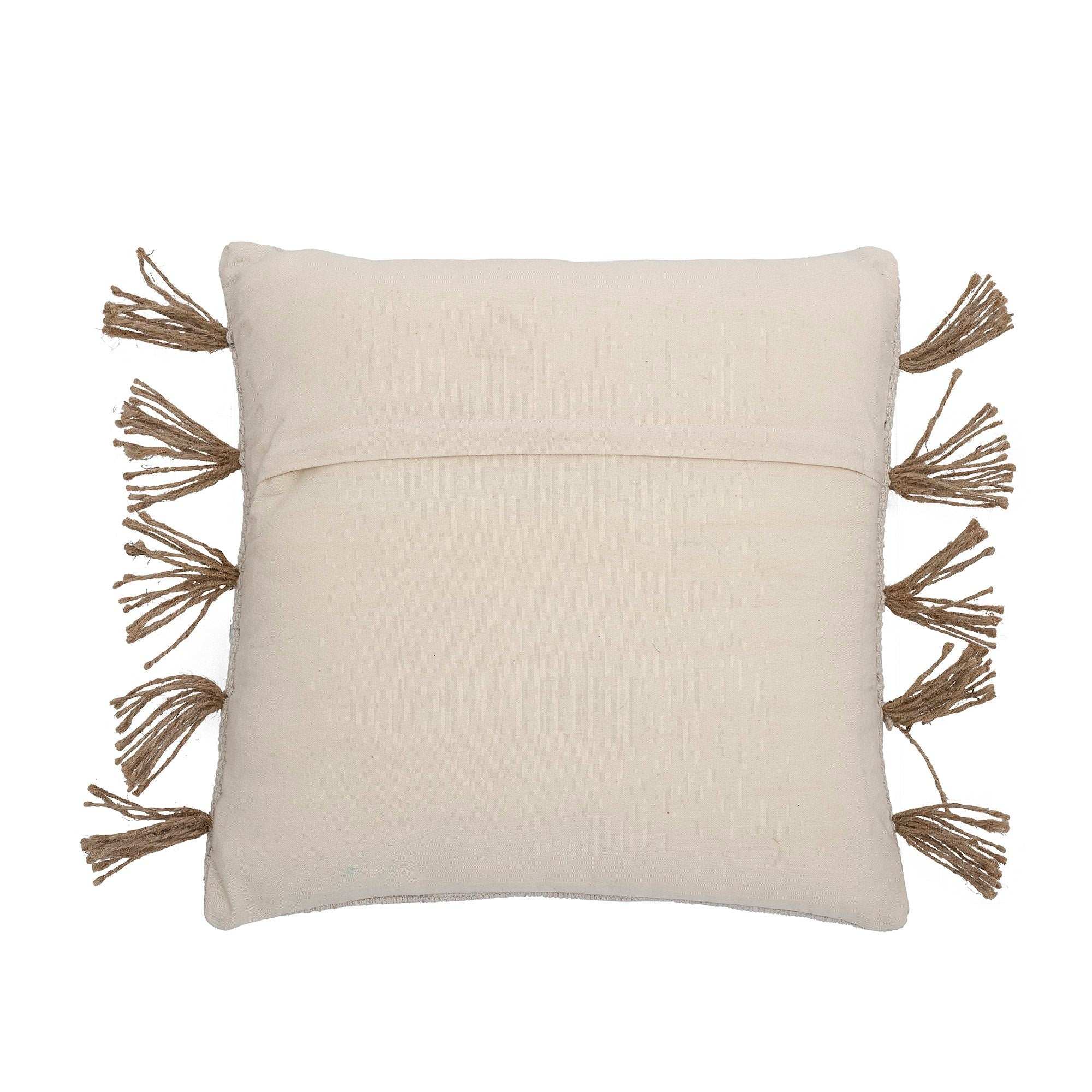 Details & materiaal: Het kussen is vervaardigd van gerecycled katoen en afgewerkt met kwastjes in jute. De structuur is bewust wat grover geweven, wat de stof karakter geeft en visuele gelaagdheid toevoegt zonder druk te ogen. De tijdloze beige/naturel kleur maakt combineren eenvoudig: van ton-sur-ton settings tot contrast met donker hout of frisse wittinten. Dankzij de robuuste textuur voelt het kussen kwalitatief en rijk aan, een fraai accent dat moeiteloos meebeweegt met seizoenen en trends.