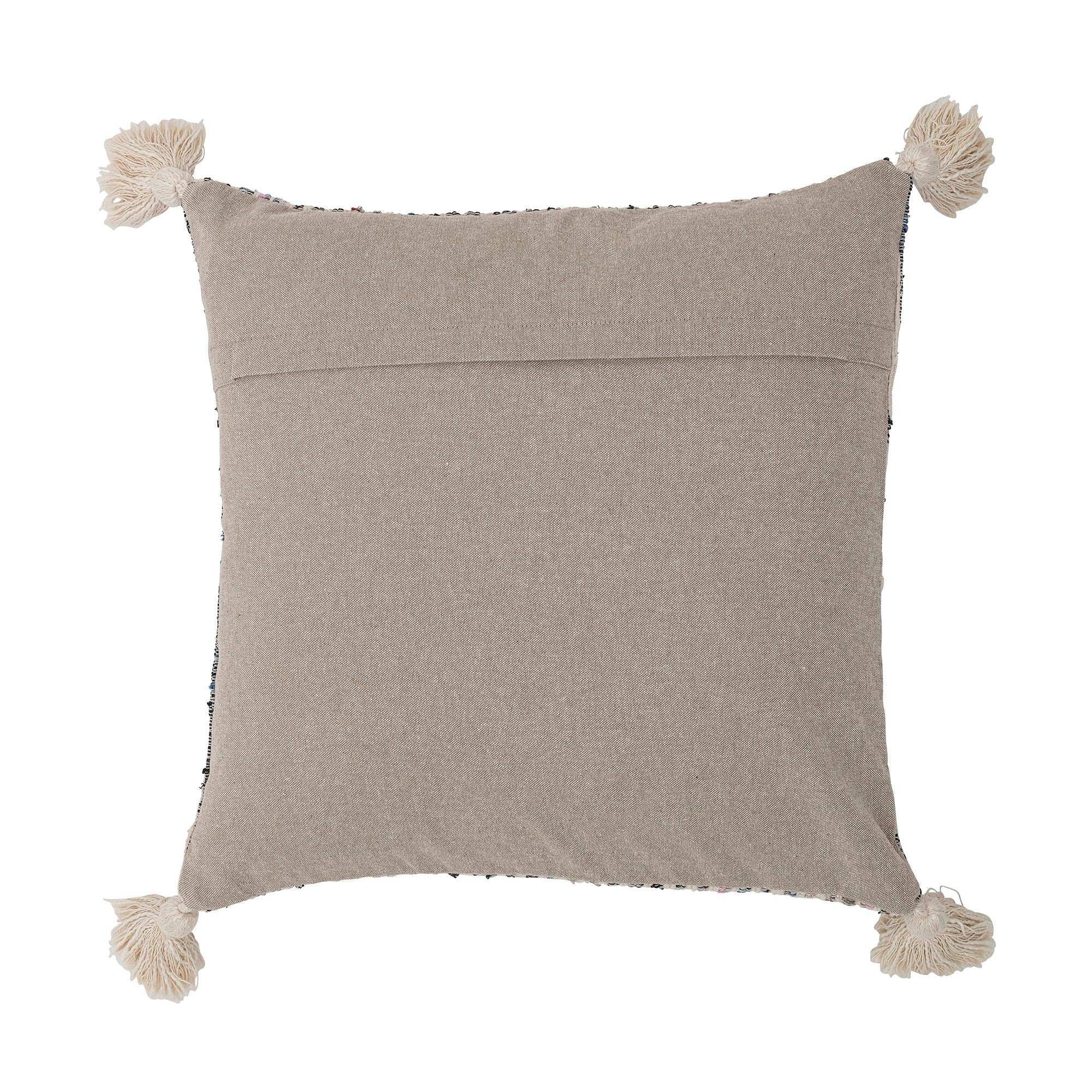 Details & materiaal: Het kussen is uitgevoerd in zacht katoen, waardoor het prettig aanvoelt en er een mooie, natuurlijke textuur zichtbaar blijft. De geweven linten in verschillende kleuren zorgen voor subtiele kleuraccenten die moeiteloos aansluiten bij lichte houttinten, wol en andere Scandinavische materialen. Kwastjes op de vier hoeken geven het ontwerp een speels randje en zorgen voor extra gelaagdheid. De beige/naturel tint maakt combineren eenvoudig: je tilt er een serene basis mee op zonder te overheersen, terwijl de linten net genoeg karakter toevoegen voor een persoonlijke touch.
