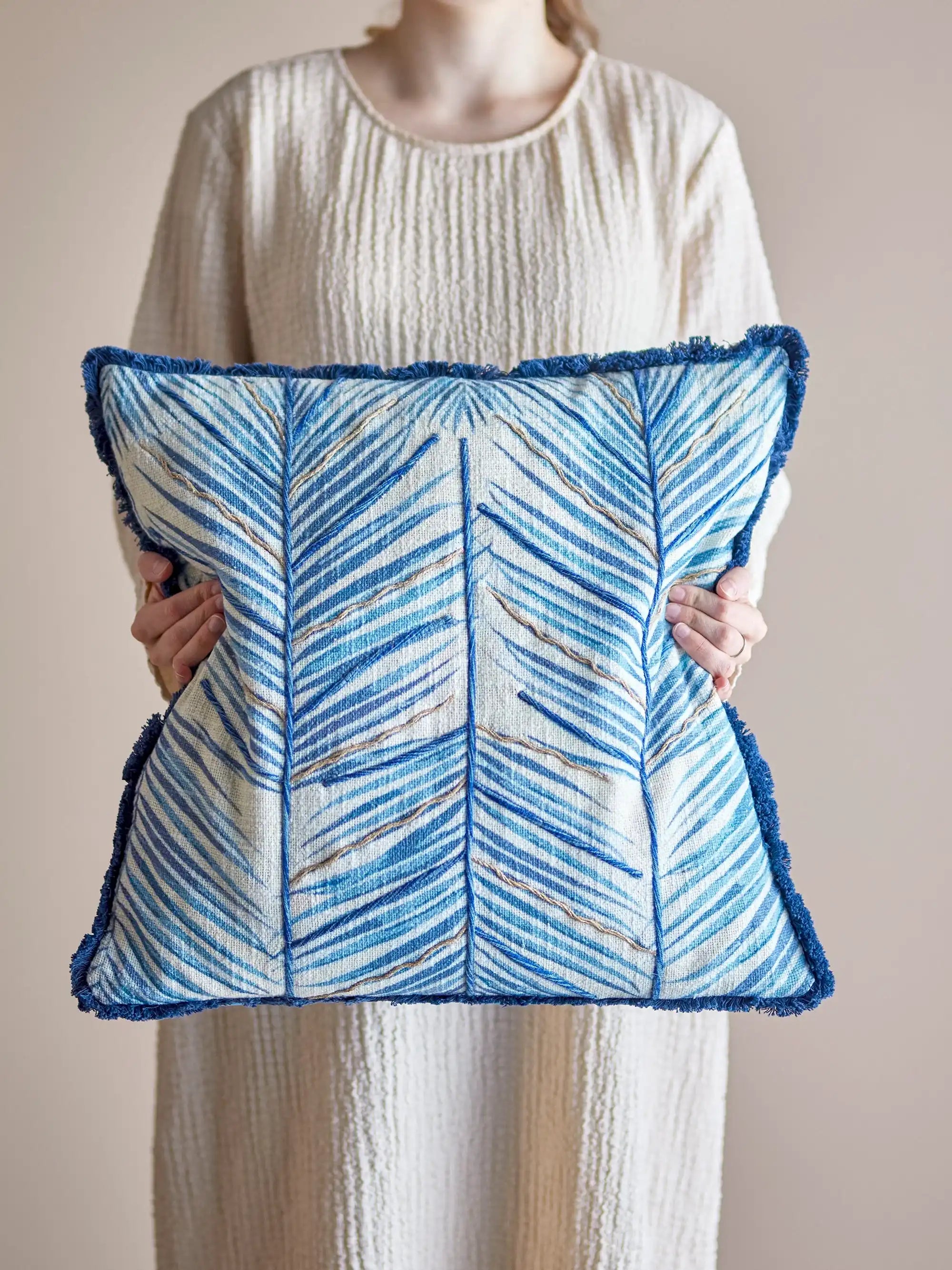 Details & materiaal: Het kussen is gemaakt van katoen en is afgewerkt met een lichte structuur die prettig aanvoelt. De polyester vulling zorgt voor comfortabele ondersteuning en houdt de vorm mooi. De achterkant is uitgevoerd in effen blauw katoen; zo wissel je in een handomdraai van uitgesproken naar ingetogen. De smalle franjes omlijsten het kussen subtiel, terwijl de geborduurde details op de voorkant voor een verfijnde, ambachtelijke touch zorgen. Samen maken ze van Laval een verzorgd accent dat iedere bank of fauteuil verrijkt.
