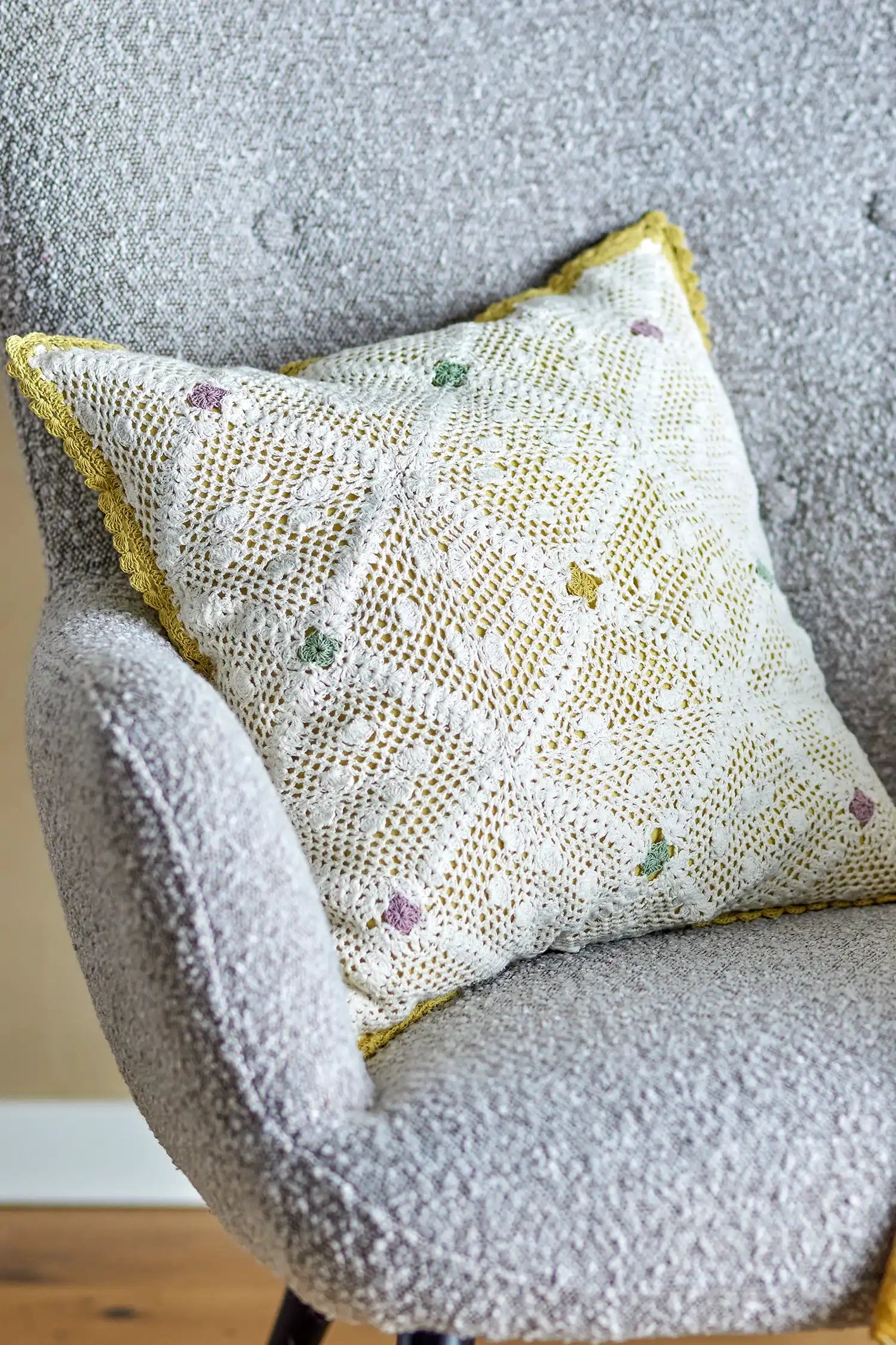 Details & materiaal: Dit handgemaakte kussen is vervaardigd uit hoogwaardig katoen en fraai gehaakt in een verfijnd patroon van 45 x 45 cm. Het lichte naturel combineert subtiel met de kleurrijke accenten, waardoor een harmonieus geheel ontstaat dat jarenlang mooi blijft.