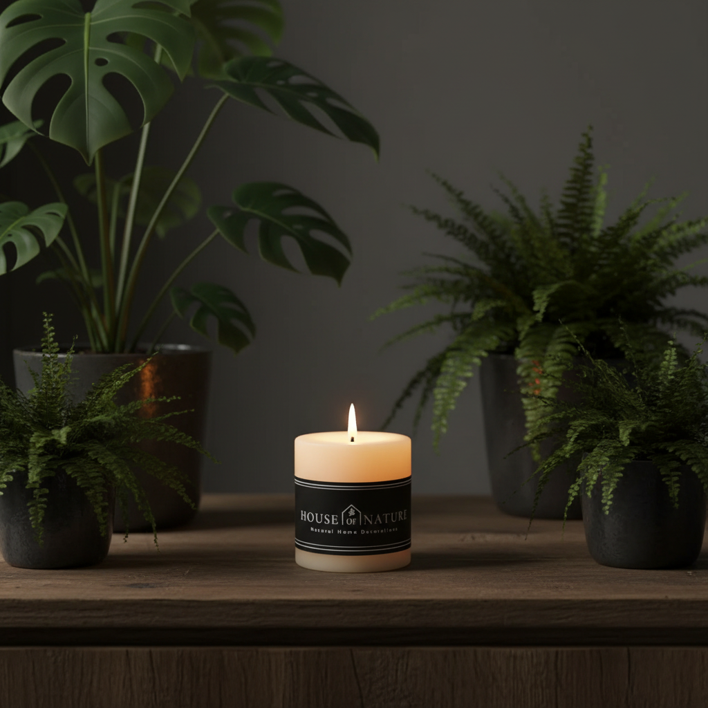 Combineer meerdere crème ledkaarsen van verschillende hoogtes op een houten schaal of in een glazen stolp voor een zachte, rustgevende uitstraling.