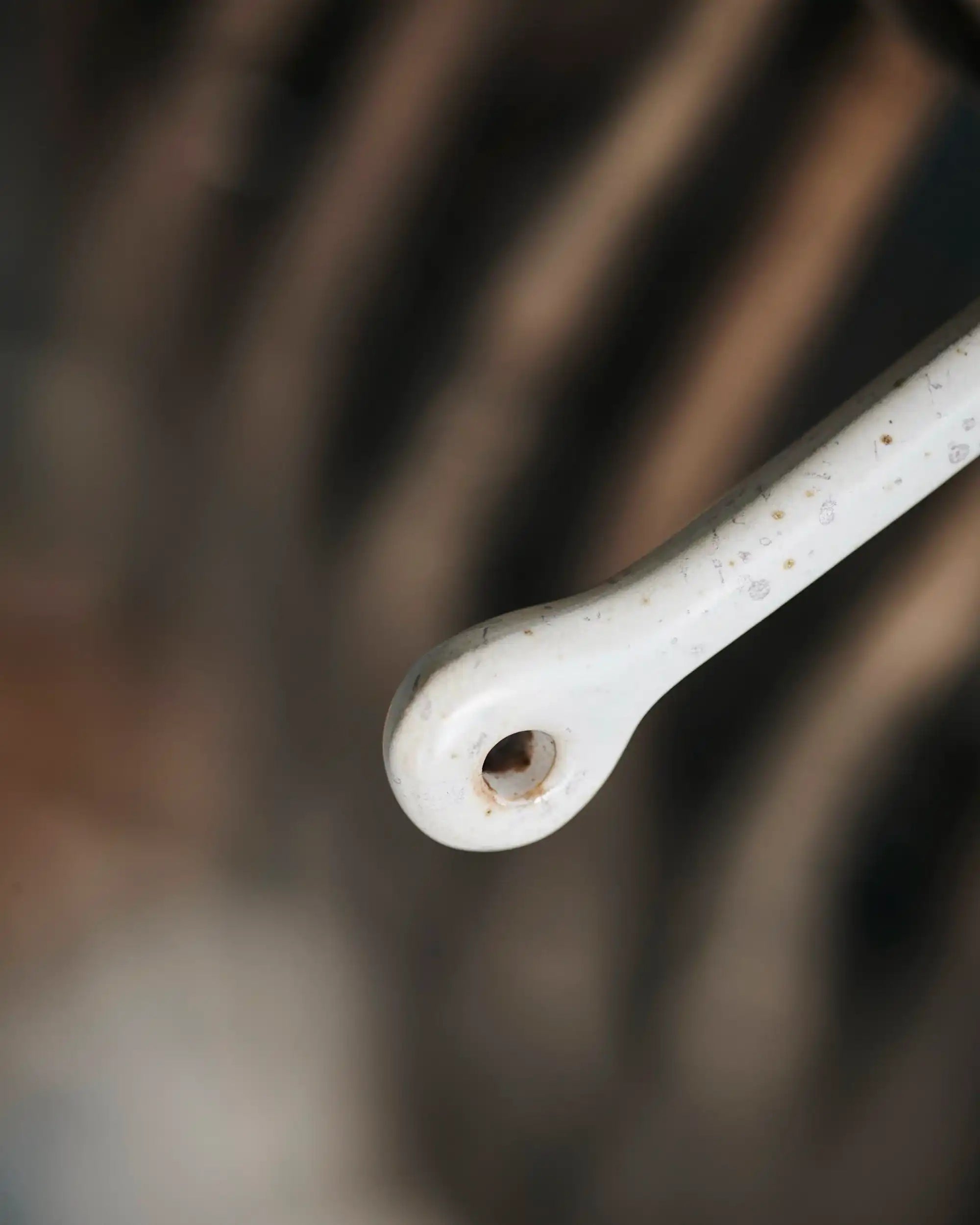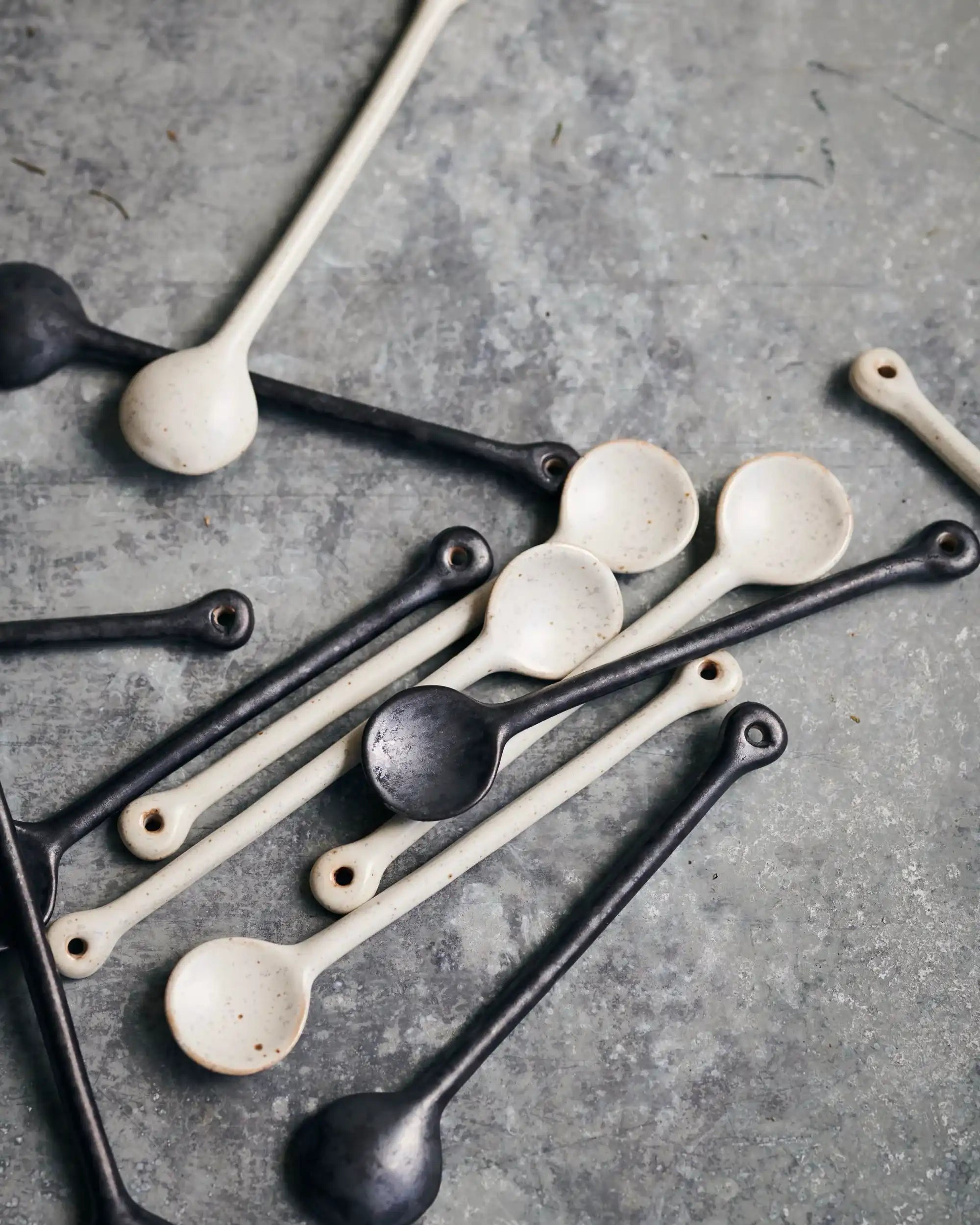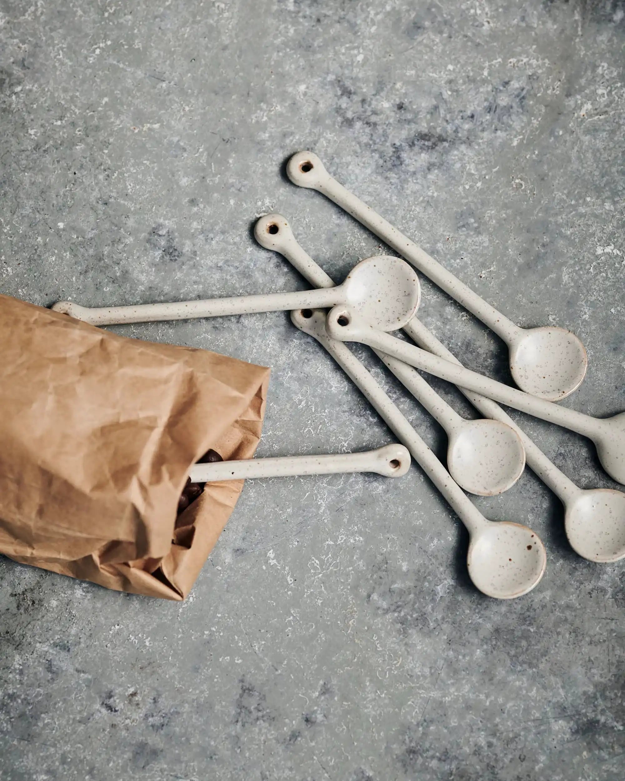 De lepel is gemaakt van hoogwaardig aardewerk en vormt met zijn lengte van 14 cm een fijne aanvulling op mokken en bekers. Het gladde glazuur in zacht grijs-wit contrasteert mooi met andere texturen en maakt hem geschikt voor casual én verfijnde serviescombinaties. De afgeronde vorm en dunne steel zorgen voor een prettige balans in de hand.