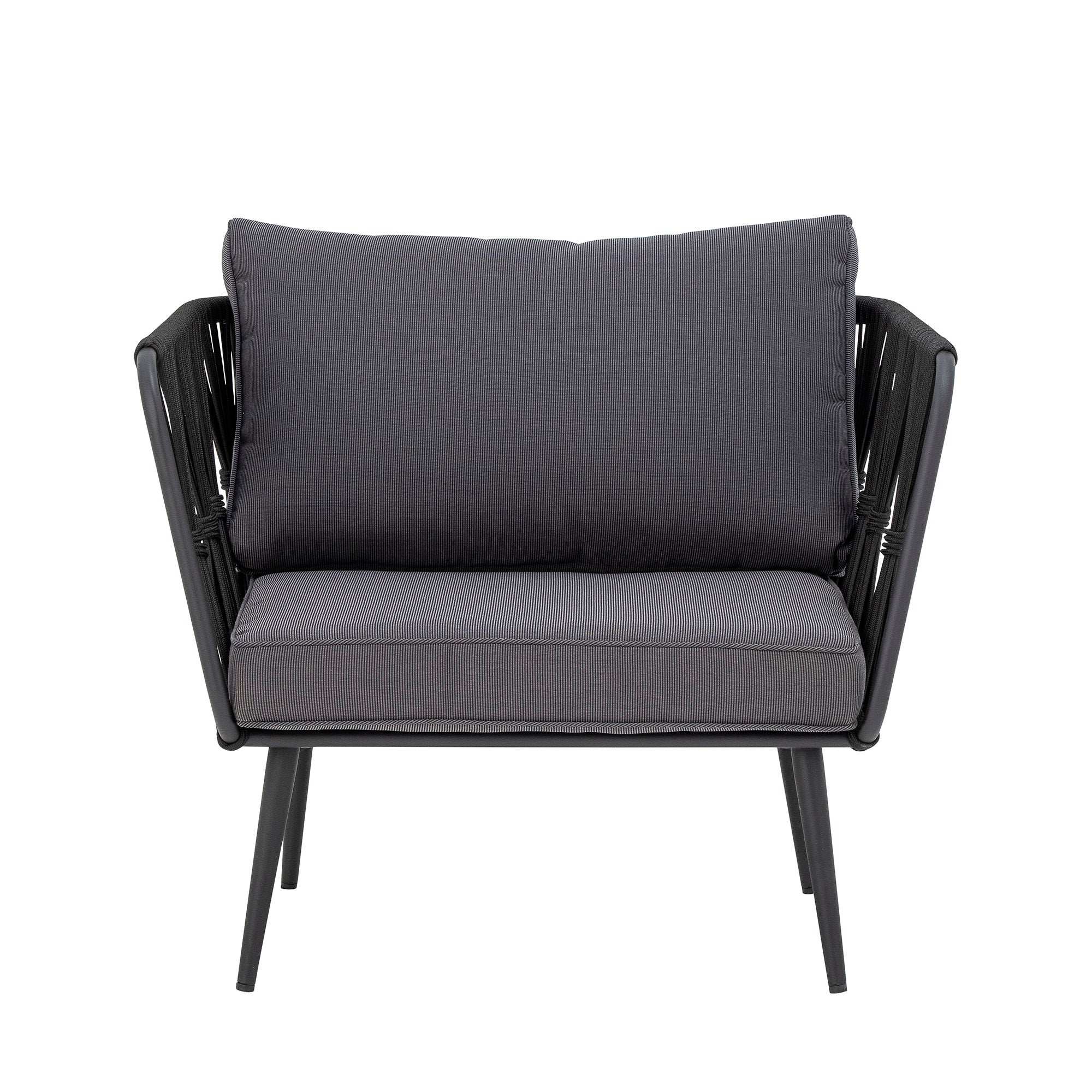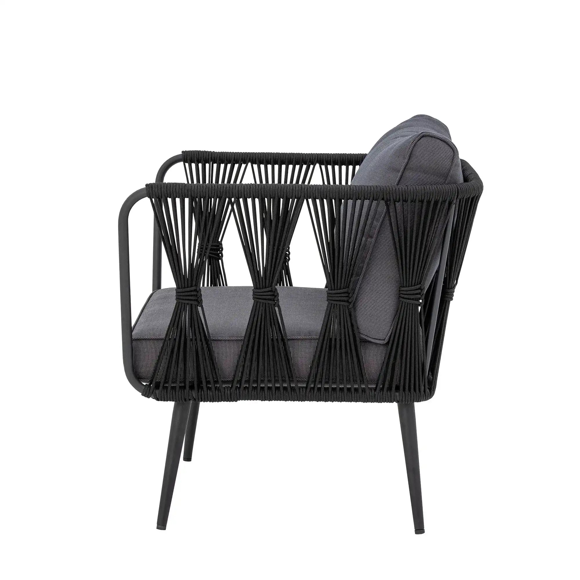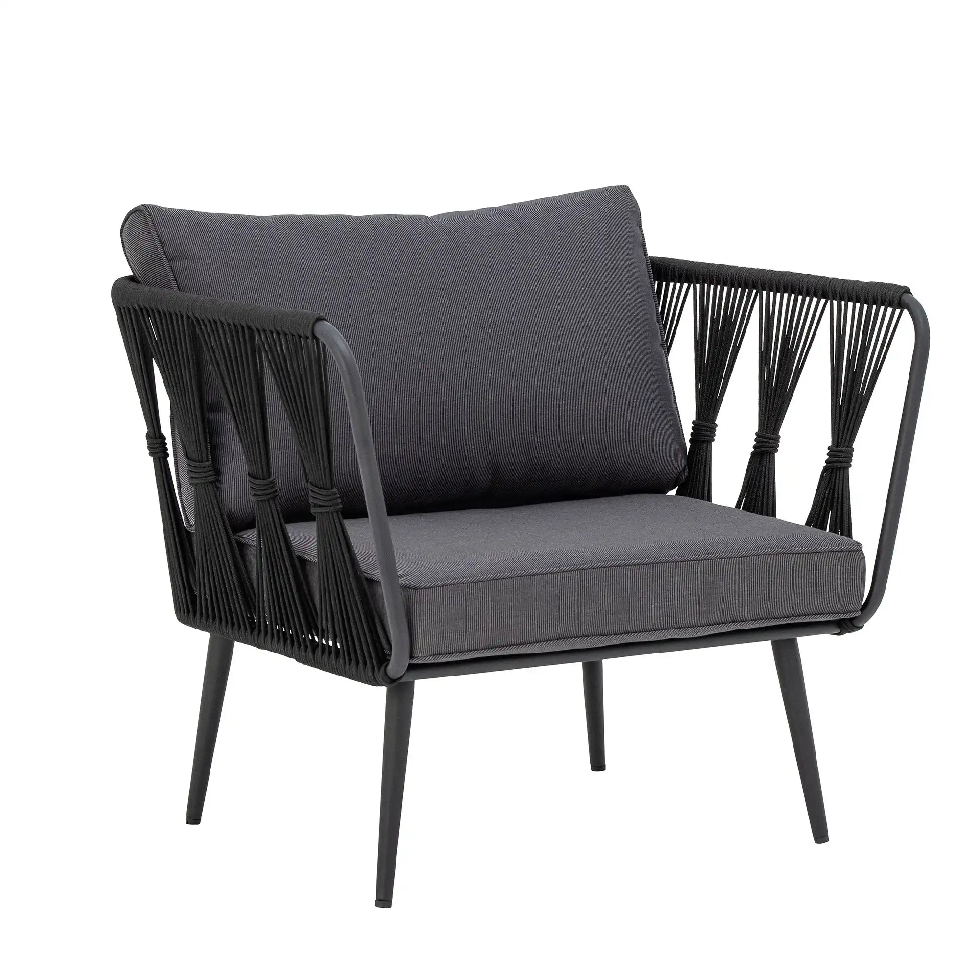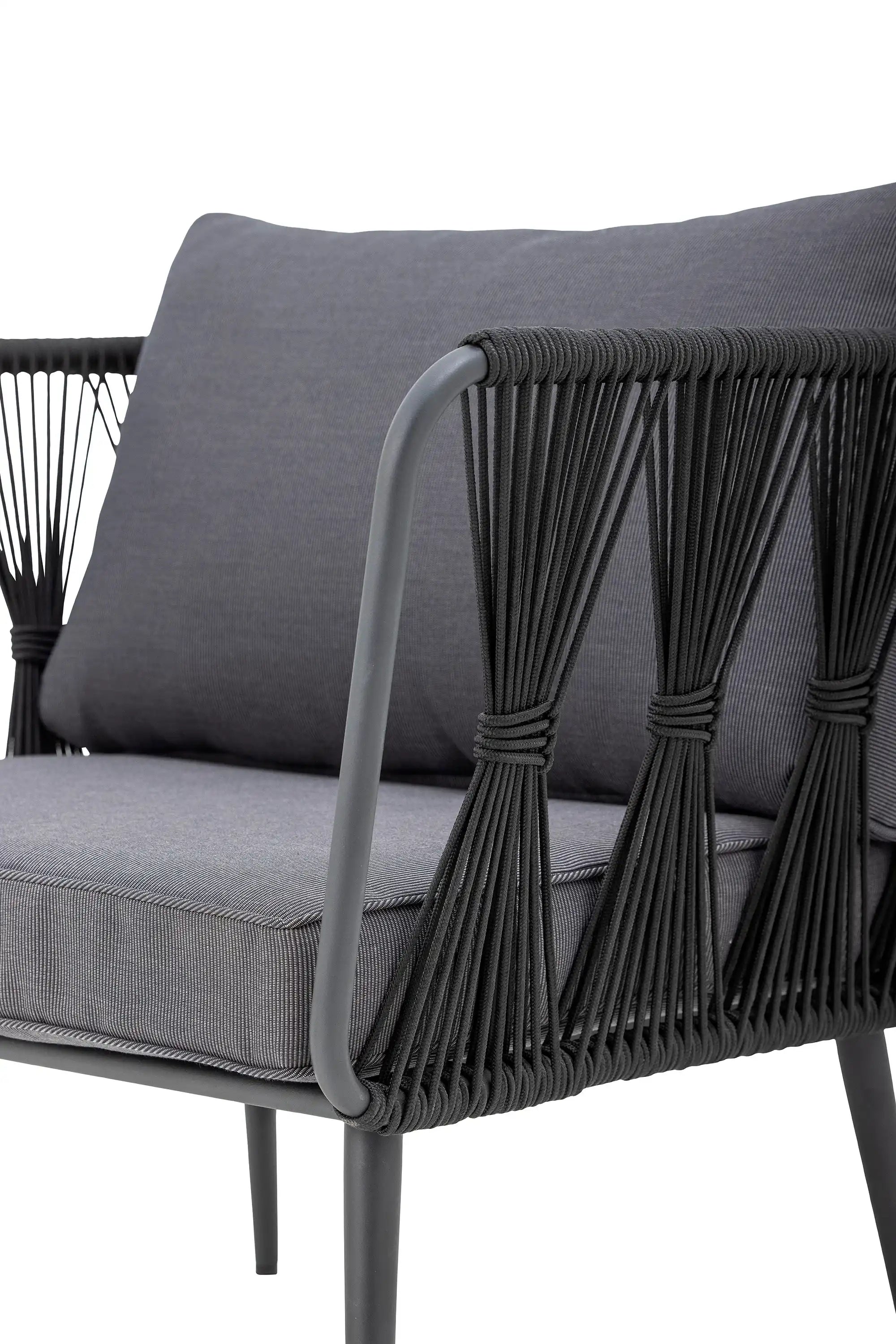 Details & materiaal: Deze comfortabele loungestoel is vervaardigd uit stevig, gepoedercoat zwart metaal en voorzien van een prachtig handgevlochten touw van polyester. De bijpassende, donkergrijze kussens zijn niet alleen heerlijk zacht, maar je kunt de hoezen bovendien gemakkelijk op 30 graden wassen. Dankzij het gebruik van duurzame materialen en brandvertragende kussens (volgens UK FR-regelgeving) geniet je van veiligheid én langdurig plezier in de buitenlucht.