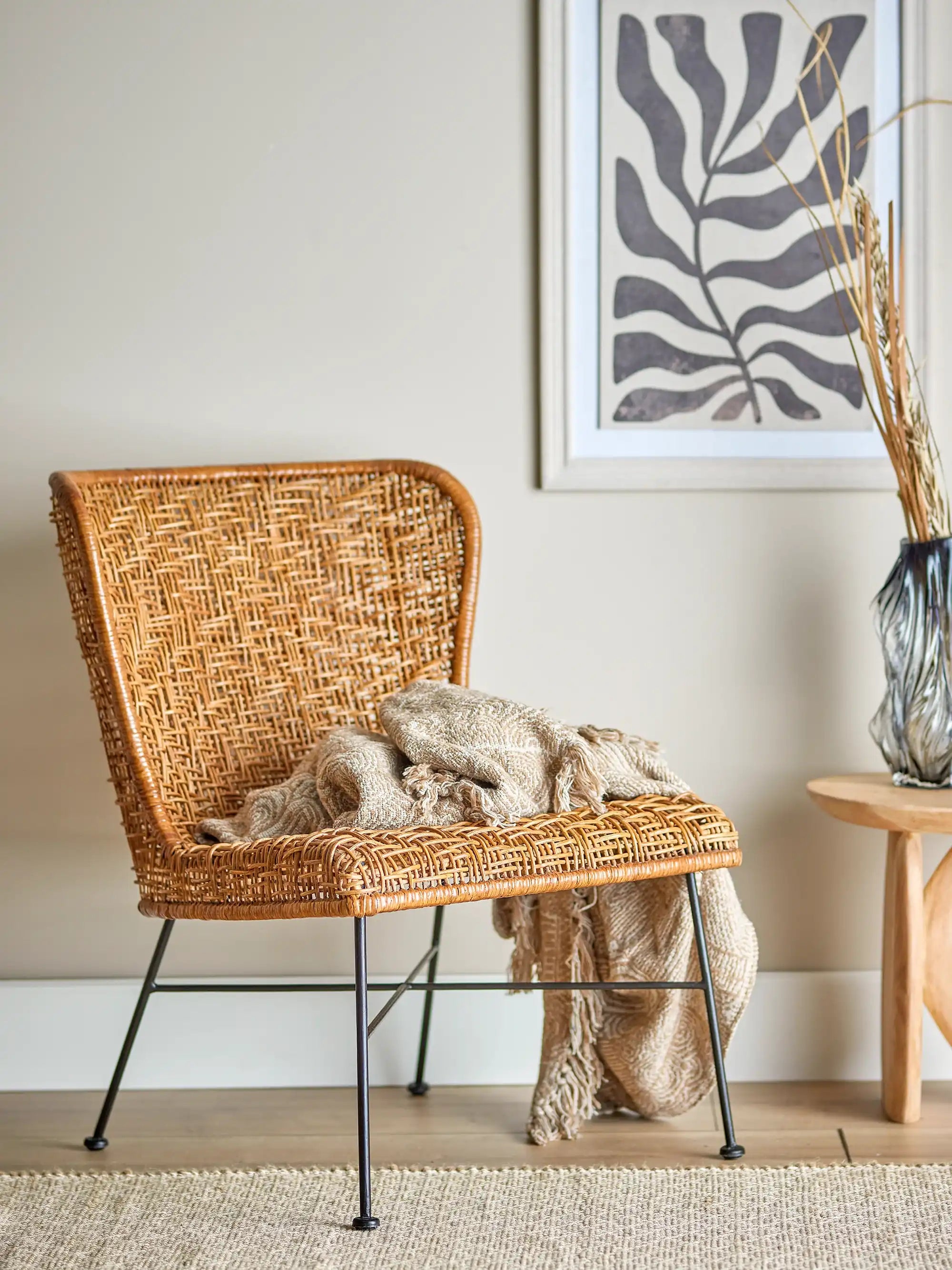 Scandinavisch design & natuurlijk materiaal: Deze loungestoel is met de hand gevlochten van stevig rotan in een natuurlijke kleur, waardoor hij een luchtige, uitnodigende uitstraling krijgt. Het slanke onderstel van ijzer geeft het geheel een moderne twist en zorgt voor extra stabiliteit, terwijl de royale afmetingen (59,5 x 81,5 x 69 cm) zorgen dat je heerlijk kunt wegzakken, zowel alleen als met een goed boek.