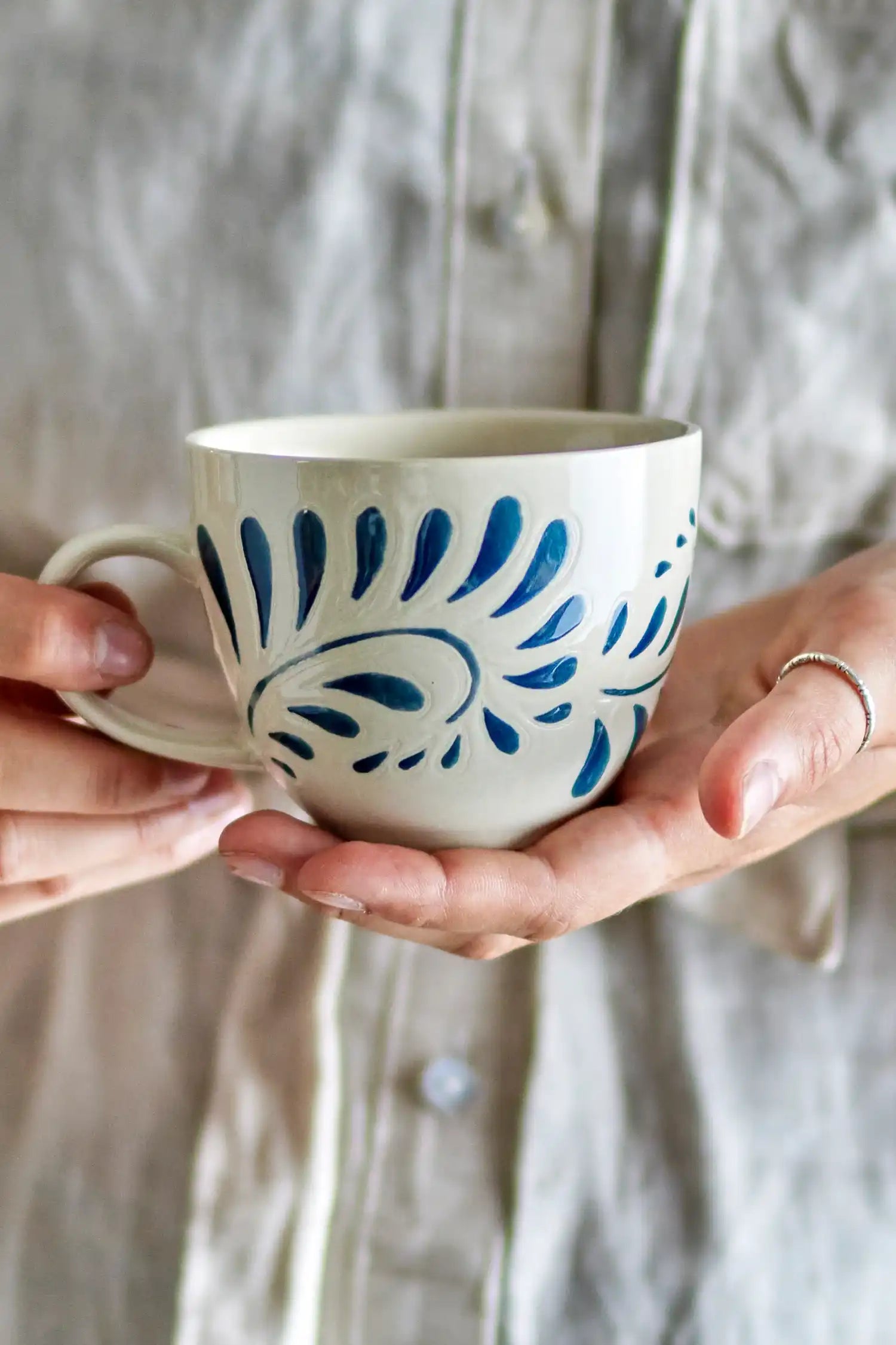 Verrassende details & natuurlijk materiaal: De mok is zorgvuldig vervaardigd uit robuust aardewerk, voorzien van een licht glanzende blauwe glazuur en subtiel reliëf. Dankzij zijn diameter van 9,5 cm en hoogte van 7,5 cm ligt hij prettig in de hand, en zorgt het unieke, handgemaakte ontwerp voor variatie in elke mok.