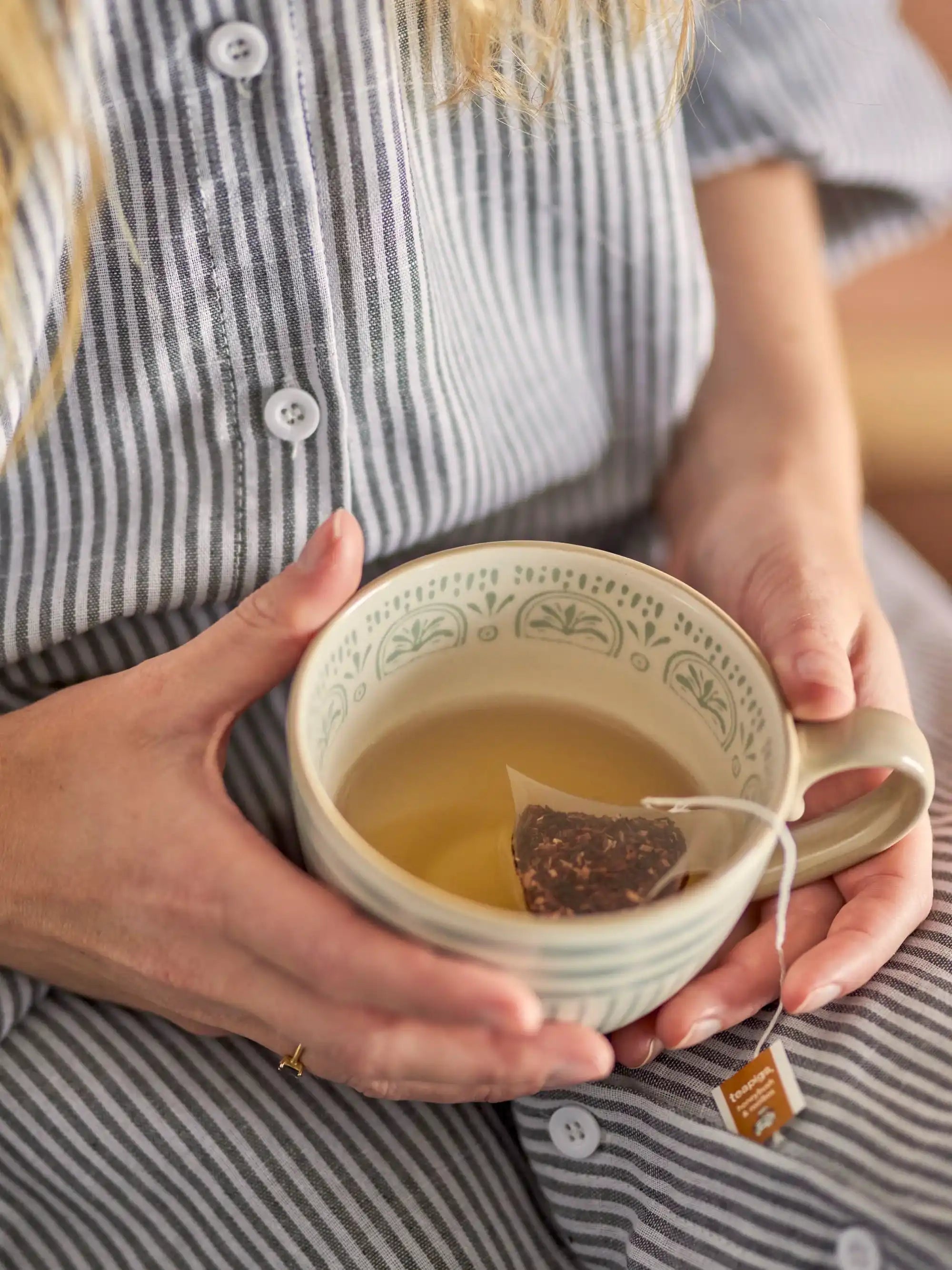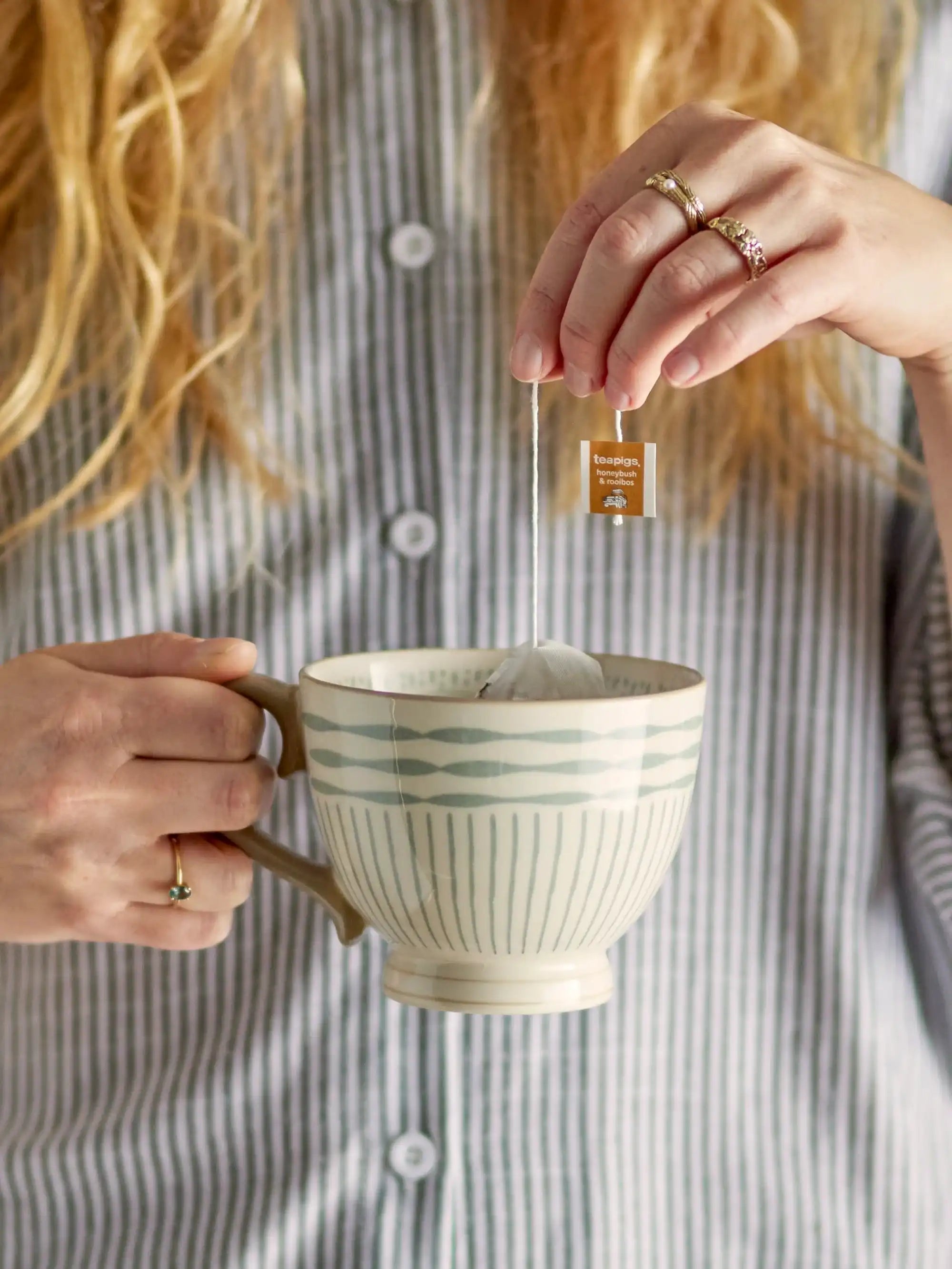 Details & materiaal: Gemaakt van stevig aardewerk dat solide aanvoelt en er fraai uitziet. De mok meet ø 11 cm en is 9 cm hoog: een prettig formaat voor je favoriete warme dranken. Het comfortabele oor zorgt voor een fijne grip, terwijl het gestreepte decor subtiel ritme toevoegt aan je gedekte tafel. De combinatie van groen met blauwe strepen laat zich eenvoudig combineren met effen serviesstukken of andere patronen.