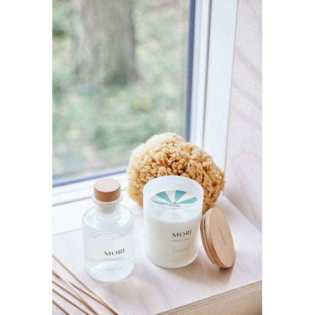 Creëer de perfecte sfeer met een geurkaars. De Mori Geurkaars wordt geleverd in een transparante glazen houder met een frisse geur van den en cipres. Of je nu de kaars in de badkamer of woonkamer plaatst, de geur voegt een verfrissende touch toe aan je huis.