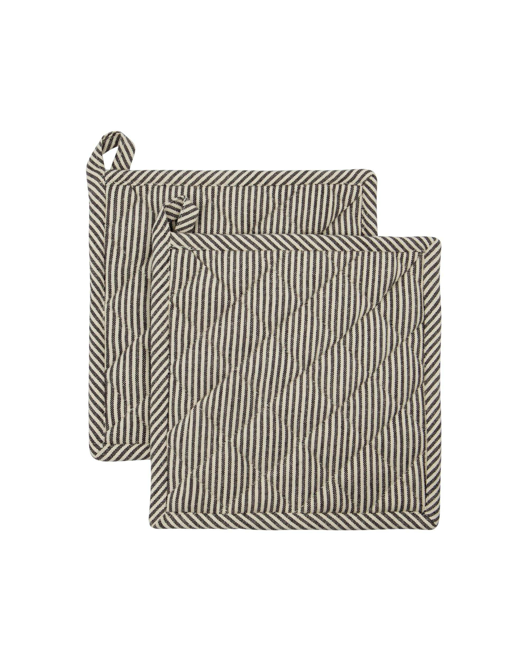 Geef je keuken een stijlvolle upgrade met deze set van twee Pannenlappen Chef in donker grijs. Het tijdloze, gestreepte motief en de mooie, kwalitatieve afwerking brengen direct sfeer en comfort in je dagelijkse kookmomenten. De pannenlappen zijn gemaakt van stevig 100% katoen en voelen lekker zacht aan, waardoor je veilig en met een goed gevoel aan de slag kan.