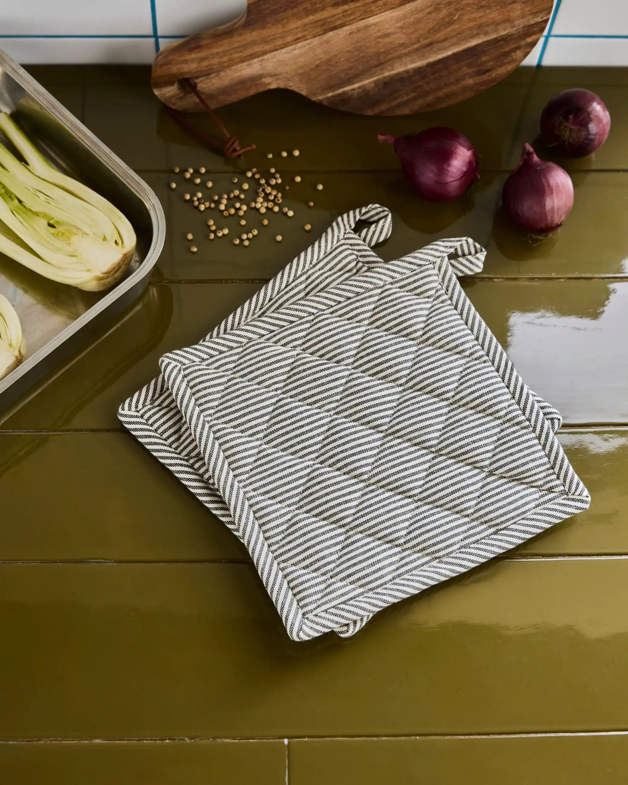 Dankzij de afmetingen van 22.5 x 22.5 cm bieden deze pannenlappen optimale bescherming tegen hitte. Ze zijn gewatteerd voor extra isolatie en liggen prettig in de hand. Gebruik ze voor het verplaatsen van hete pannen, als stijlvolle onderzetter op tafel, of hang ze als decoratief accent in je keuken om altijd bij de hand te hebben.
