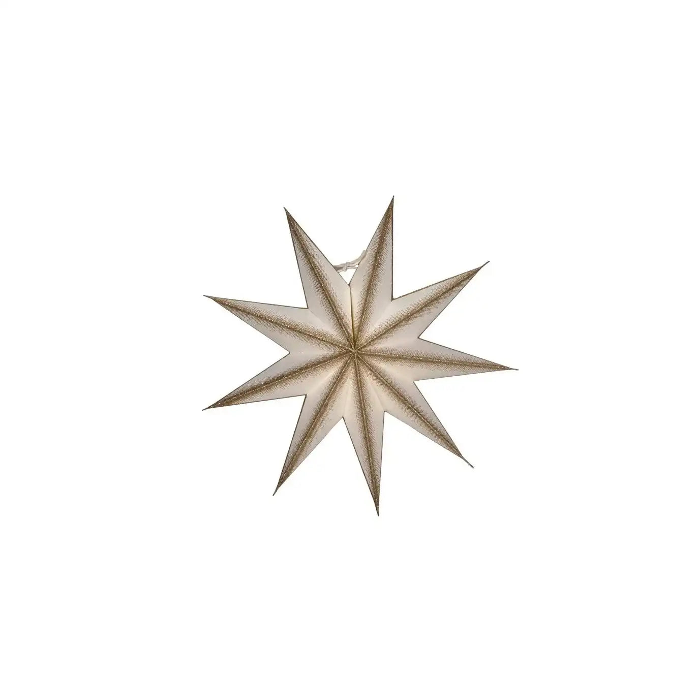 De handgemaakte ster is gemaakt van stevig papier met fijne kunststof details. De gebroken witte basis wordt elegant aangezet met champagnekleurige glitter, waardoor het licht prachtig wordt weerkaatst. Met een diameter van 30 cm en een breedte van 10,5 cm komt ze mooi tot haar recht voor het raam of aan de muur.