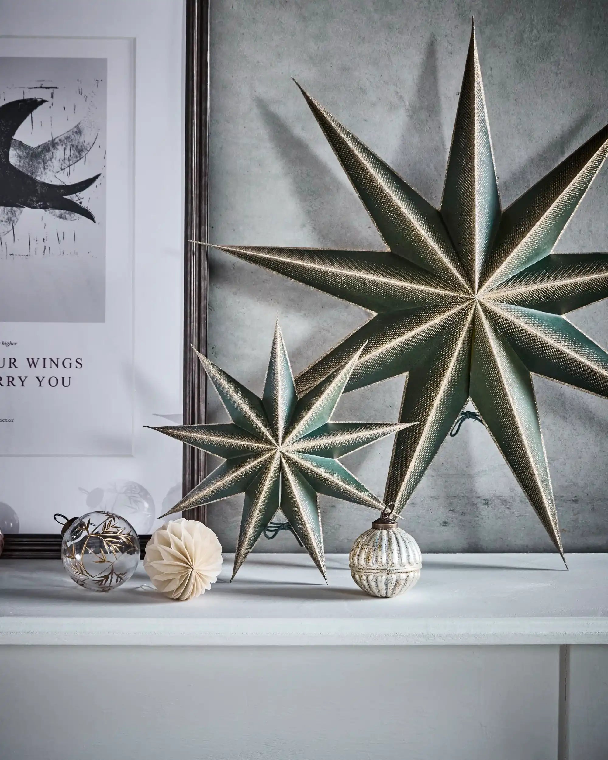 Een winteravond wordt nét iets sfeervoller met deze verfijnde papieren ster. Het diepe groen in combinatie met subtiele champagneglitters brengt warmte en glinstering in elke ruimte. Als solodecoratie boven je eettafel of als onderdeel van een feestelijke compositie: deze ster valt op zonder te overdrijven.