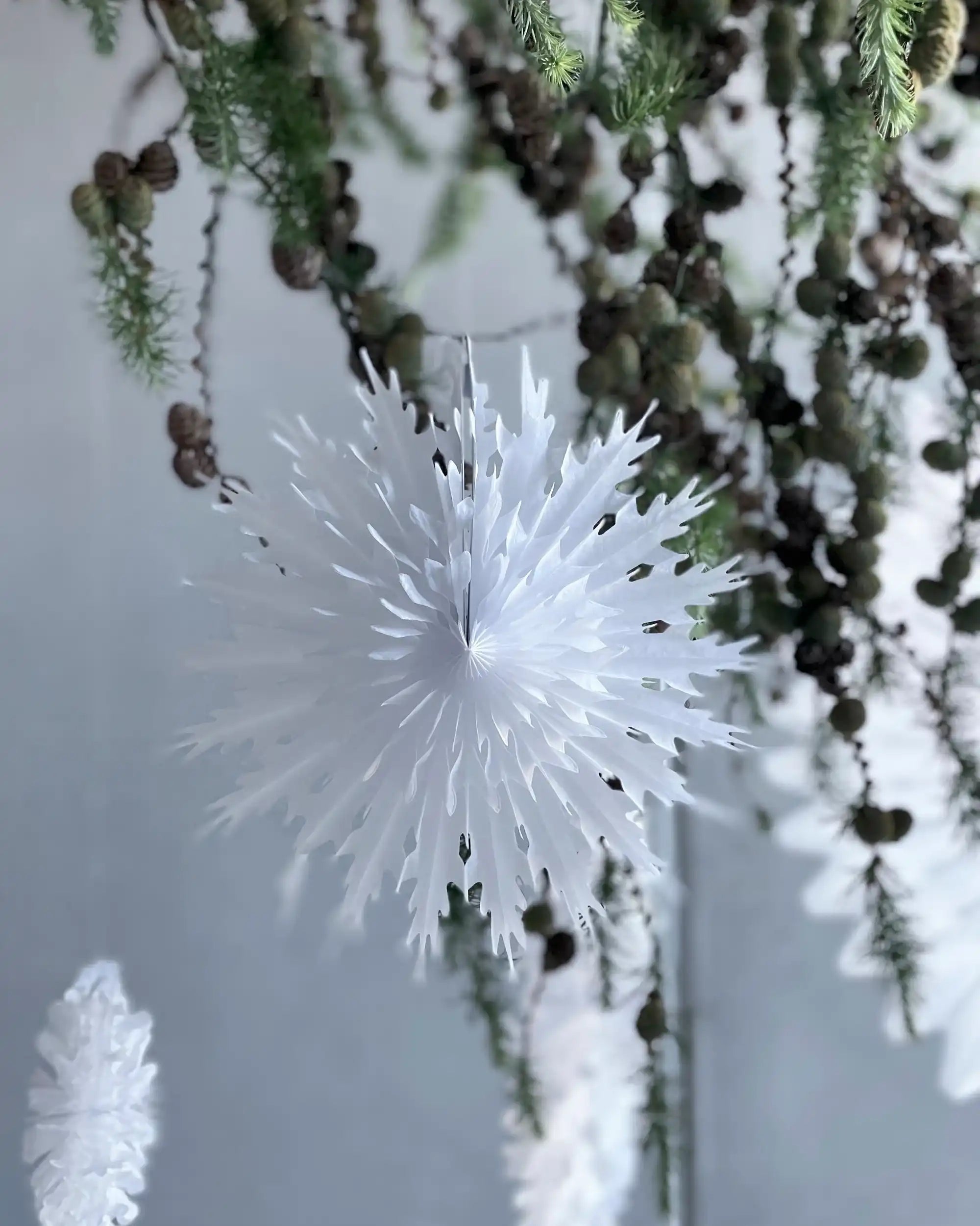 De waaier is gemaakt van stevig papier en voorzien van een handige ophanglus, waardoor je hem eenvoudig kunt plaatsen én hergebruiken. Of je nu je kerstdecoratie net wat meer diepte wilt geven of behoefte hebt aan een rustige, stijlvolle aankleding voor een etentje of verjaardag – deze papieren waaier voelt in elk seizoen passend.