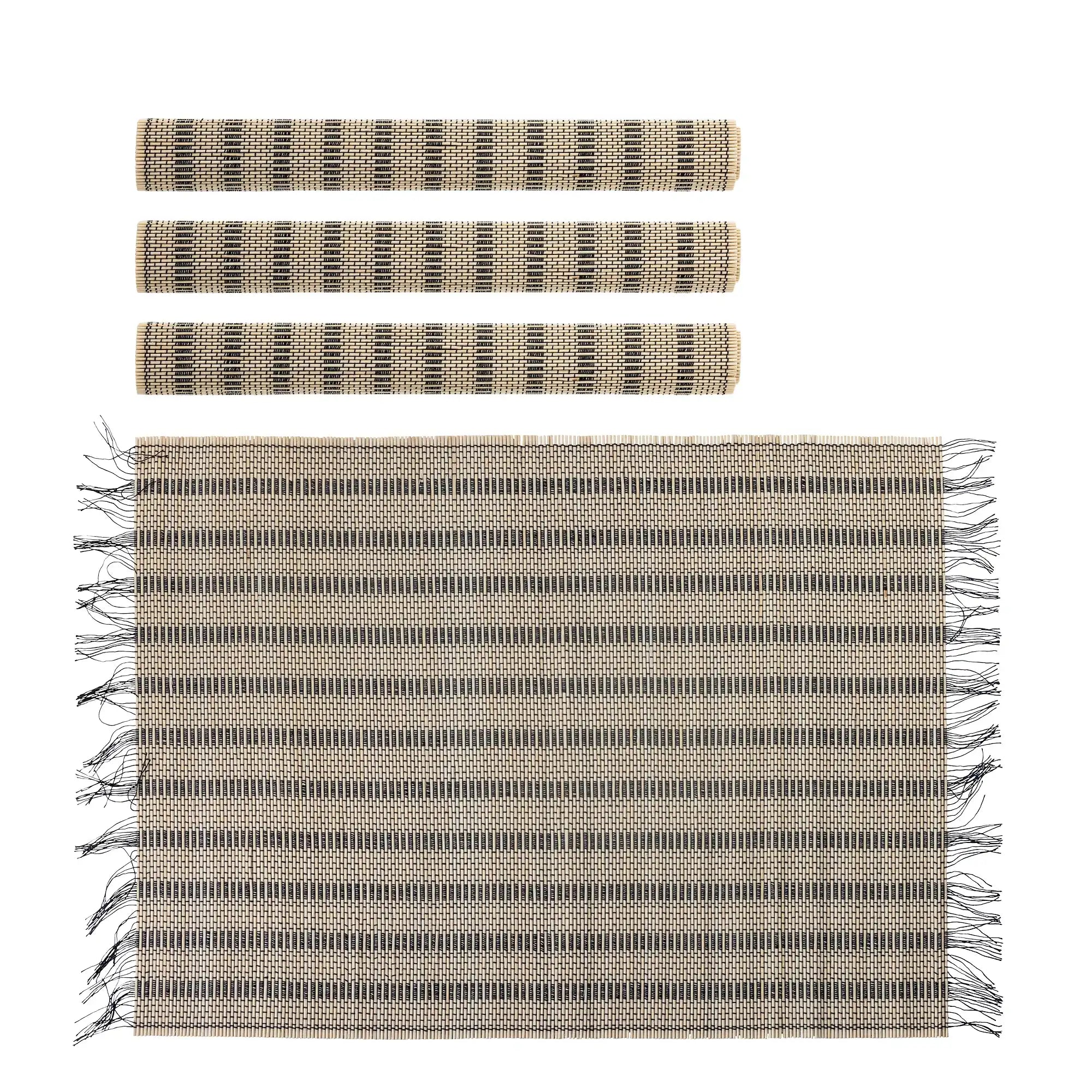 Details & materiaal: De Mendo placemats zijn vervaardigd uit natuurlijk bamboe, slim verweven met zwarte draden voor een modern accent. Dankzij hun royale formaat van 45 x 45 cm beschermen ze je tafeloppervlak optimaal tegen hitte en vlekken. De charmante franjes aan de randen zorgen voor een speels detail, zonder aan verfijning in te boeten.