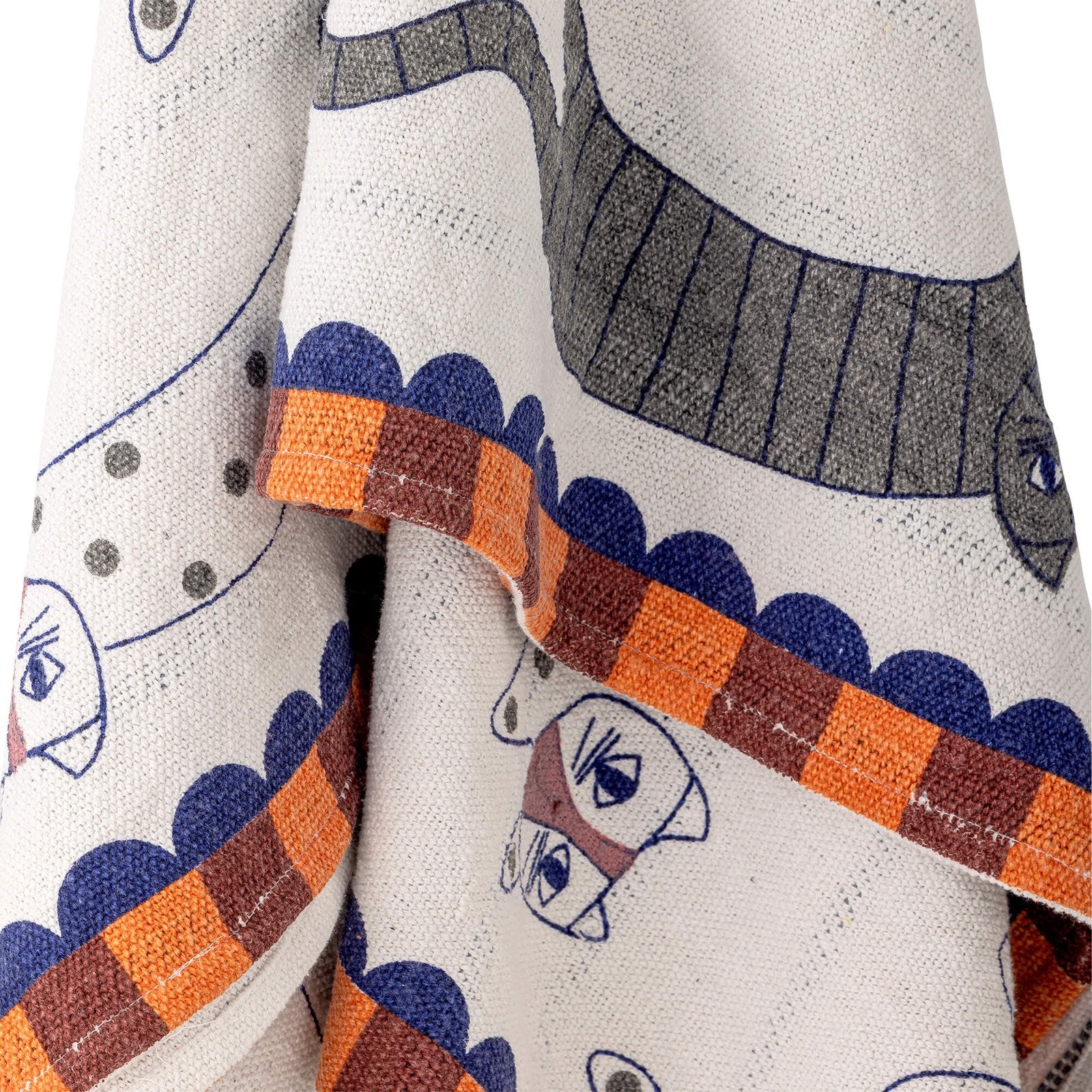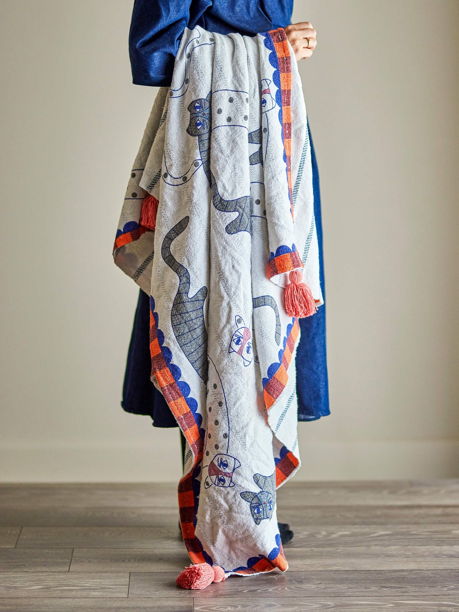 Details & materiaal: Gemaakt van gerecycled katoen voelt de plaid licht, soepel en comfortabel aan, prettig voor dagelijks gebruik. De ene zijde toont een speels kattenprint, de andere zijde geweven strepen; zo wissel je eenvoudig van sfeer. Langs de randen loopt een diepe oranje bies, met blauwe scallopranden en fijne bruine ruitdetails, en in elke hoek een kwastje. De kleuren zijn zacht en ingetogen, waardoor de plaid mooi mengt met verschillende materialen en houttinten. Kleur: multi. Materiaal: gerecycled katoen. Merk: Bloomingville.